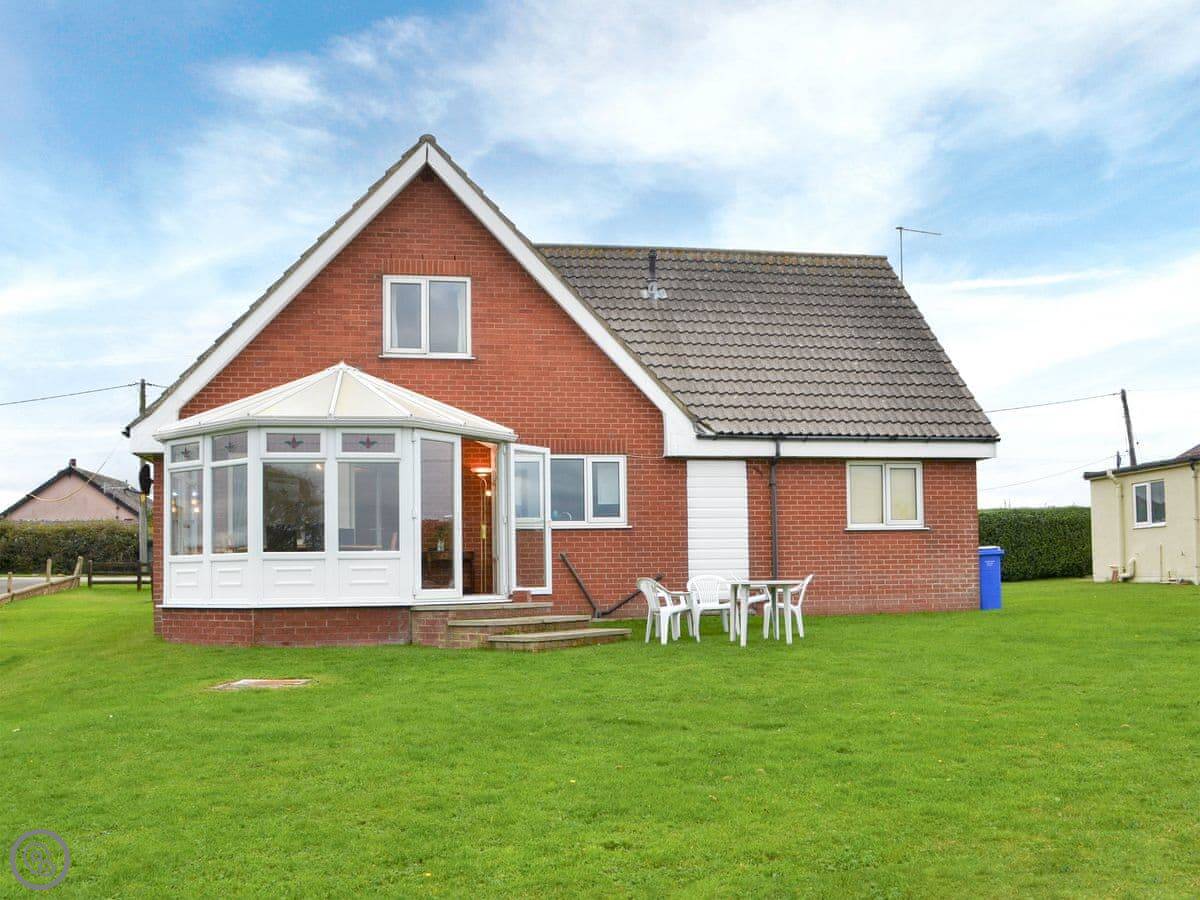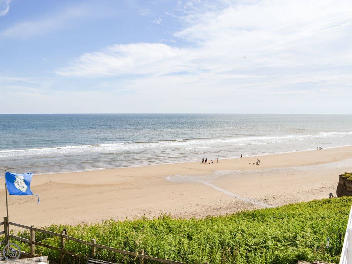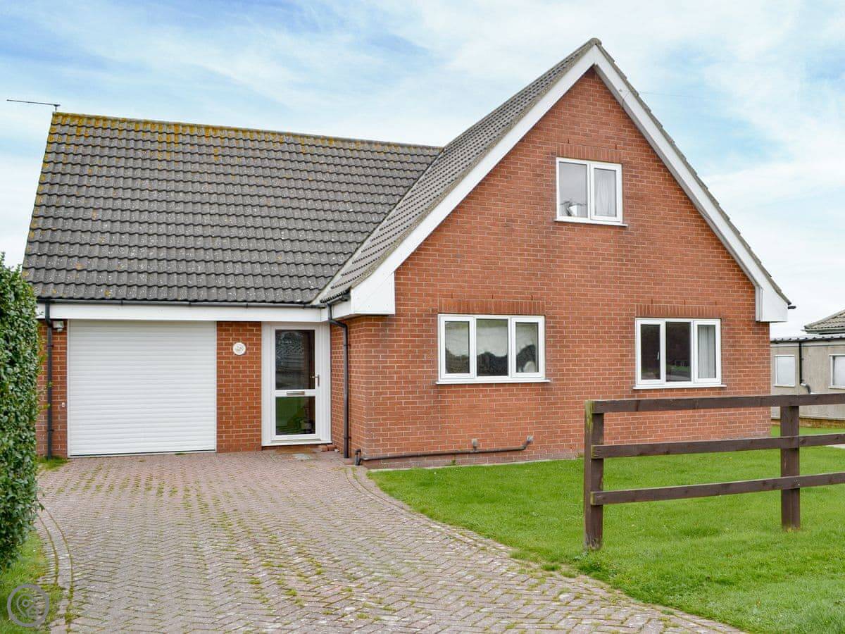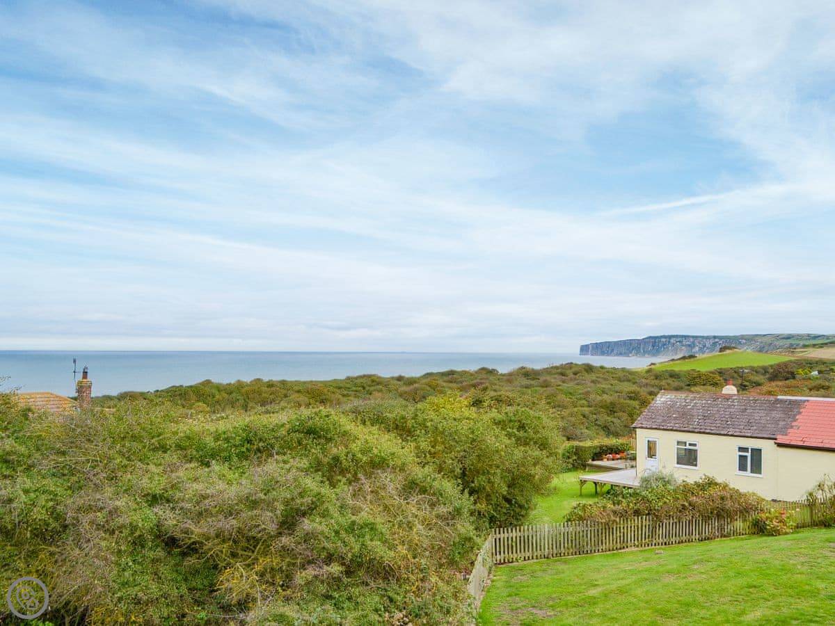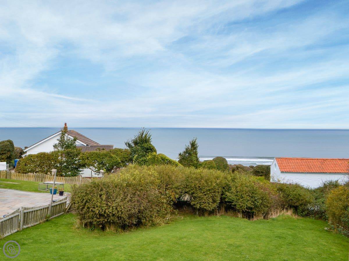 The house is detached. You've got parking right there. There's a lawn and patio area around it. The main thing is the view. You can see right along Filey Bay from the front. The beach is about a five minute walk down the lane.