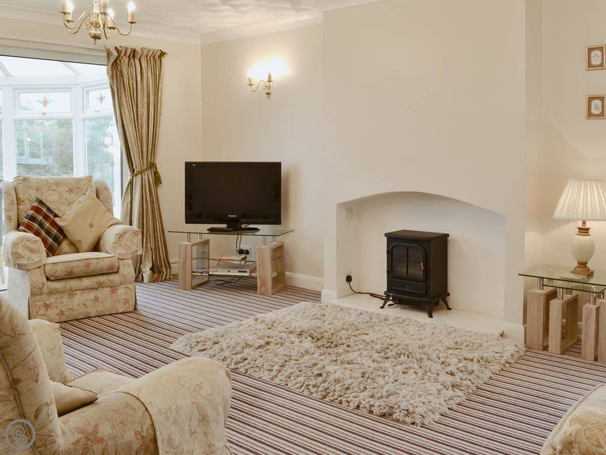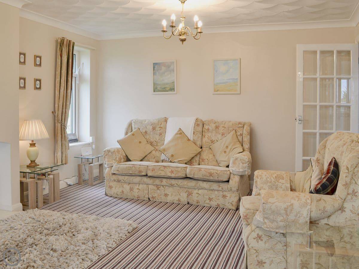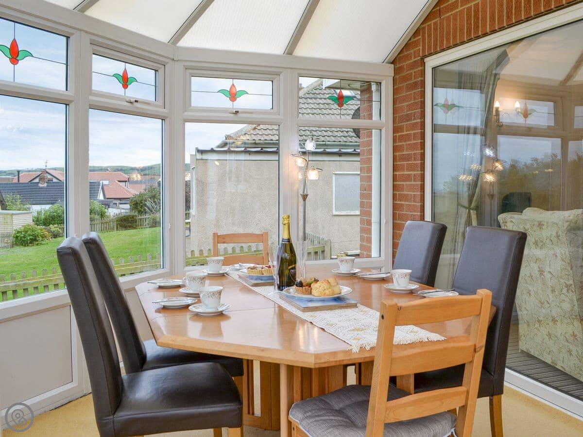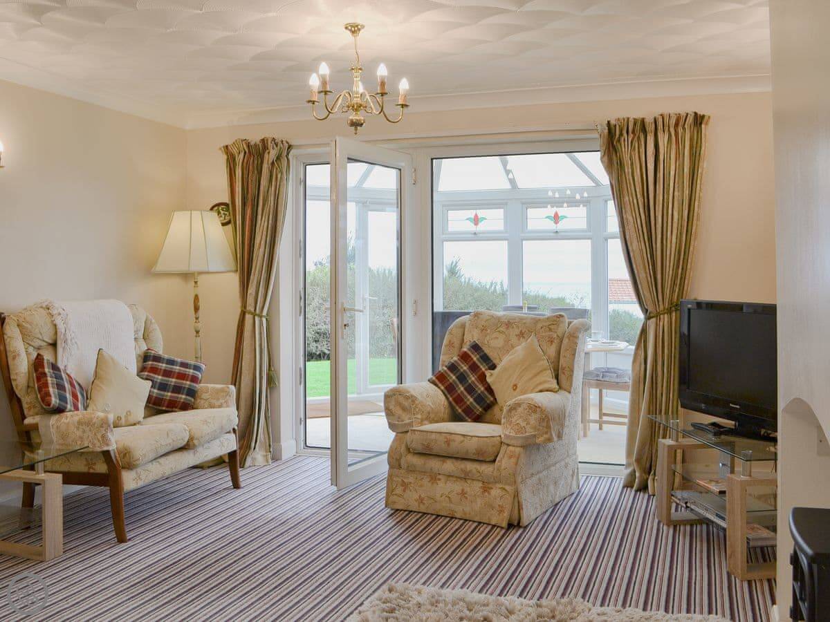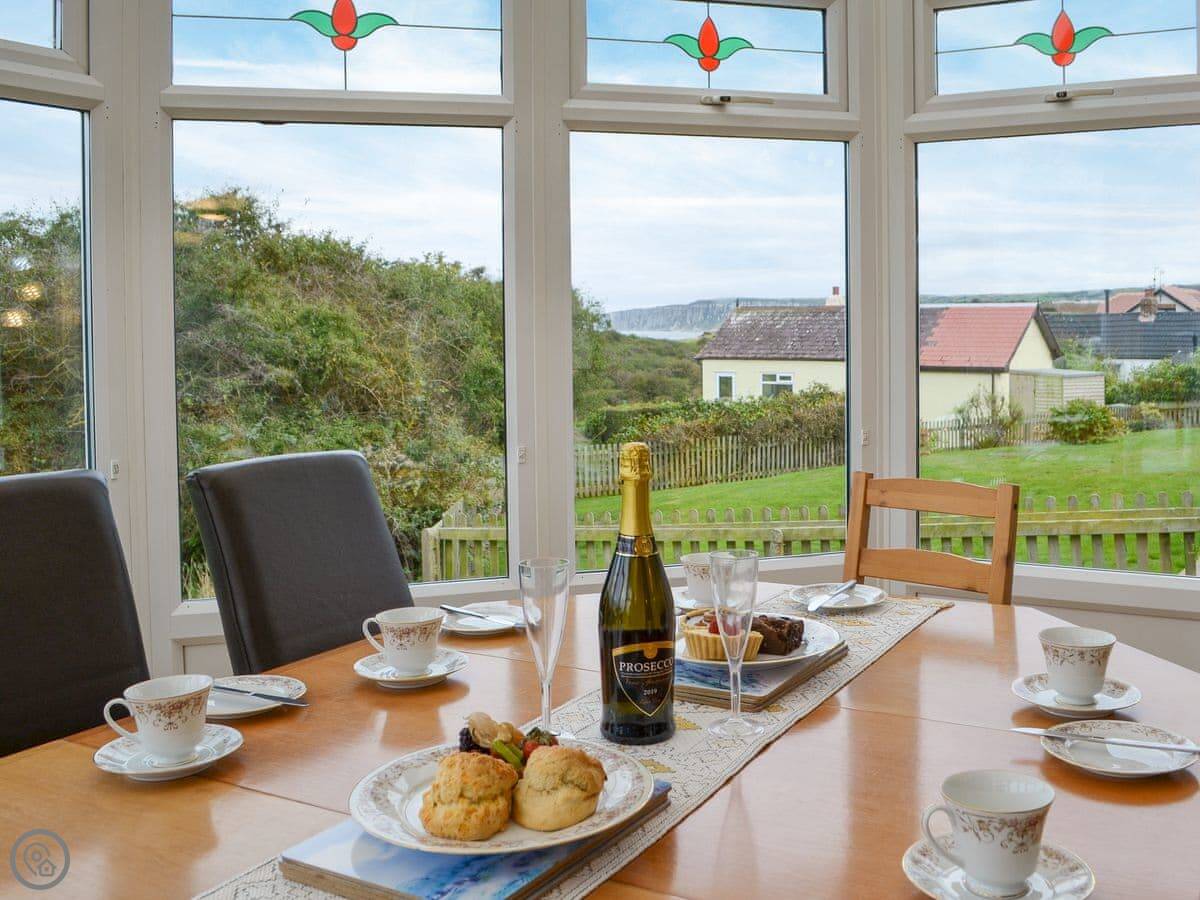 The house is detached. You've got parking right there. There's a lawn and patio area around it. The main thing is the view. You can see right along Filey Bay from the front. The beach is about a five minute walk down the lane.