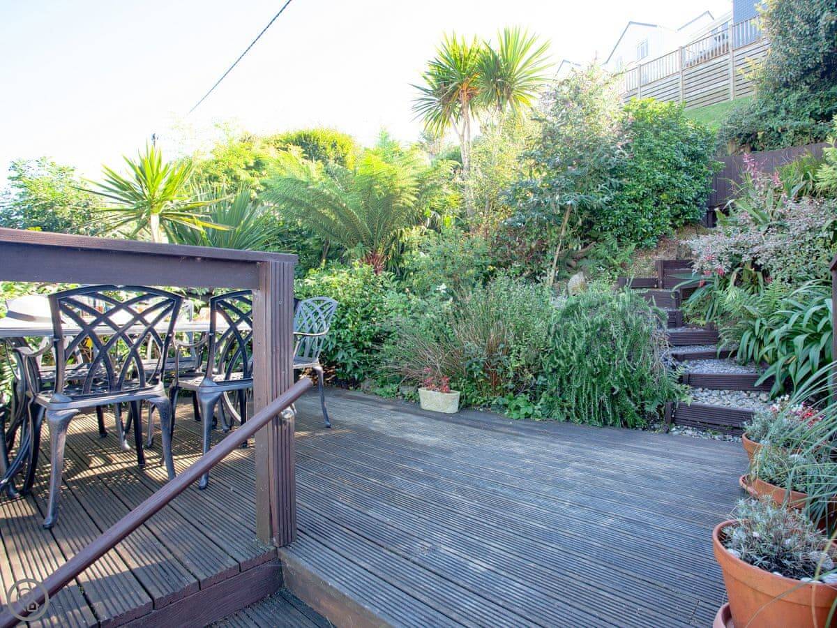 The garden is up the hill behind the house. It's on different levels with a patio and a deck. You get to it from inside, from the second-floor landing. There are steps between the levels. You can sit up there with your drink and look at the view.