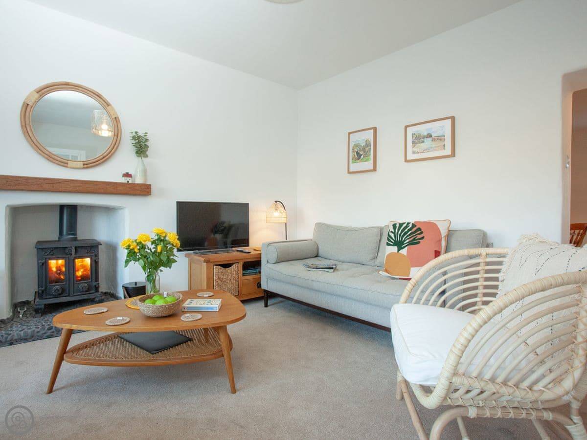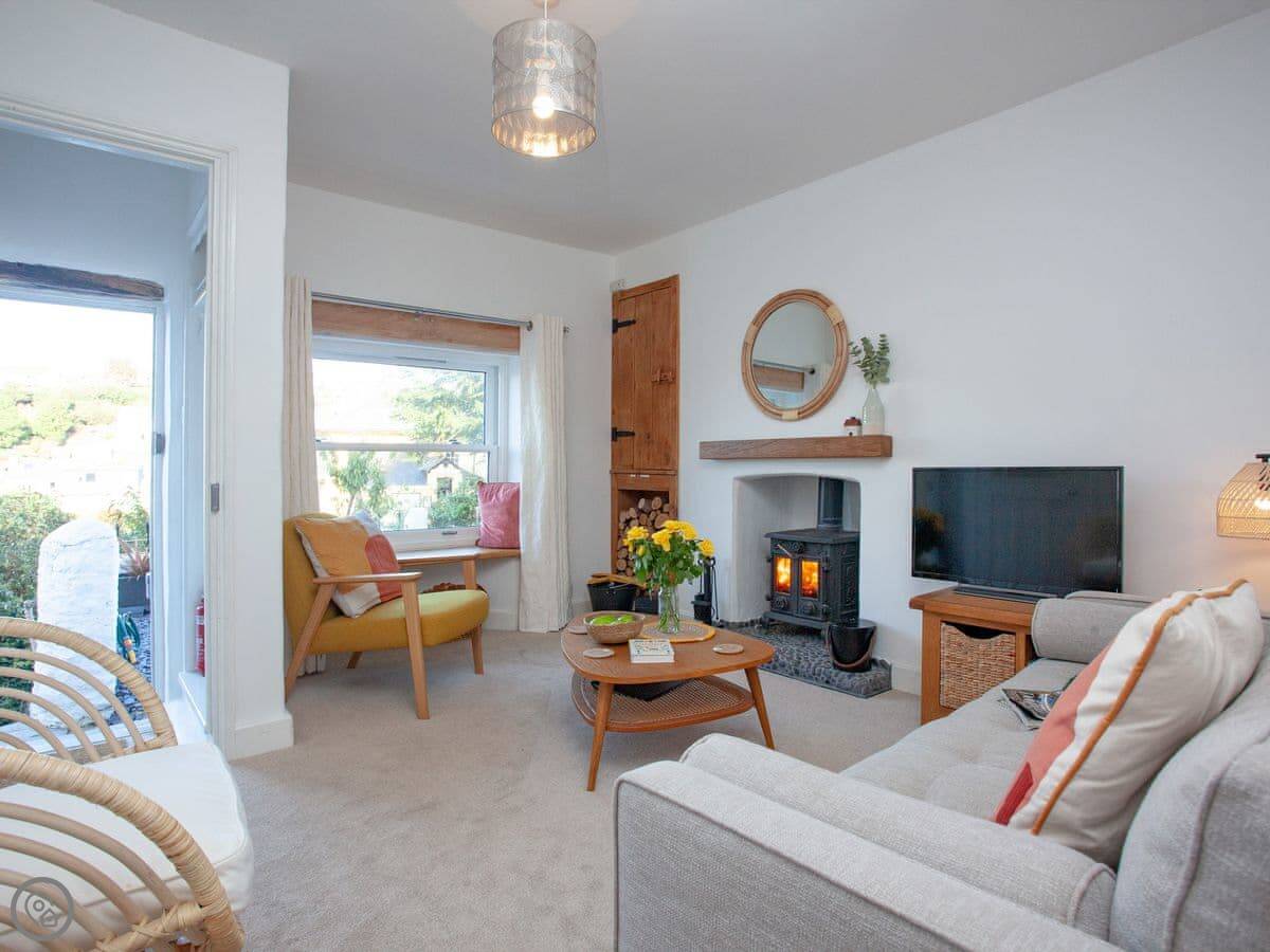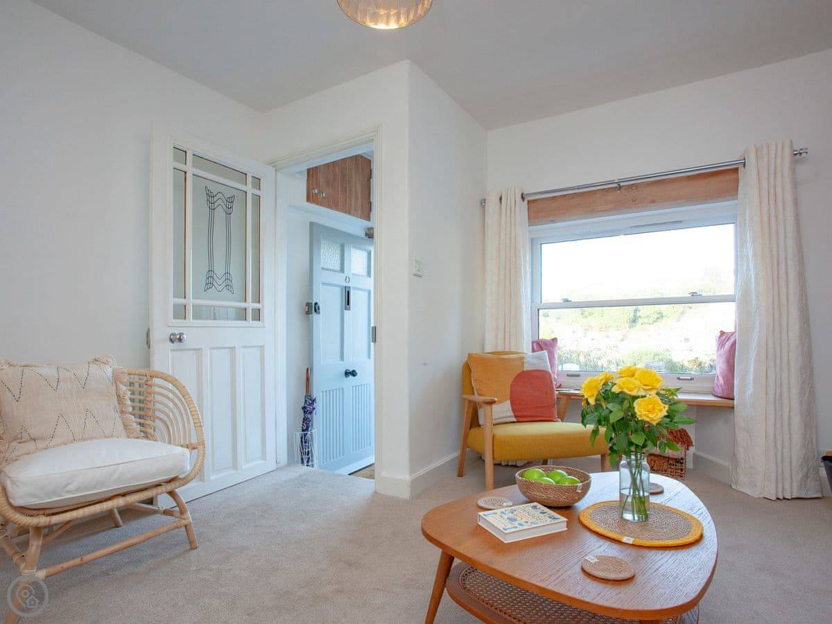 The Lookout 43 is in Brixham. It’s one of a row of cottages on a steep hill so you do have to go up some steps from the road to get to it. The front door opens into the living room.