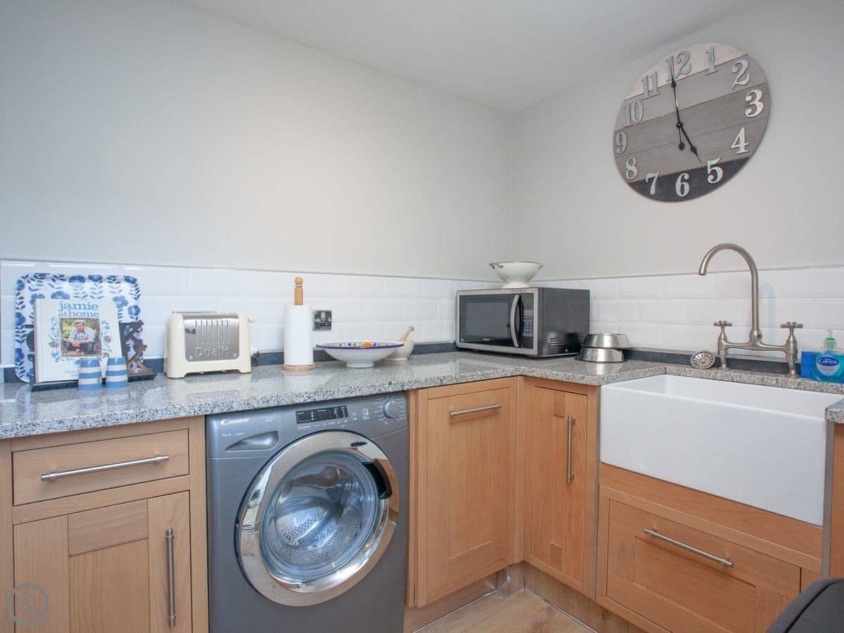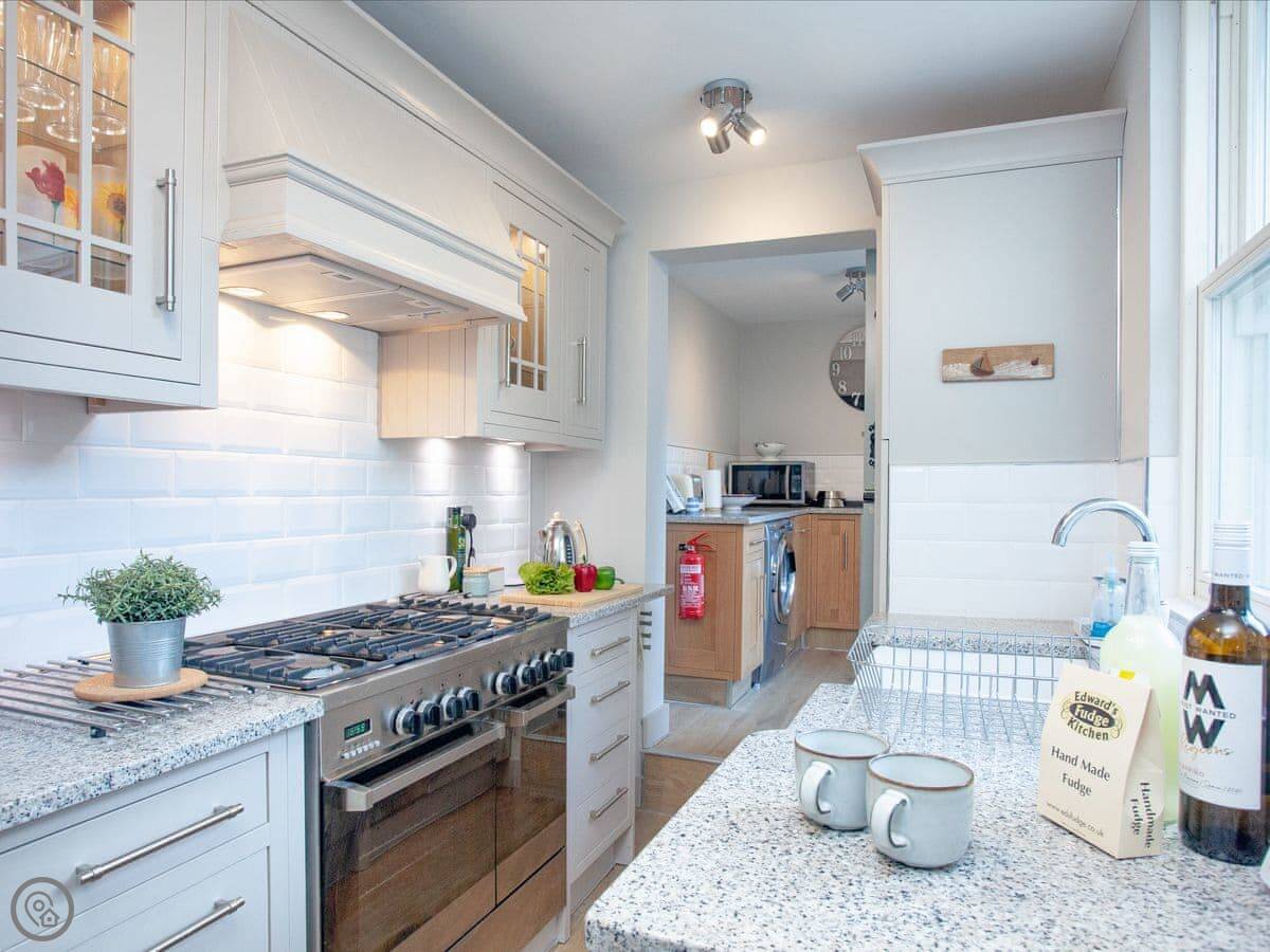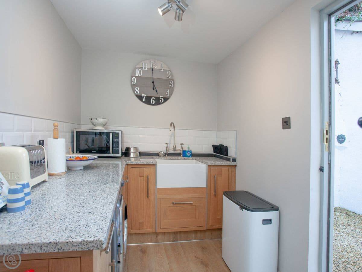 The living room has a wood burner. There’s a window seat to look out from. The kitchen is through the back and has what you need. There’s a utility room with a washing machine and a door out to a small courtyard garden at the rear. You can sit out there or at the front.