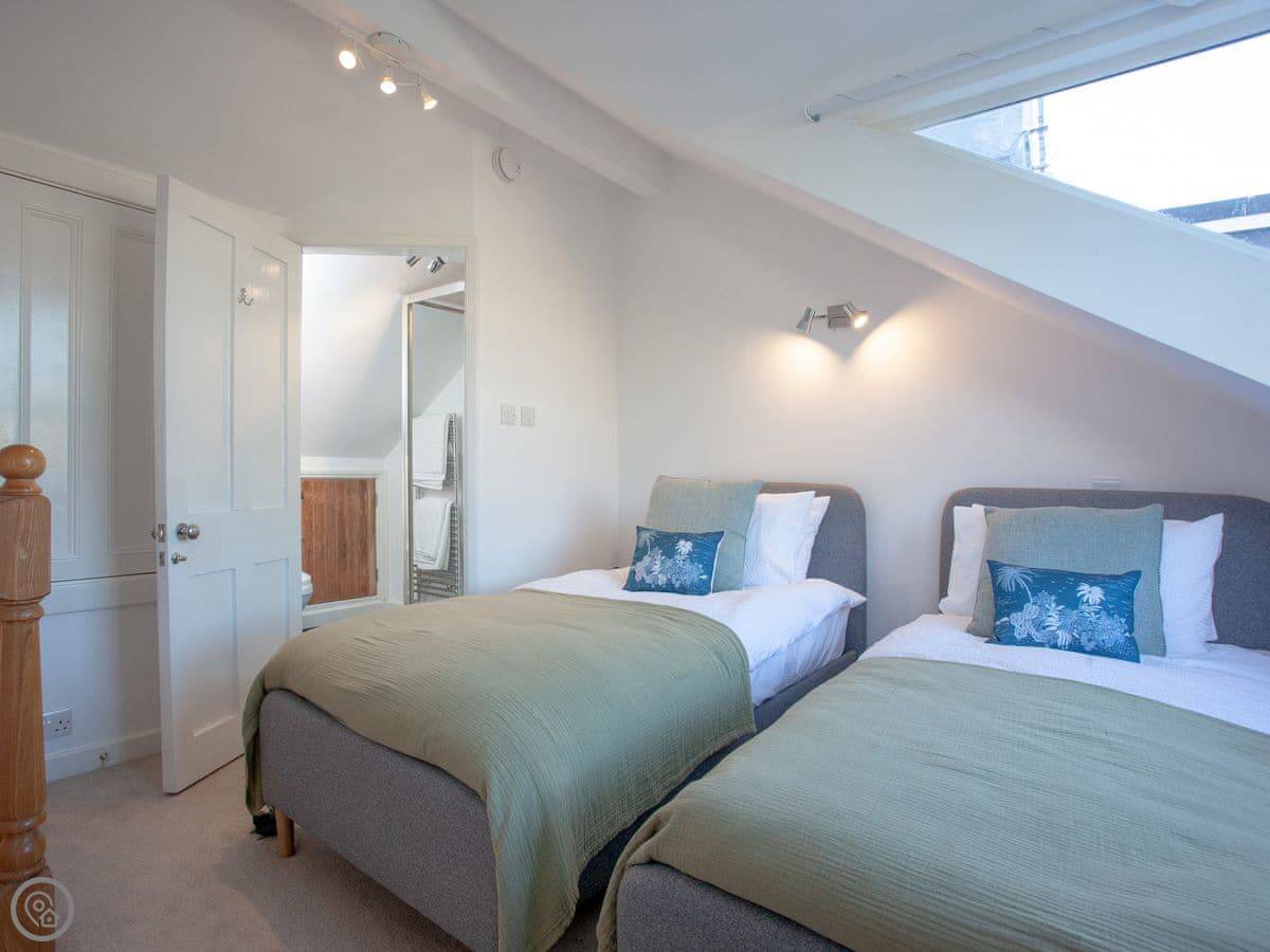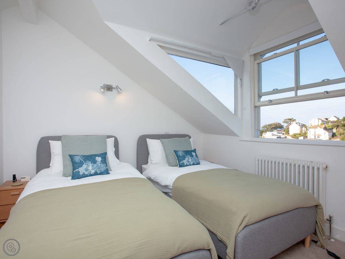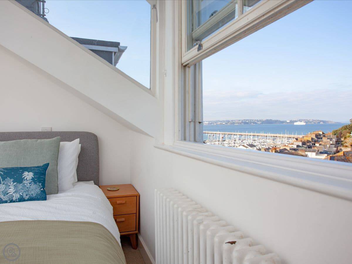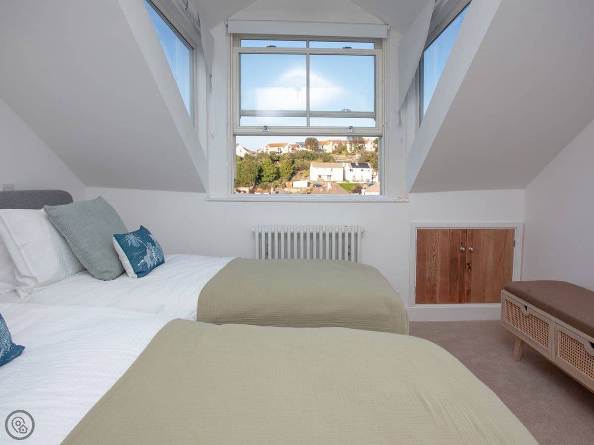 It sleeps four. Two bedrooms and two bathrooms, which is handy. The main bedroom is on the first floor with a king size bed. The twin room is up another flight of stairs in the eaves. It has its own shower room. Both have a view of the bay.