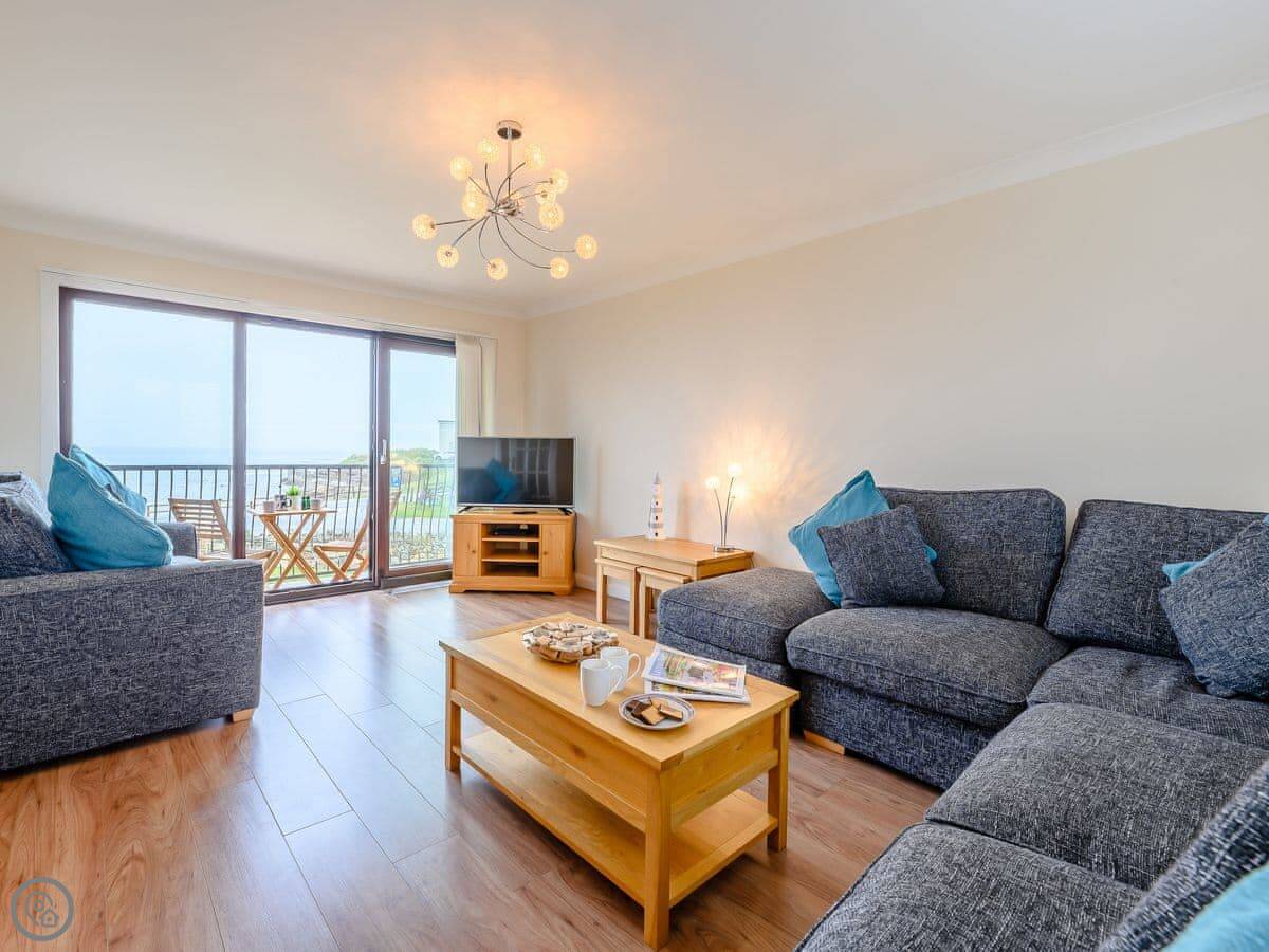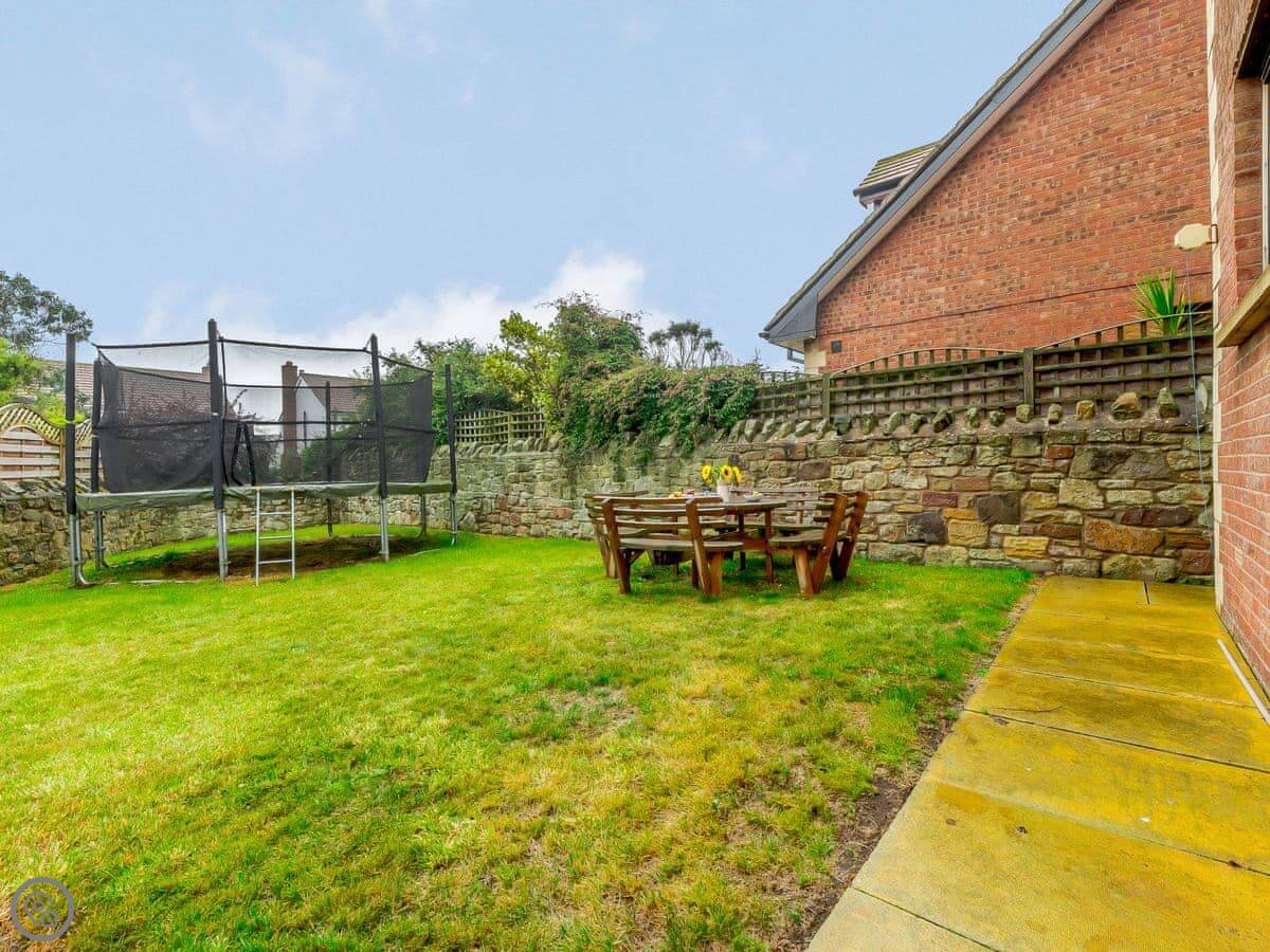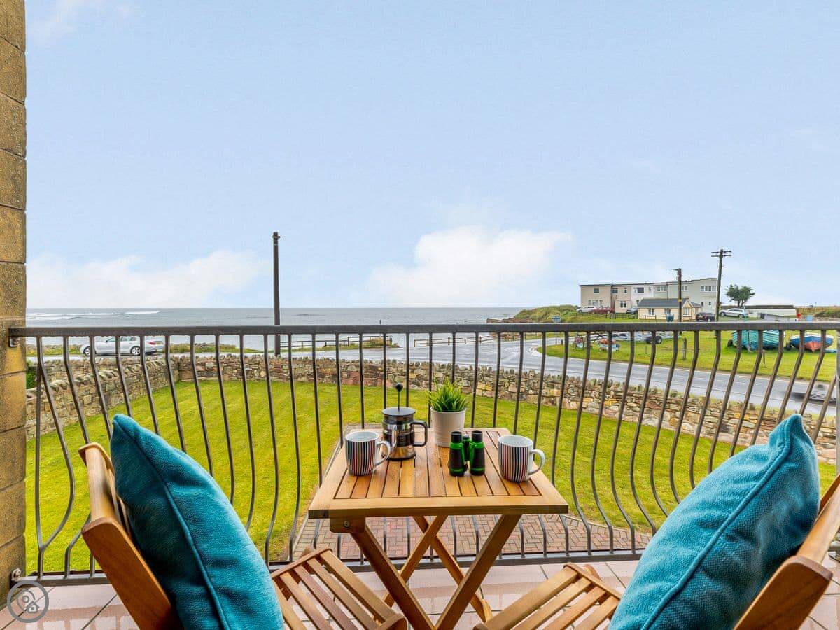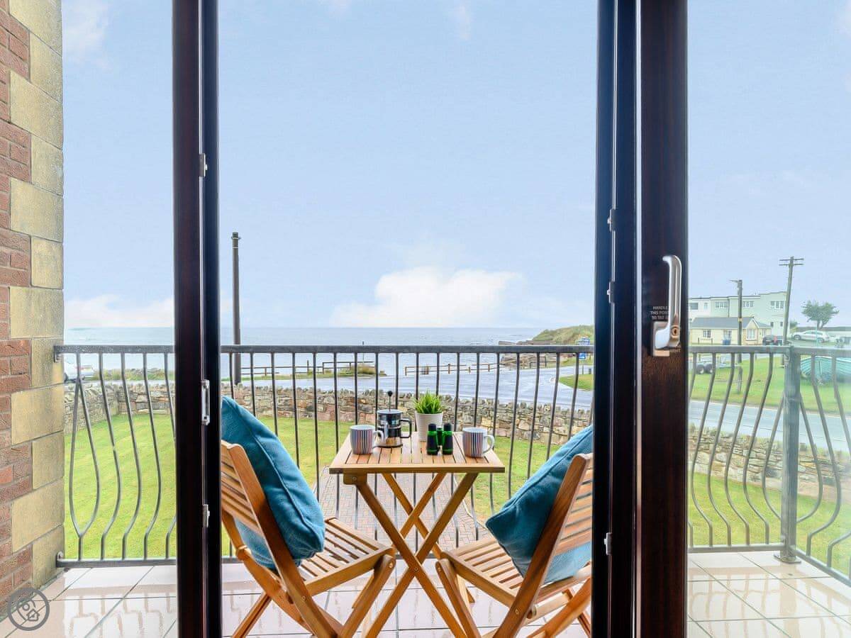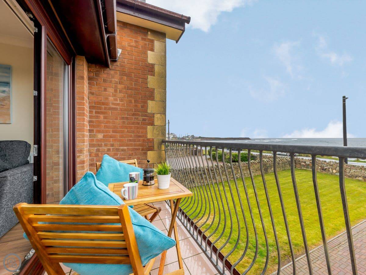You get gardens at the front and back. Both are enclosed. There's a swing set in the front one for kids. The main living room is upstairs. It’s got a balcony with a full view of the sea. The stairs inside are fine.