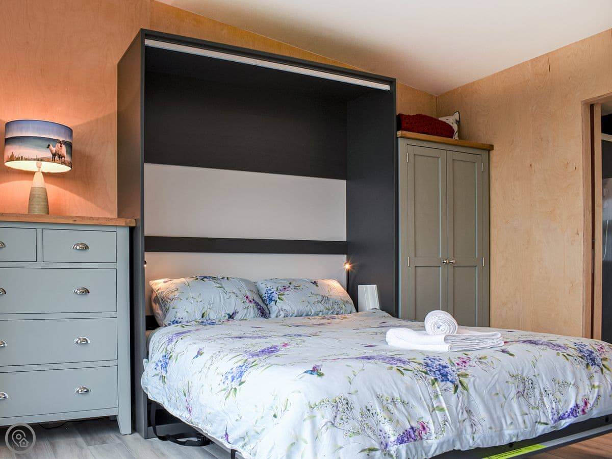 Inside, it's one open room. It's a studio, so the double bed is at one end. The bed can fold up against the wall if you want more floor space during the day. There's a kitchen area with an induction hob, an oven, and a decent fridge-freezer. It's enough for making meals. The shower room is separate, with a walk-in shower.