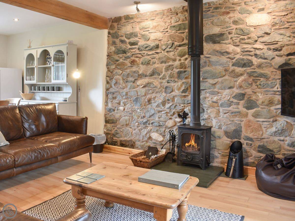 The conversion's been done well. There are exposed stone walls and oak beams. The ground floor is open plan, with the kitchen, dining table and living area all together. It's a good social space. There's a wood burner for the evenings.