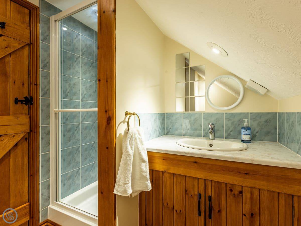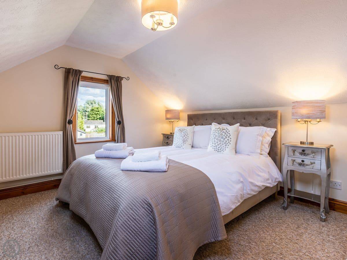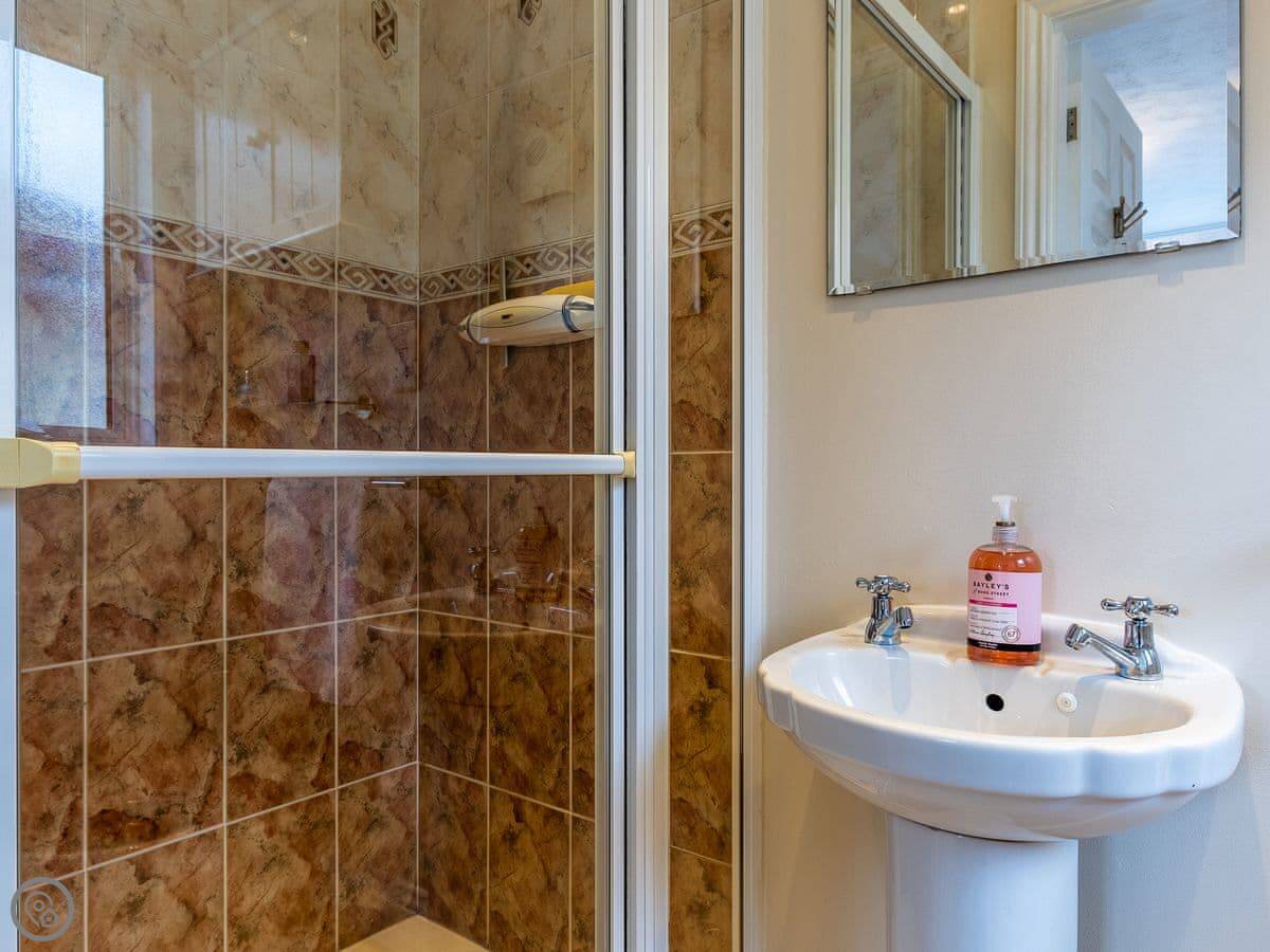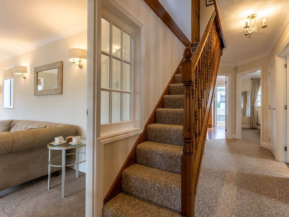 Inside, there’s a large living room and an open-plan kitchen and dining room. Both have French doors that open onto the garden and the decked area. Upstairs, two of the bedrooms are there, along with a shower room. The other two bedrooms and bathrooms are on the ground floor. This can be useful if someone doesn’t want to use the stairs.