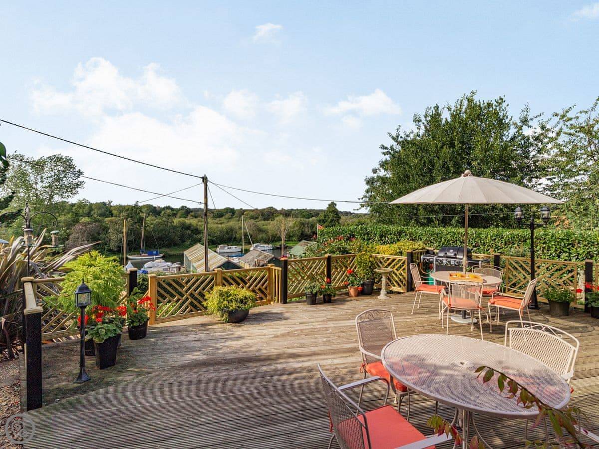River Holme has a magical location with uninterrupted river and countryside views. This is a perfect choice to relax and explore the Norfolk Broads National Park. It is located in the idyllic and very sought after conservation village of Belaugh where the River Bure meanders through the village. This single storey holiday home is elevated and accessed by steps leading up to front door. Decorated and furnished throughout to appeal to discerning guests, there is a living room with Freeview Smart TV and Alexa, the dining area offers commanding river views and a great room to enjoy all year round. There is a well-equipped kitchen with a door leading secluded courtyard area. The outside decked seating area affords commanding views towards the River Bure, where it is almost impossible not to stare fixedly at the River Bure and its waterway activities.