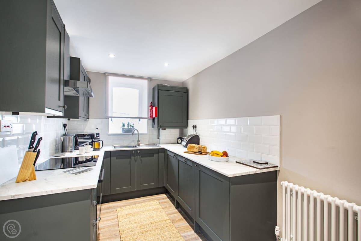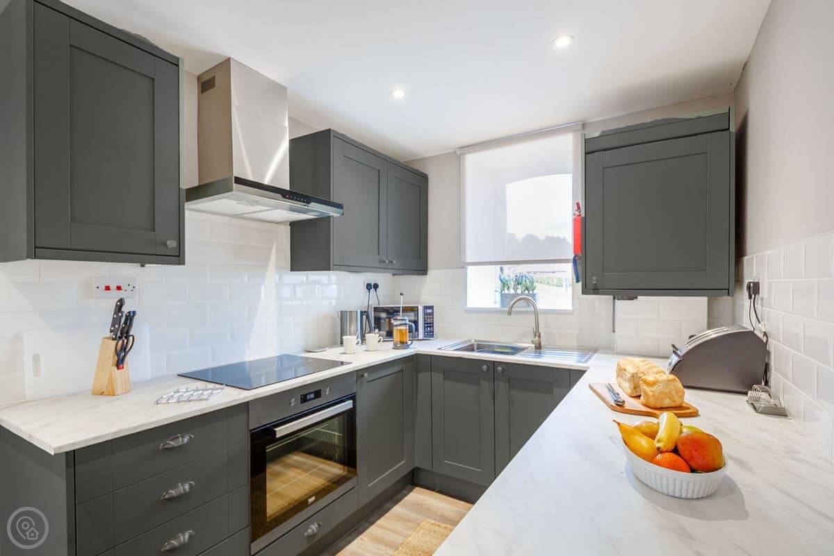 Downstairs is all one space: living room, dining area, and the kitchen. The kitchen has an electric oven and hob, a dishwasher, and a microwave. There's a TV with Freeview.