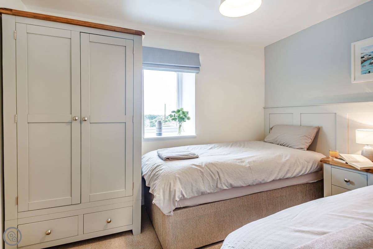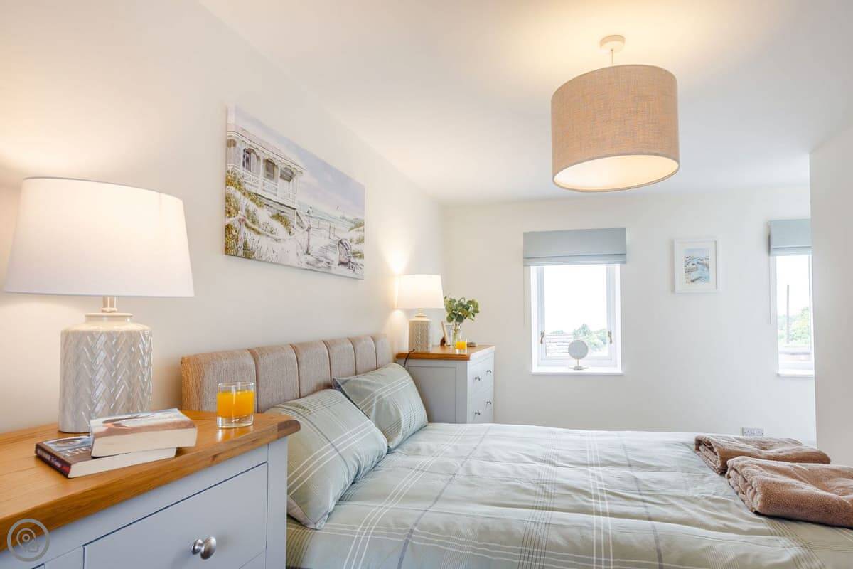 The cottage sleeps four. Two bedrooms, one bathroom. It's got a 4 Star rating. The bedrooms are upstairs, one with a king bed and one with twins. Both have those sea views. The sunsets can be very good.