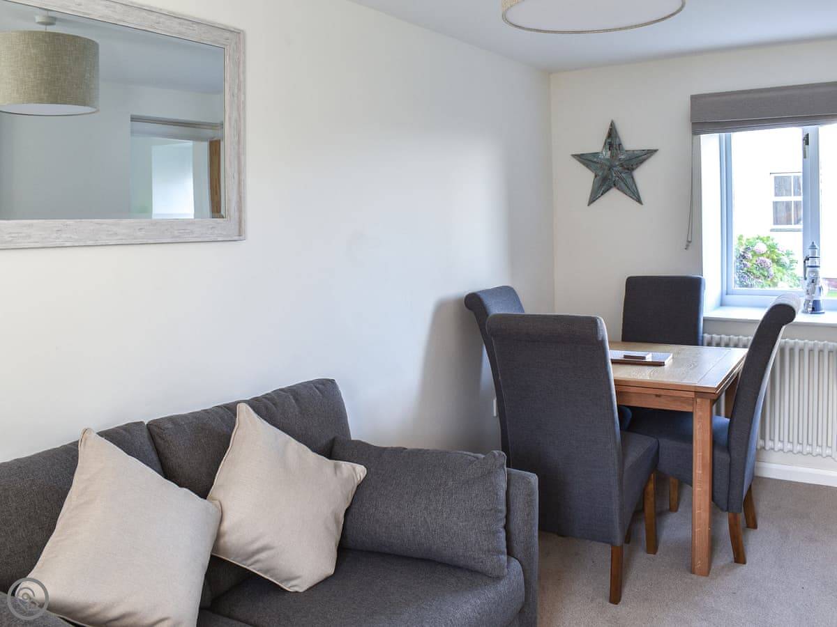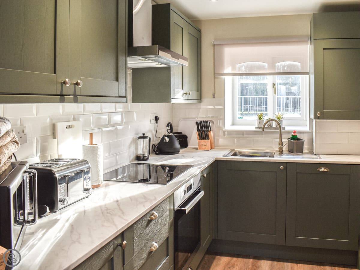 The living area is open plan, with the kitchen and dining bit. It's straightforward. The kitchen has an electric oven and hob, and there's a dishwasher. It's got a 4 Star rating, so it's comfortable and well-equipped.
