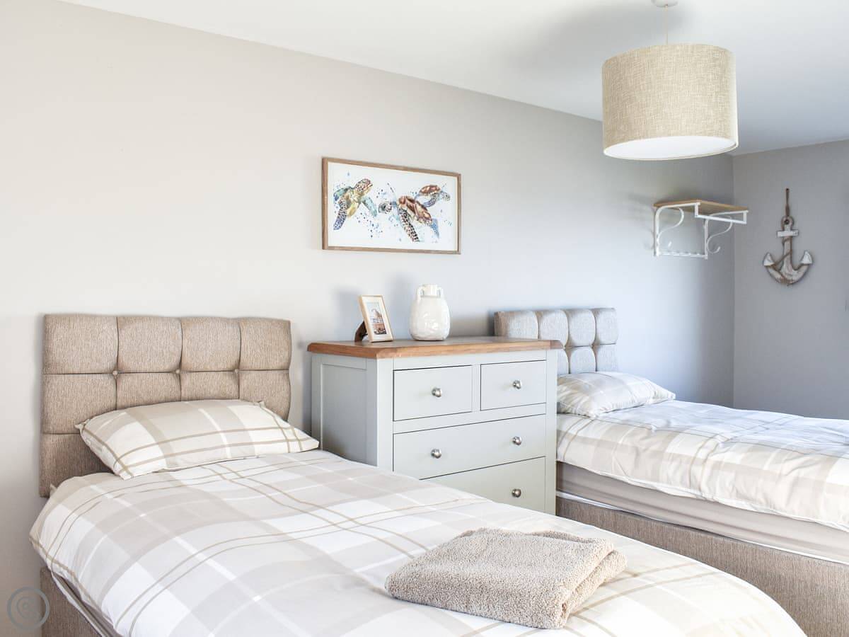 The cottage sleeps six. It's got two proper bedrooms upstairs: one king and one twin. There's also a double sofa bed in the dining room downstairs. One bathroom, with a bath and a walk-in shower.