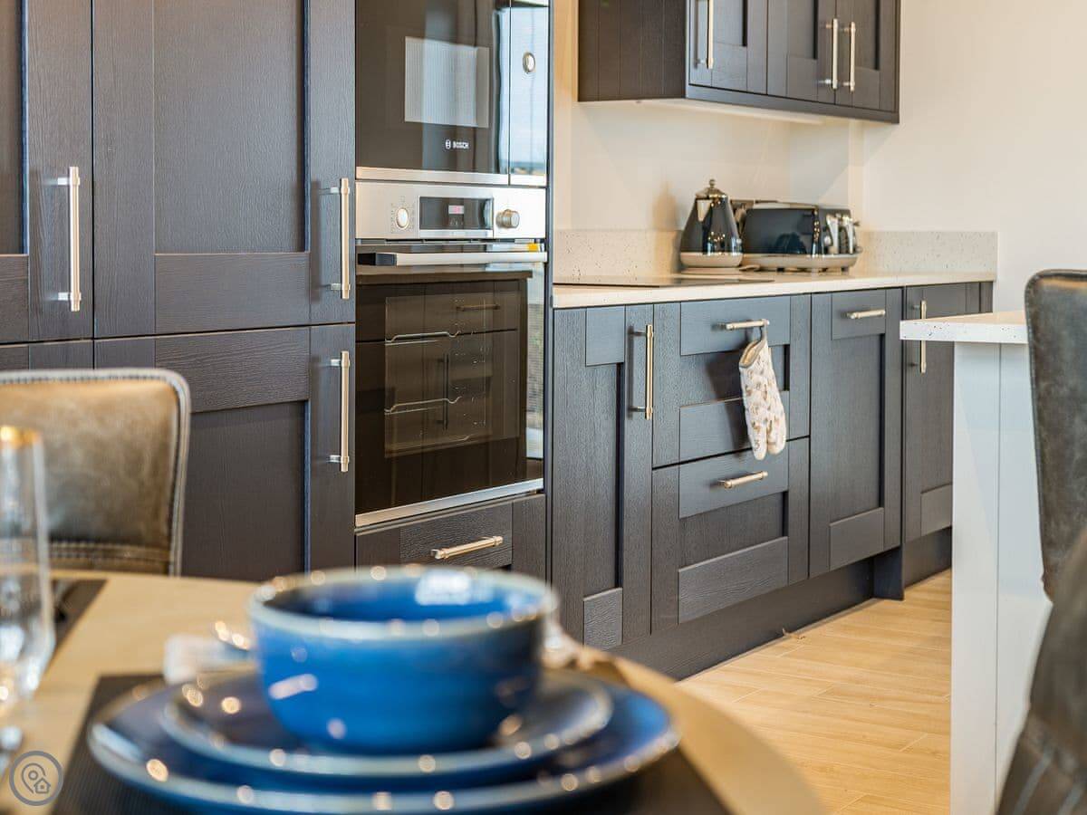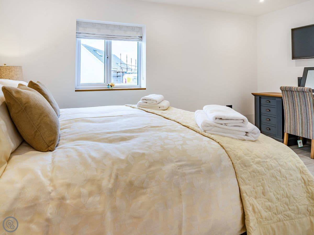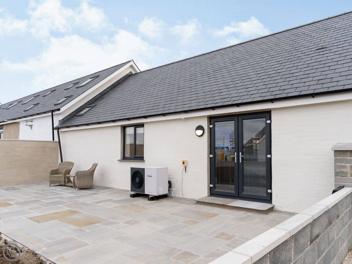 The kitchen and living area is all one open plan room. French doors open onto your own patio and garden, which has a barbecue. You look out over fields towards the sea in the distance.