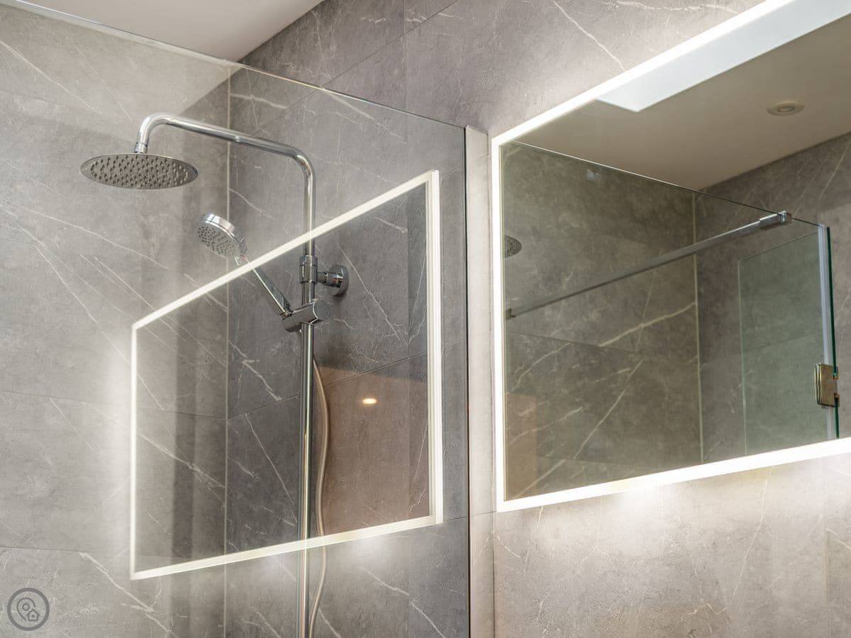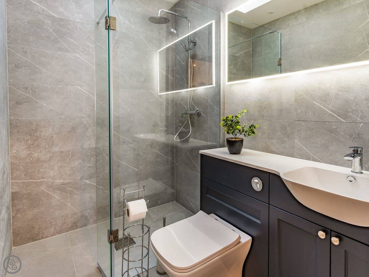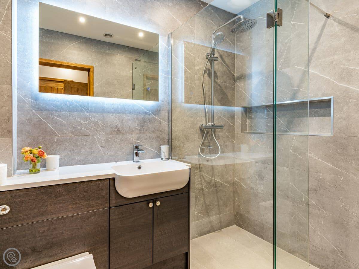 It sleeps four people in two bedrooms, and both bedrooms have their own bathroom. It has a 5 Star rating, which means it's well-equipped and finished to a high standard. Everything is new. There's underfloor heating and air conditioning. Each cottage has its own electric car charger.