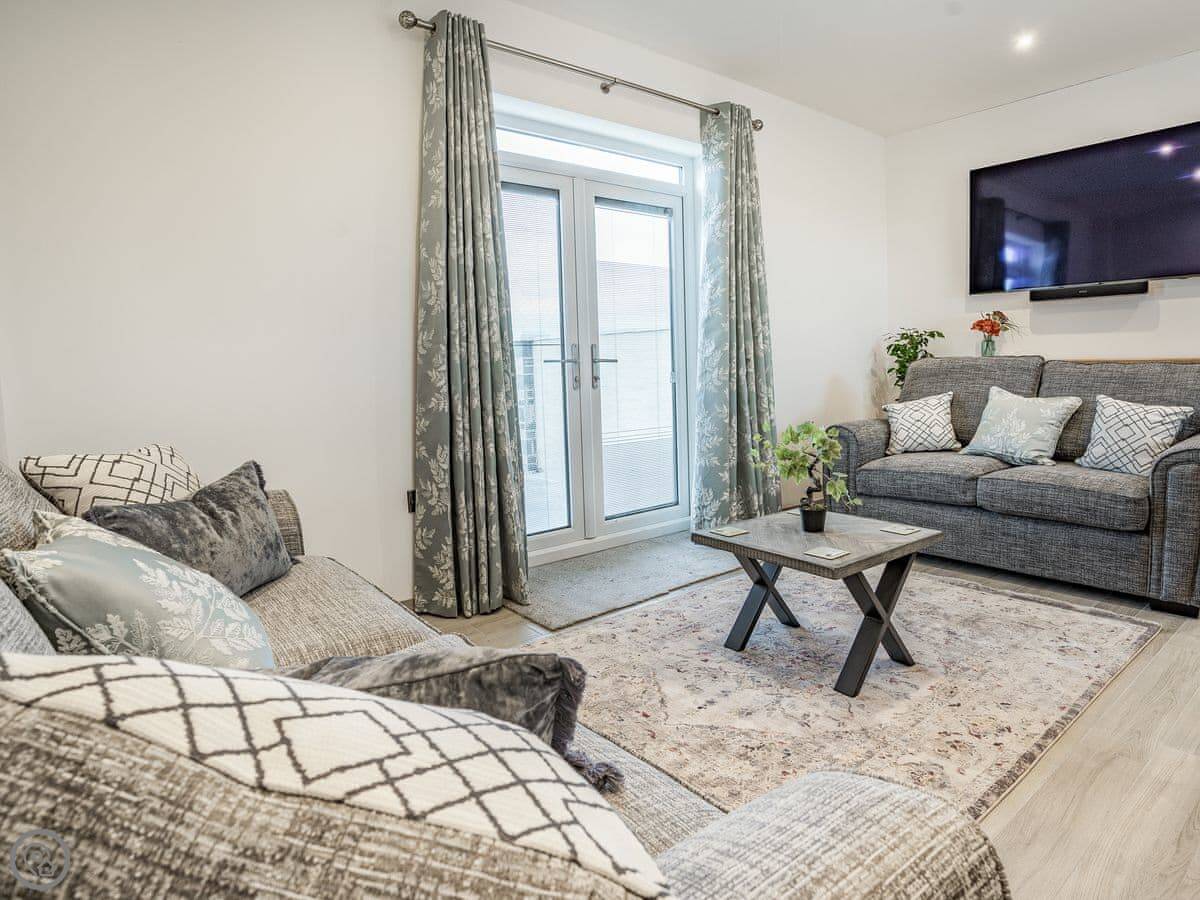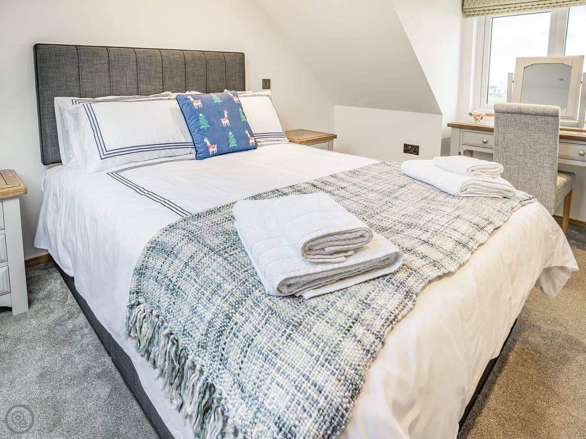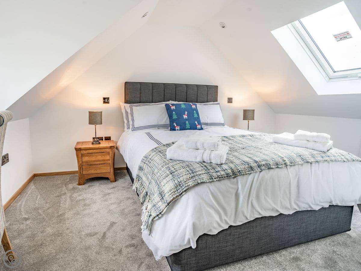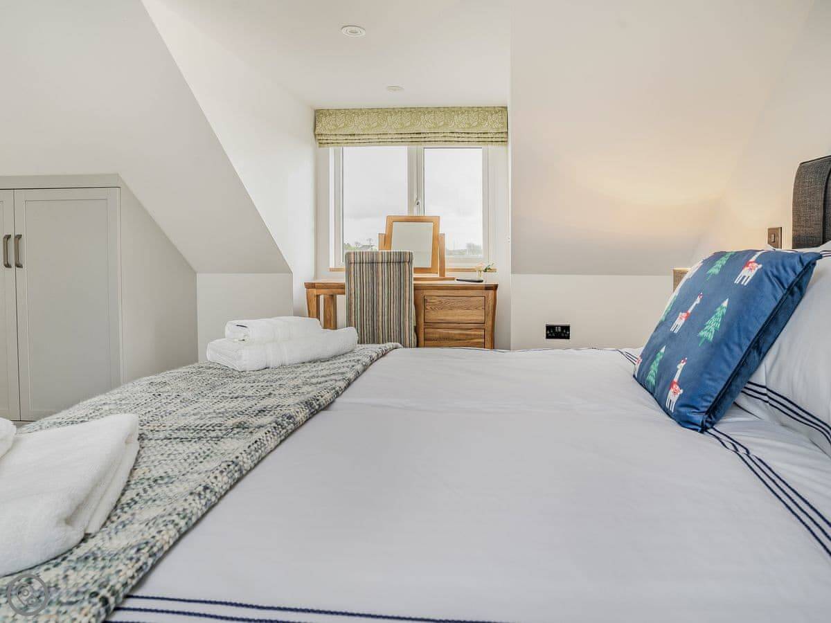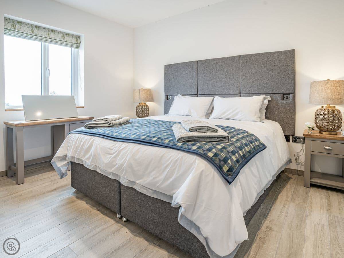 It sleeps six. Three bedrooms, each with its own bathroom. It's got a 5 Star rating, which means it's well-equipped and finished to a high standard. The beds are king-size. The heating is underfloor.