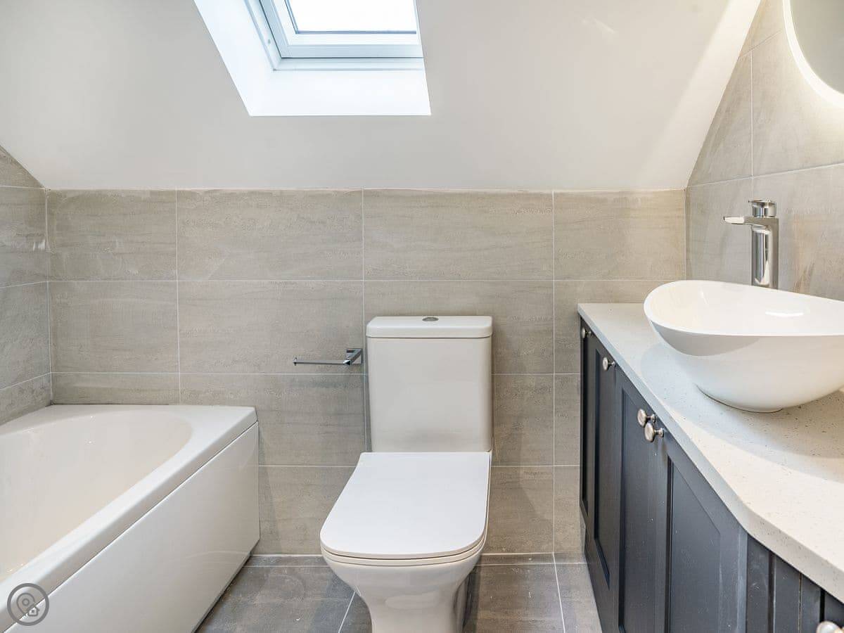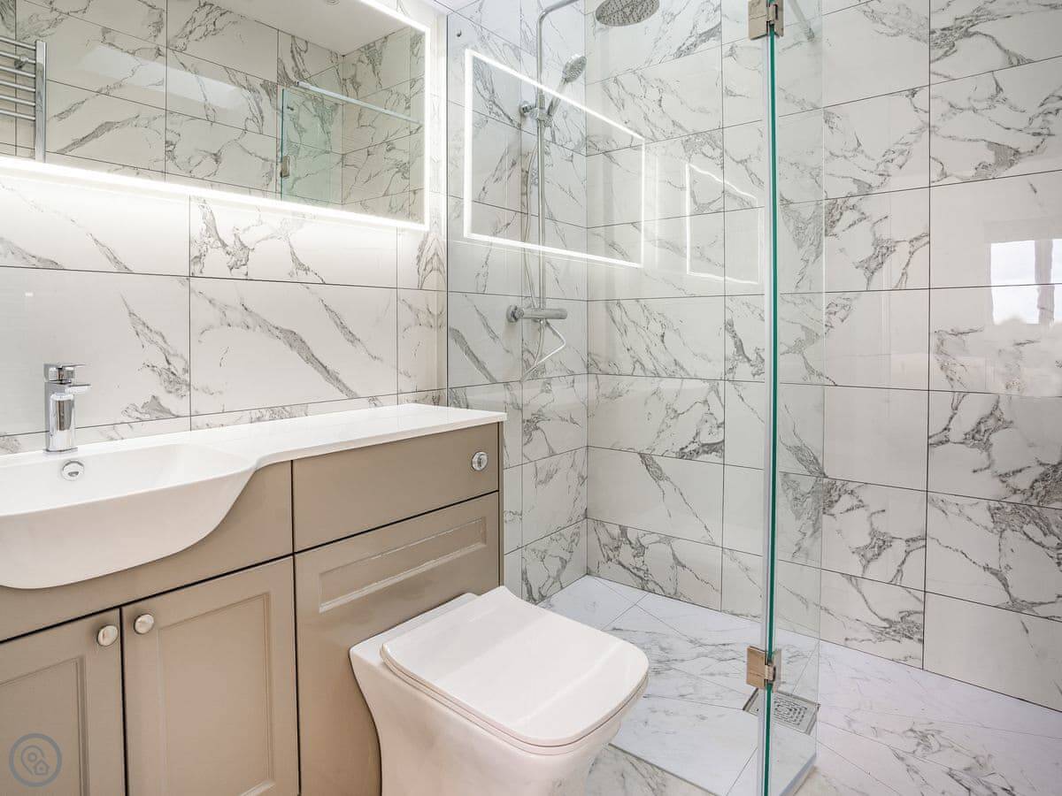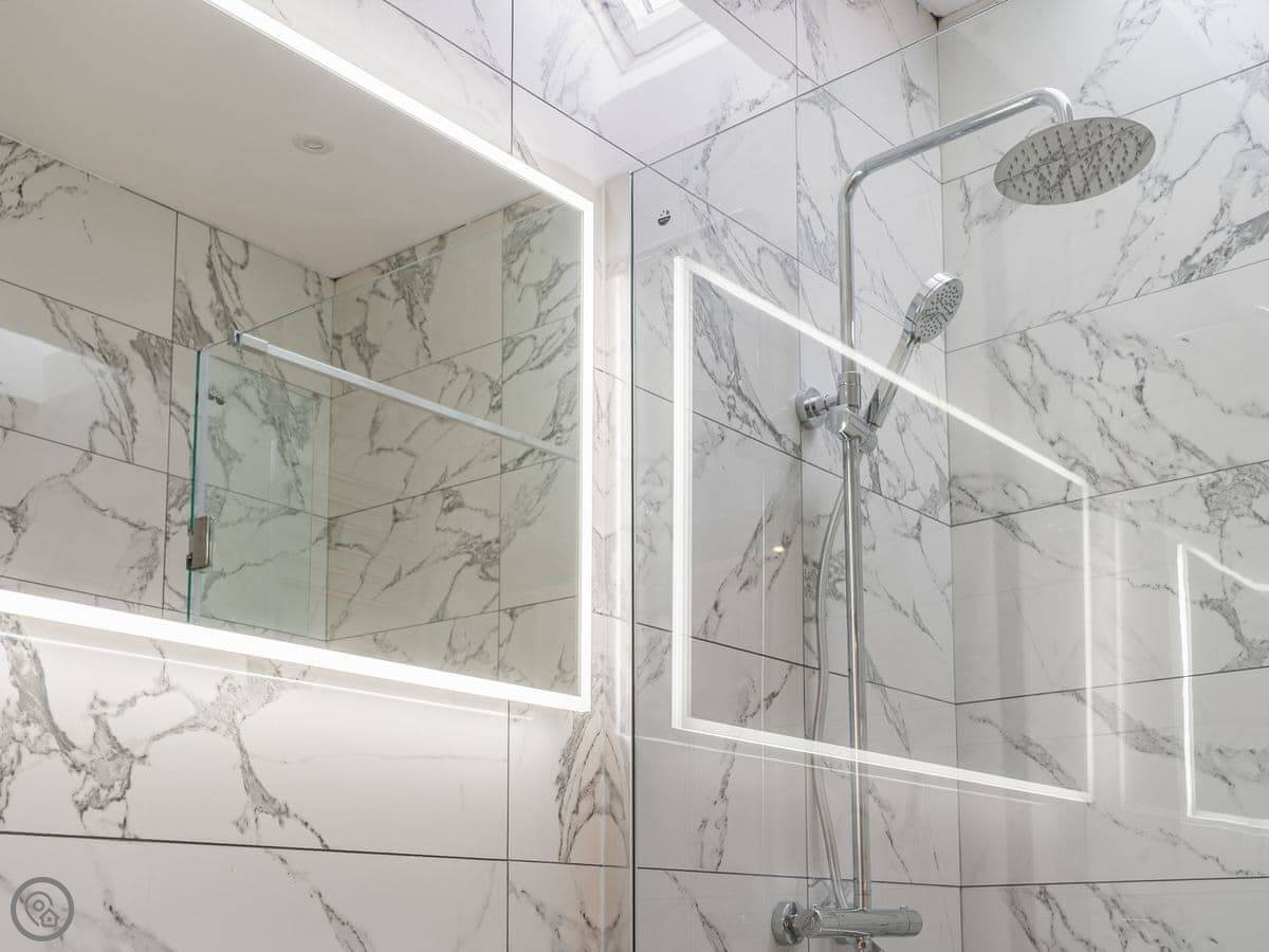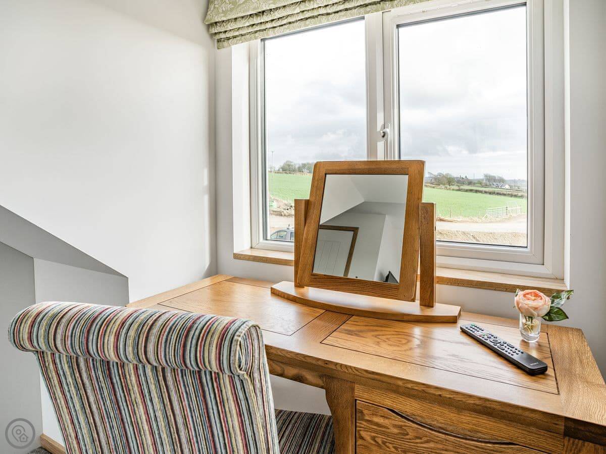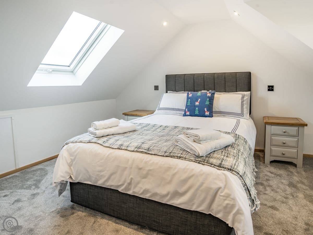 It sleeps six. Three bedrooms, each with its own bathroom. It's got a 5 Star rating, which means it's well-equipped and finished to a high standard. The beds are king-size. The heating is underfloor.