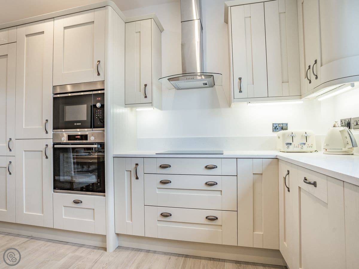There's a proper kitchen with an island and French doors that open onto the patio. We've put in an electric car charger. There's a washing machine, dishwasher, and wifi. Bedding and towels are included. You can bring one dog.