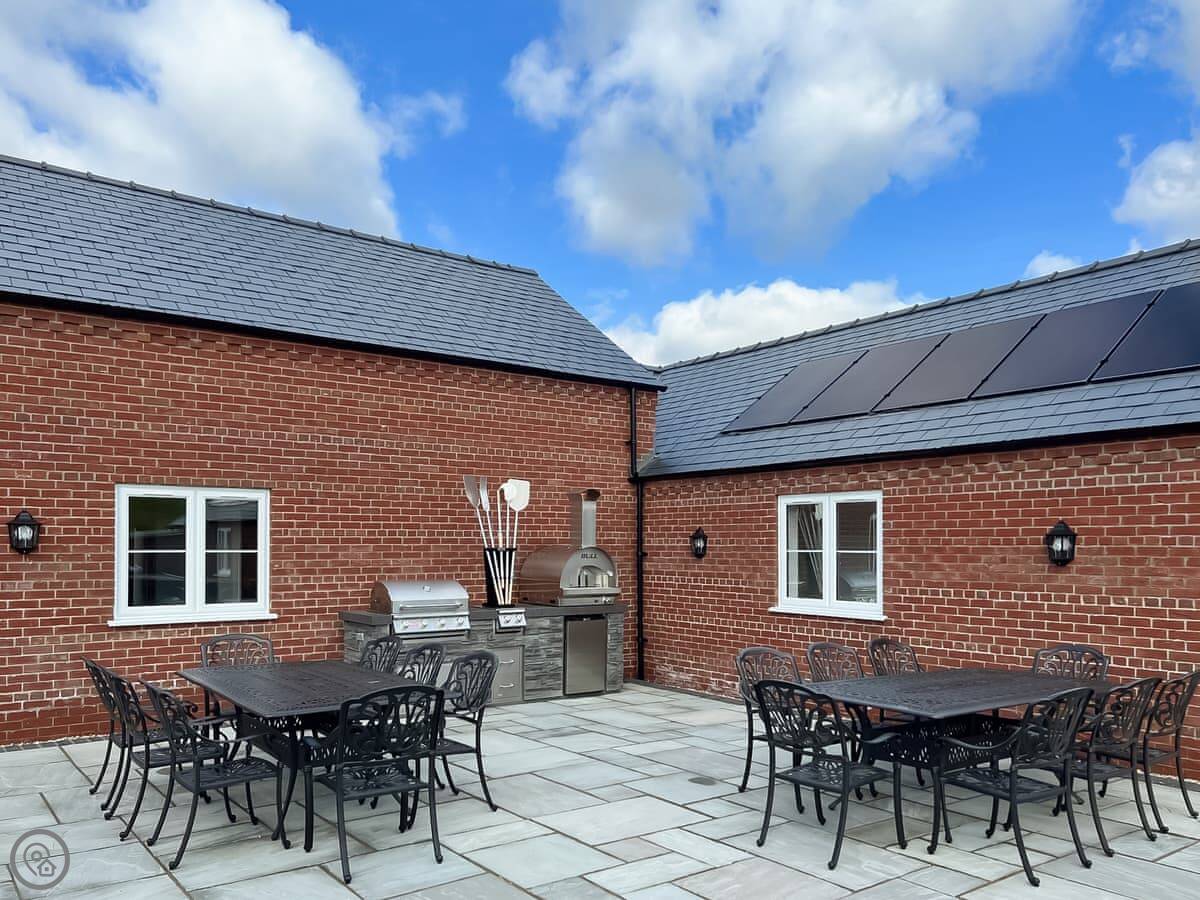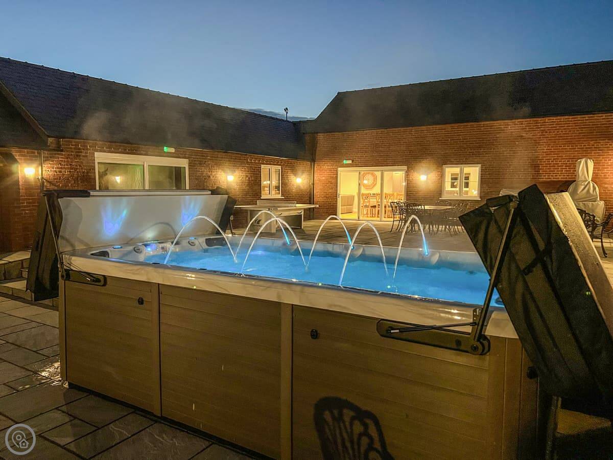 Outside, there's a courtyard on two levels. It has a hot tub and swim spa, an outdoor kitchen, and a big grassy area for games. There's parking on site and an electric vehicle charger.