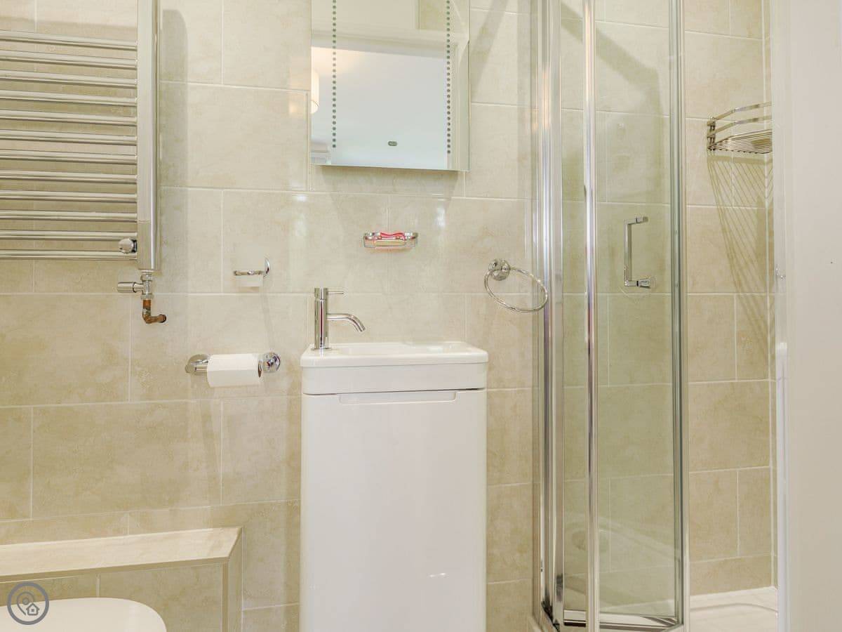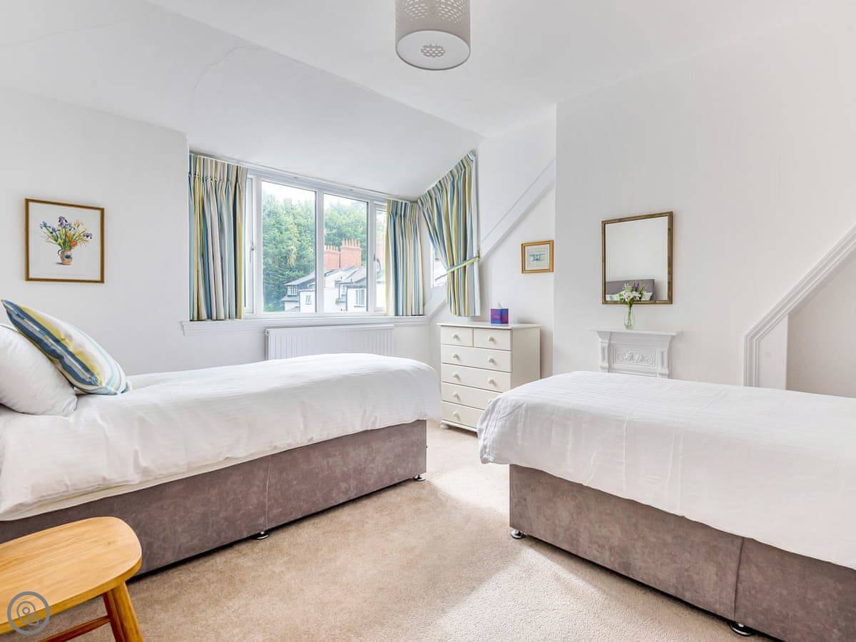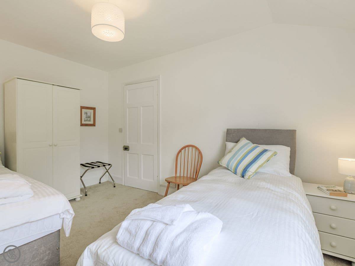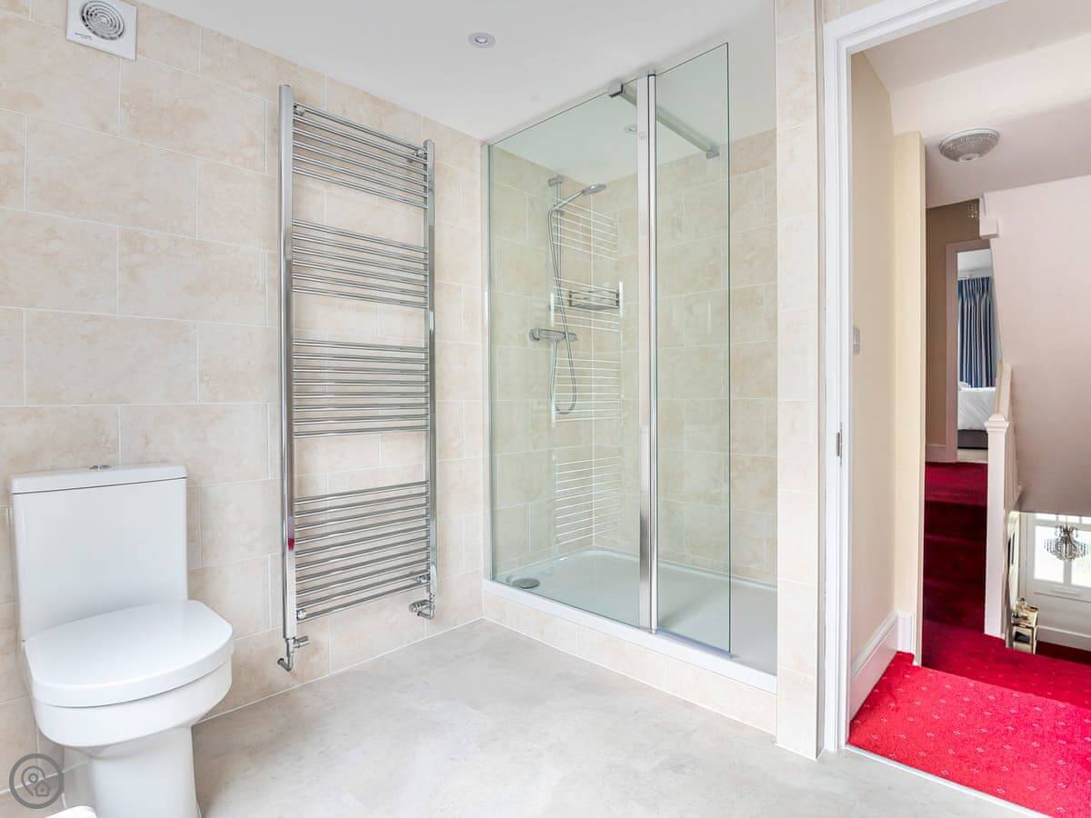 On the first floor, the main bedroom has an en-suite shower and a small balcony overlooking the river. There's another double bedroom on that floor. On the top floor are two more bedrooms, both with zip and link beds so you can have them as twins or doubles. The main family bathroom is on the stairs between the first and second floor, with a bath and a separate shower cubicle.