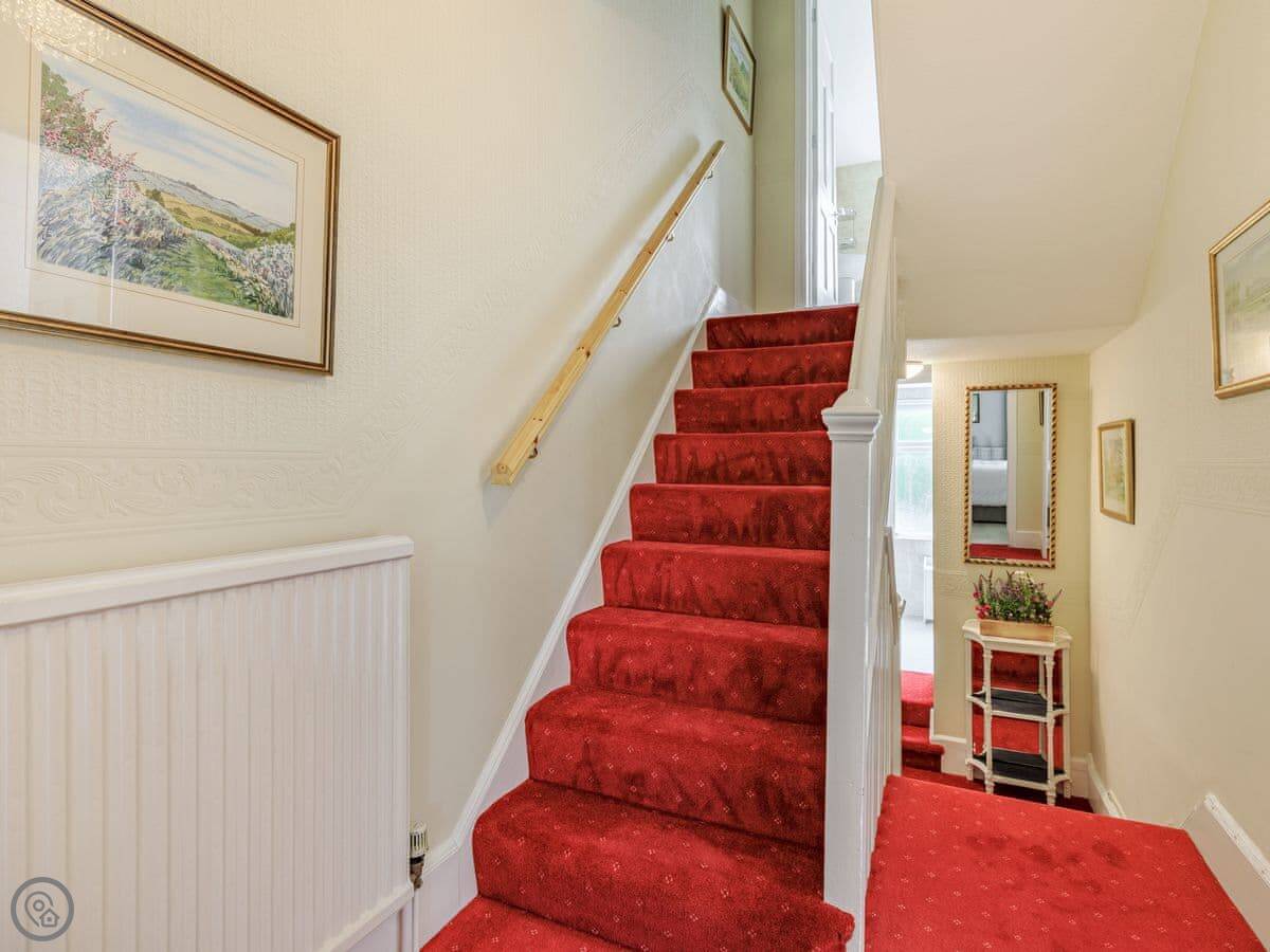 Inside, the kitchen is well equipped, with a dishwasher. There's a utility room next to it with a washing machine and tumble dryer. The living room is spacious with French doors to the garden. The stairs are standard, nothing unusual.