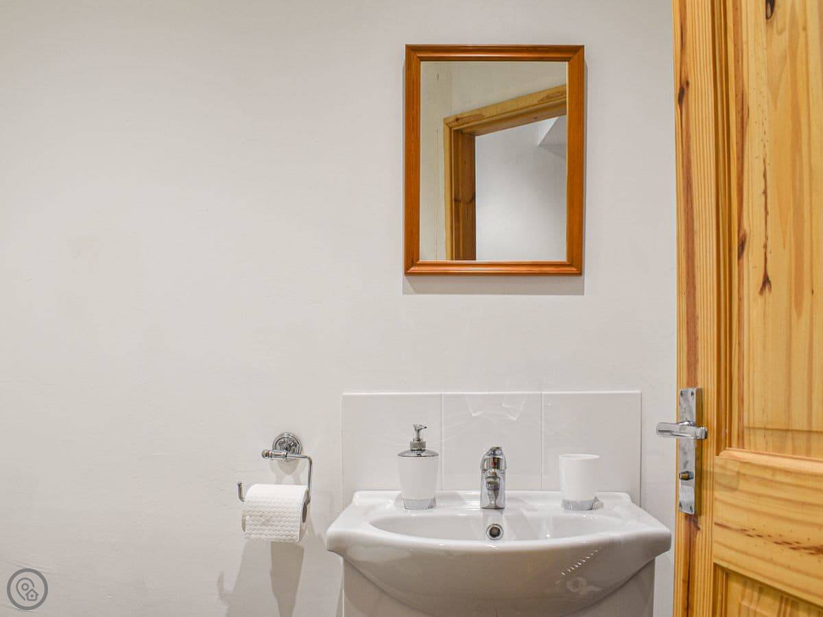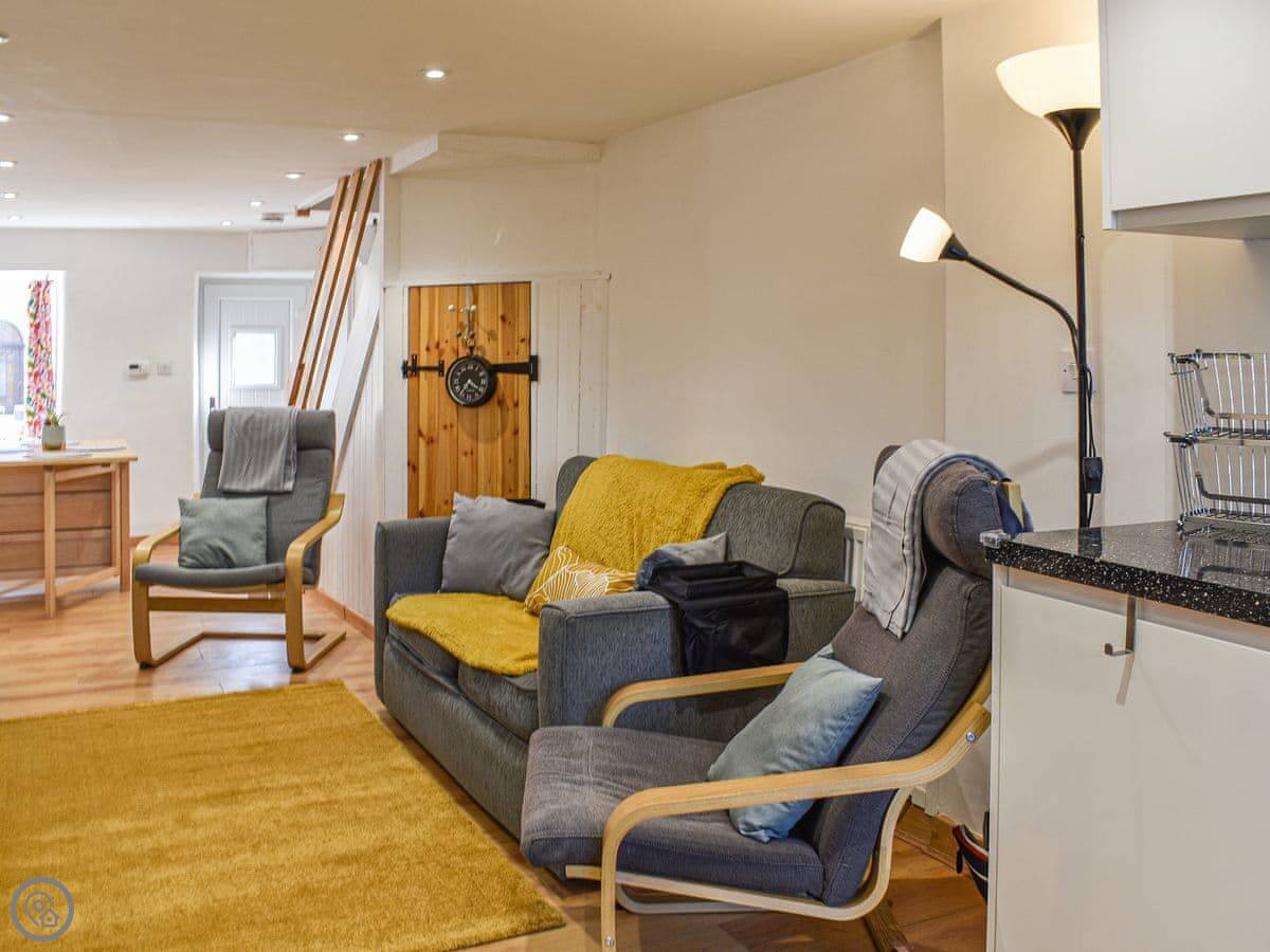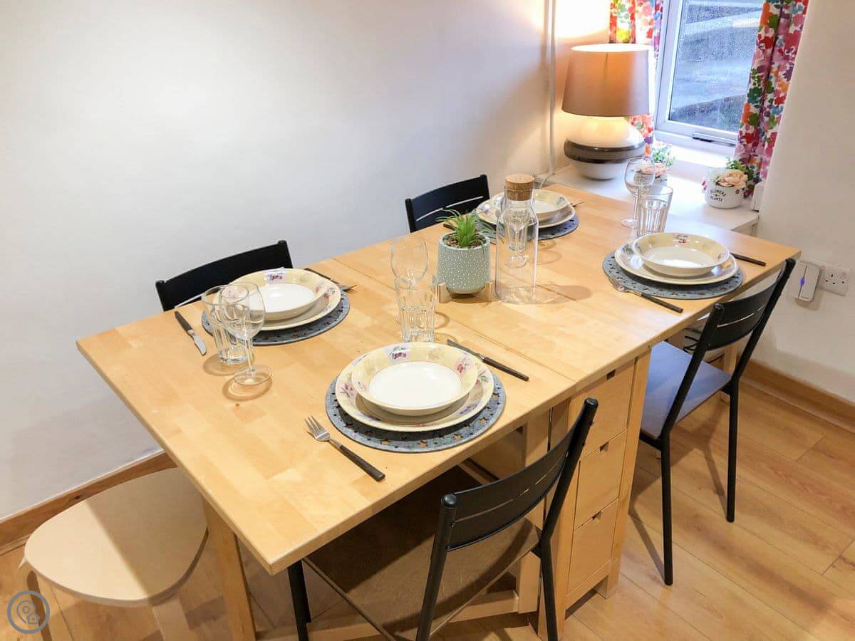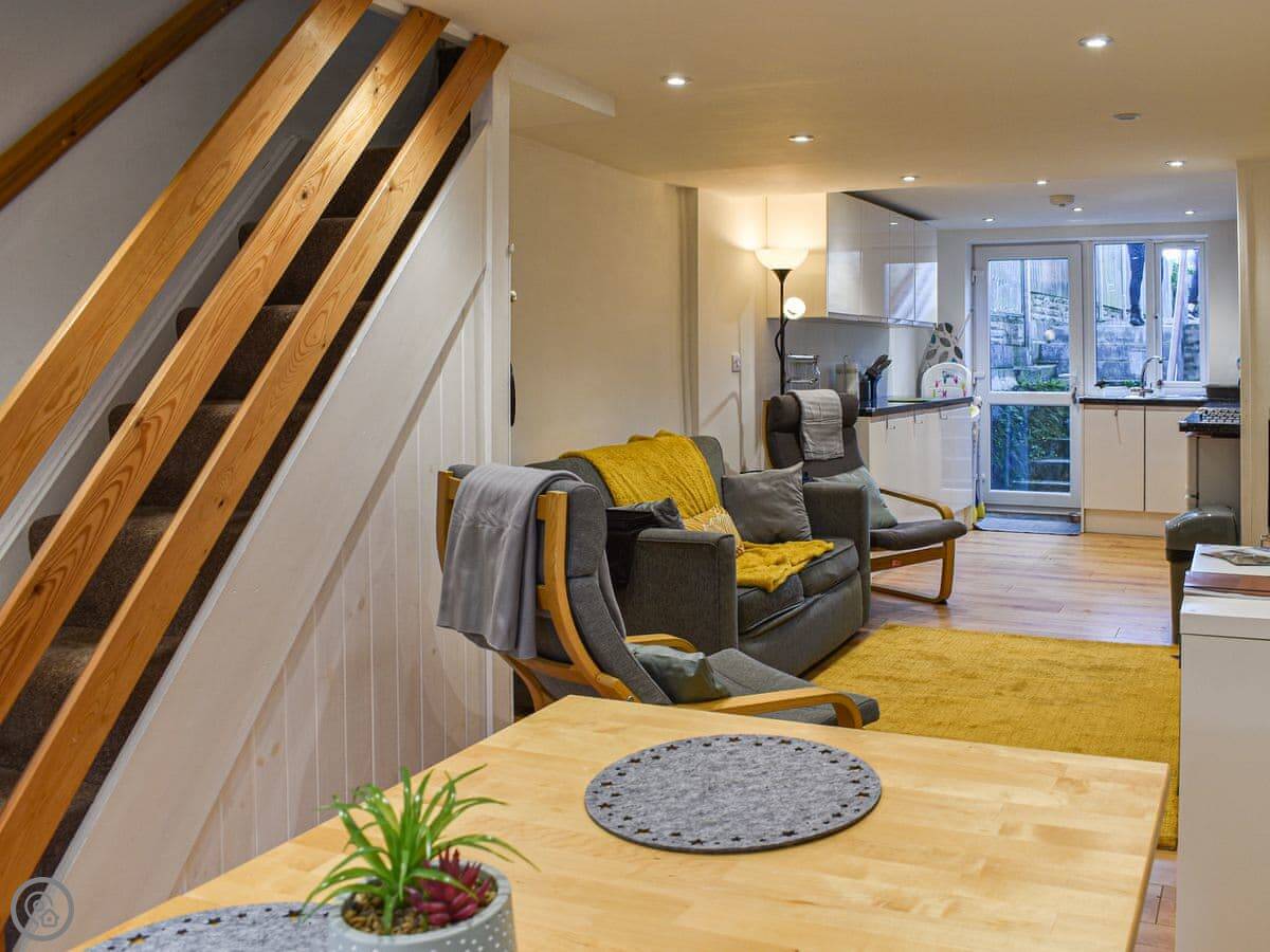 It's all open plan downstairs. Kitchen, living area, dining table. It's a good space if you're in for the evening. The stairs are a bit steep, like most cottages here. The bathroom is upstairs, just a shower room with a toilet and basin.