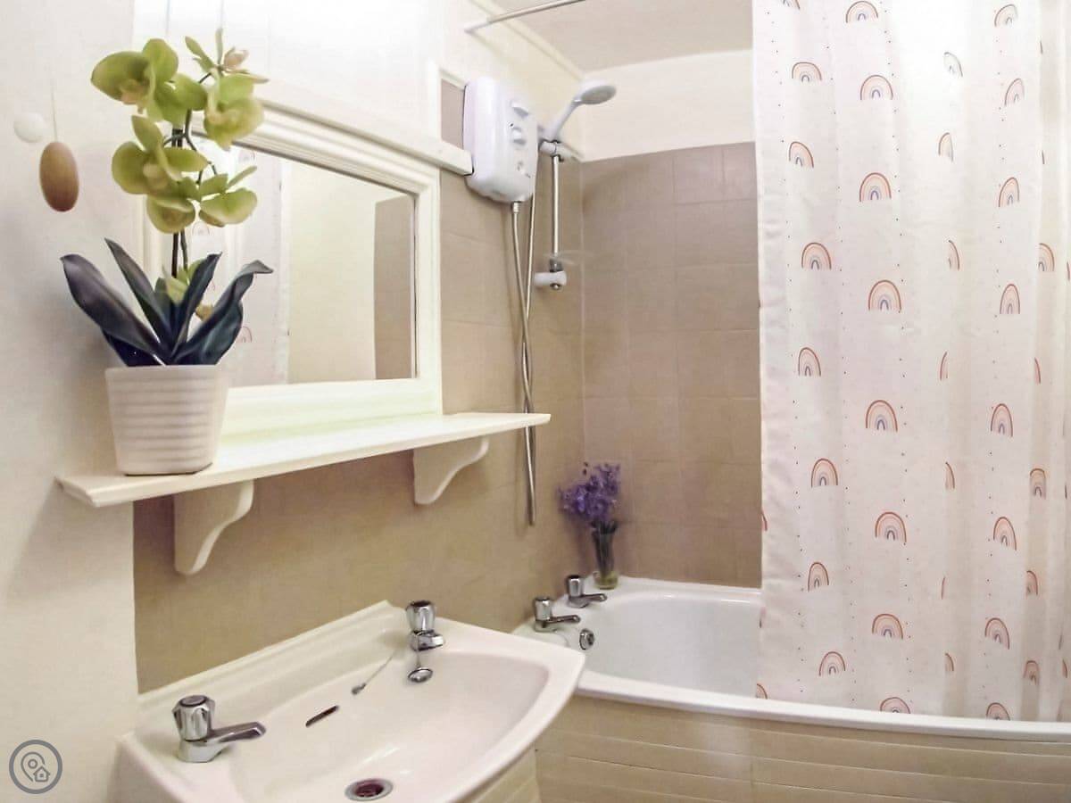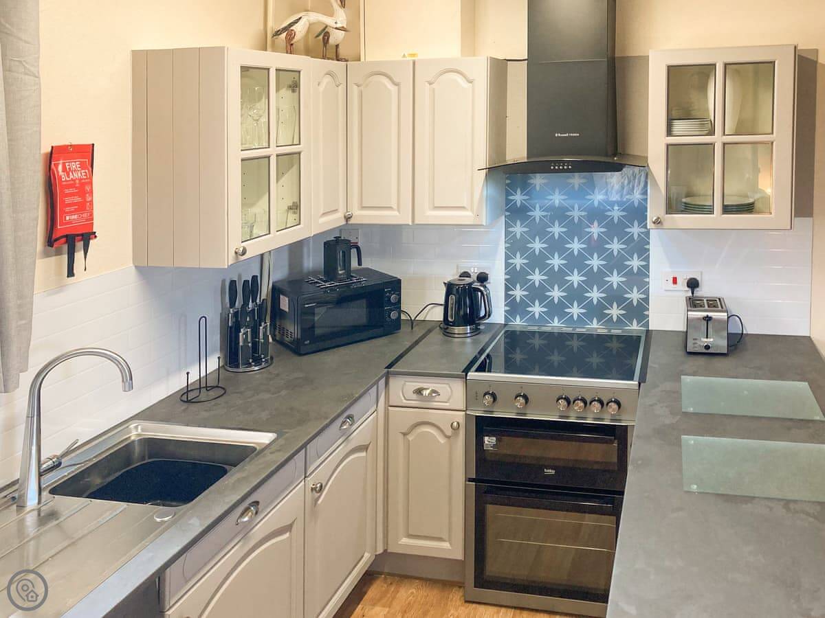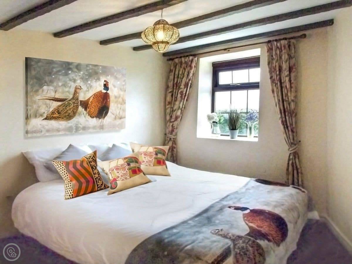 It sleeps three. Two bedrooms upstairs and one bathroom. It's a 3 Star place, so it's comfortable and clean but not luxurious. The stairs are standard cottage stairs, so they turn a corner and are a bit steeper than modern ones. There's a stairgate at the top.