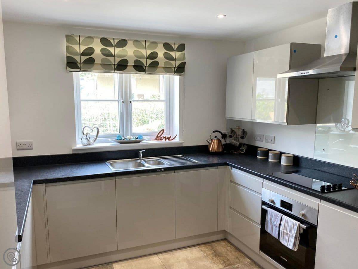 Inside, the lounge has patio doors out to the deck. The kitchen has what you'd expect: a dishwasher, washing machine, oven. There's a coffee machine if that's your thing.