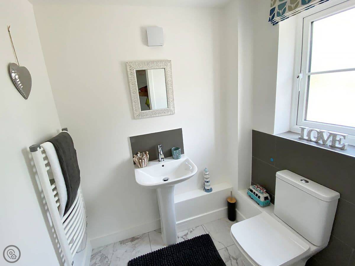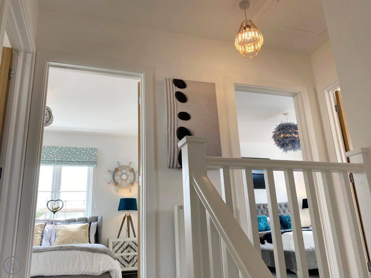 It sleeps six across three bedrooms. There's one family bathroom upstairs, and a separate downstairs WC off the hallway which is useful. The stairs are normal.