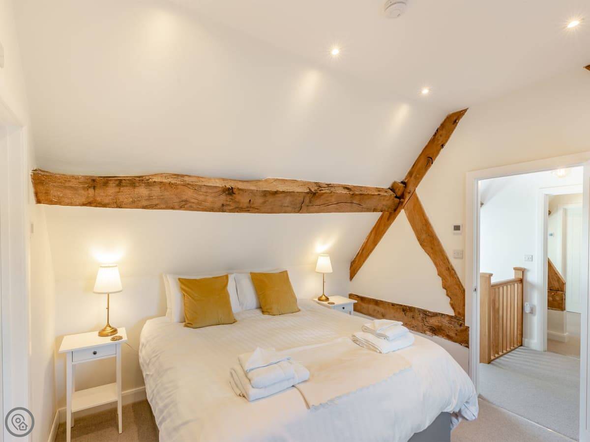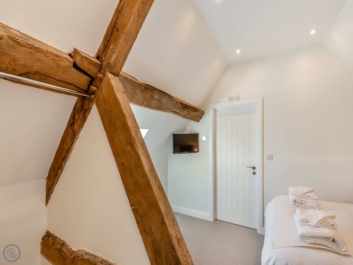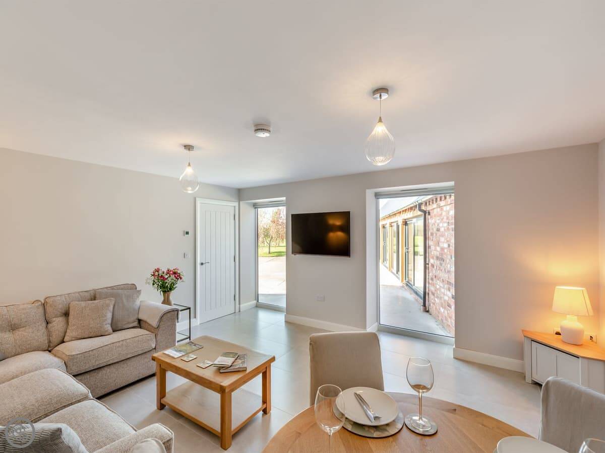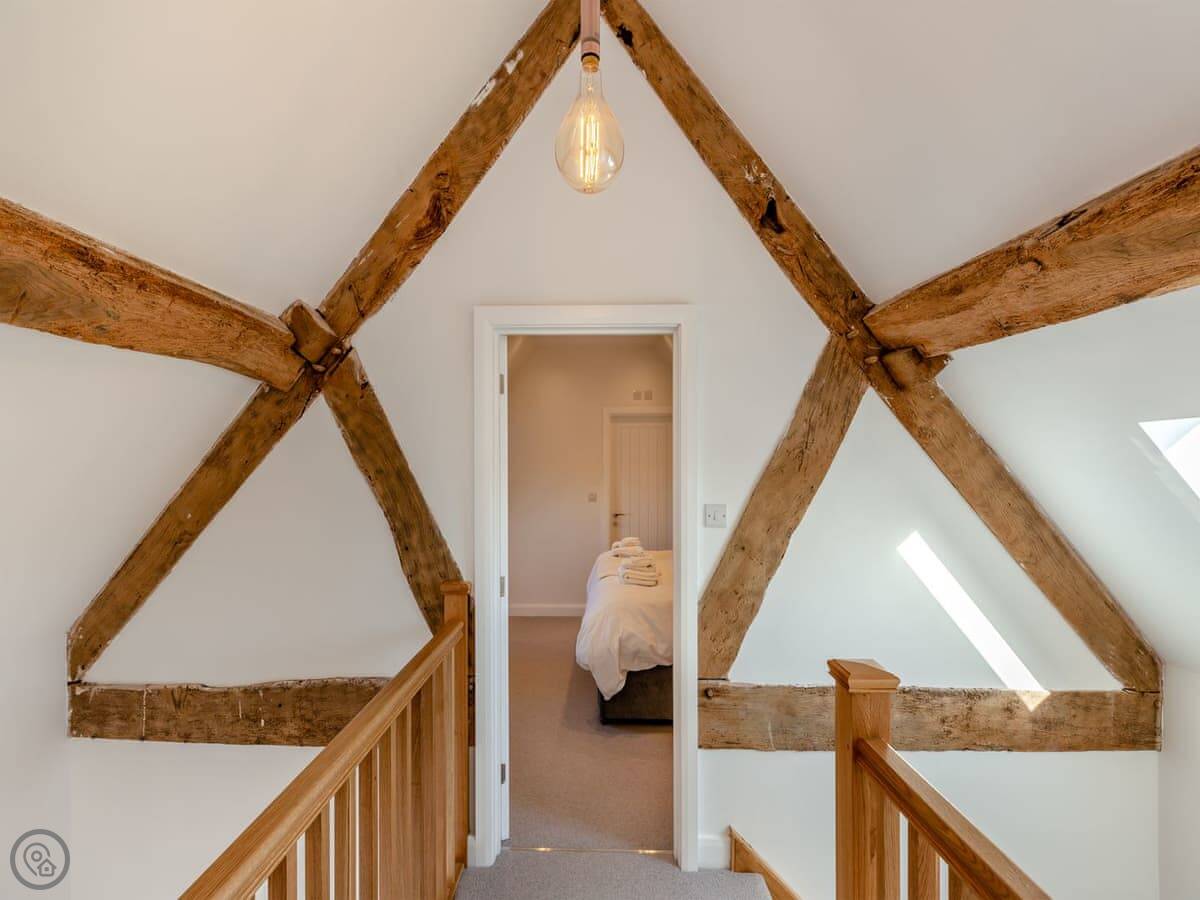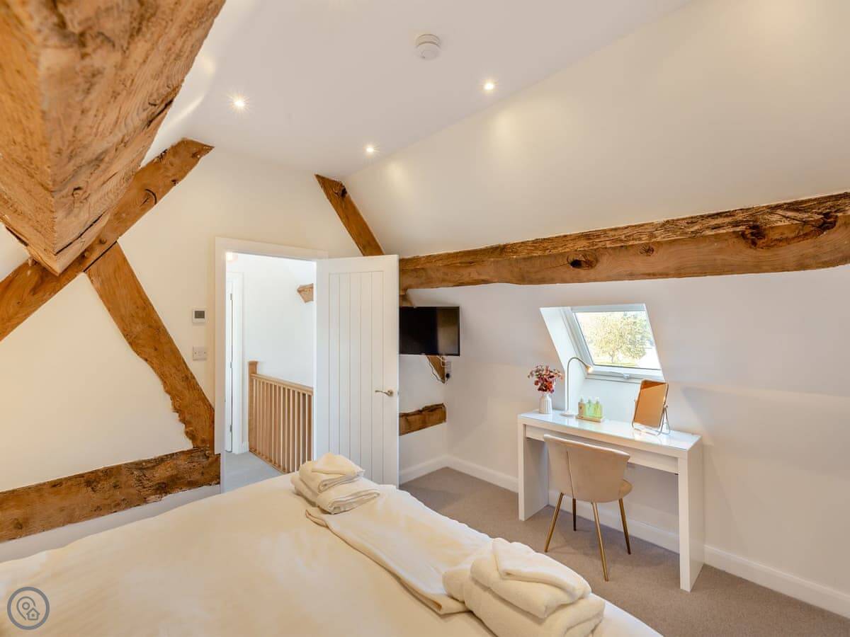The barn is open-plan inside, with wooden beams. Big windows. You get a view over the fields from here, and you can see the River Severn. It's a working farm, so you'll see sheep and hear tractors sometimes.