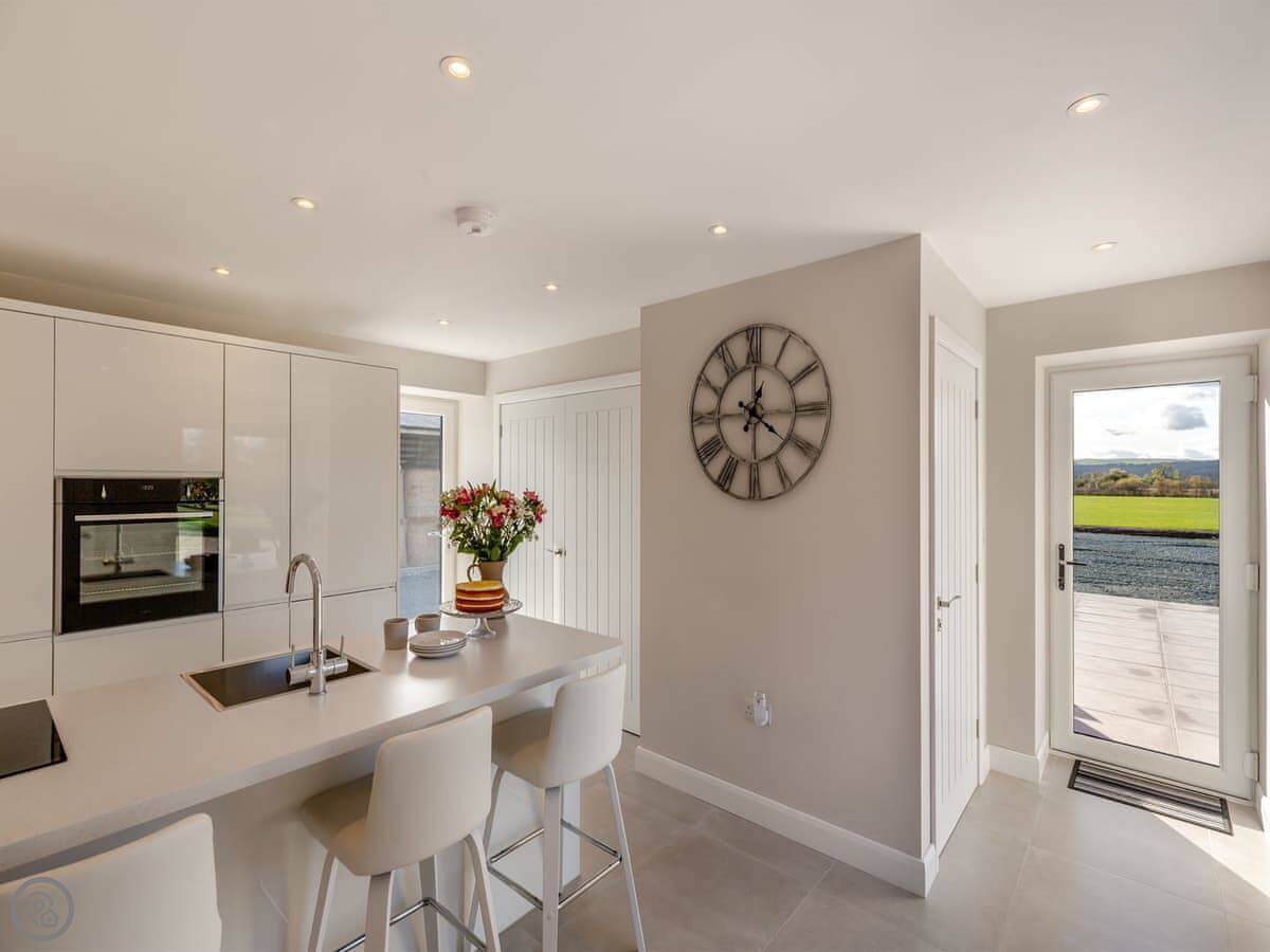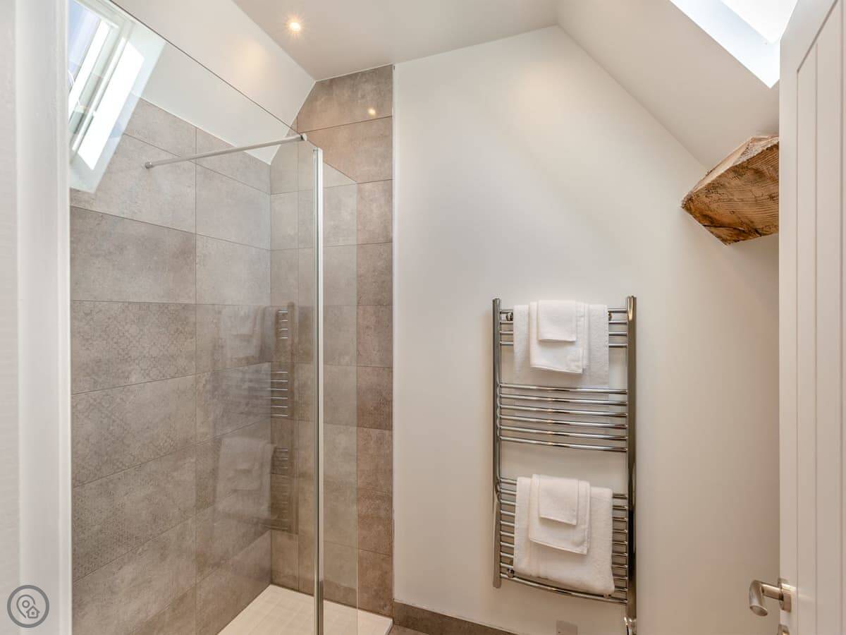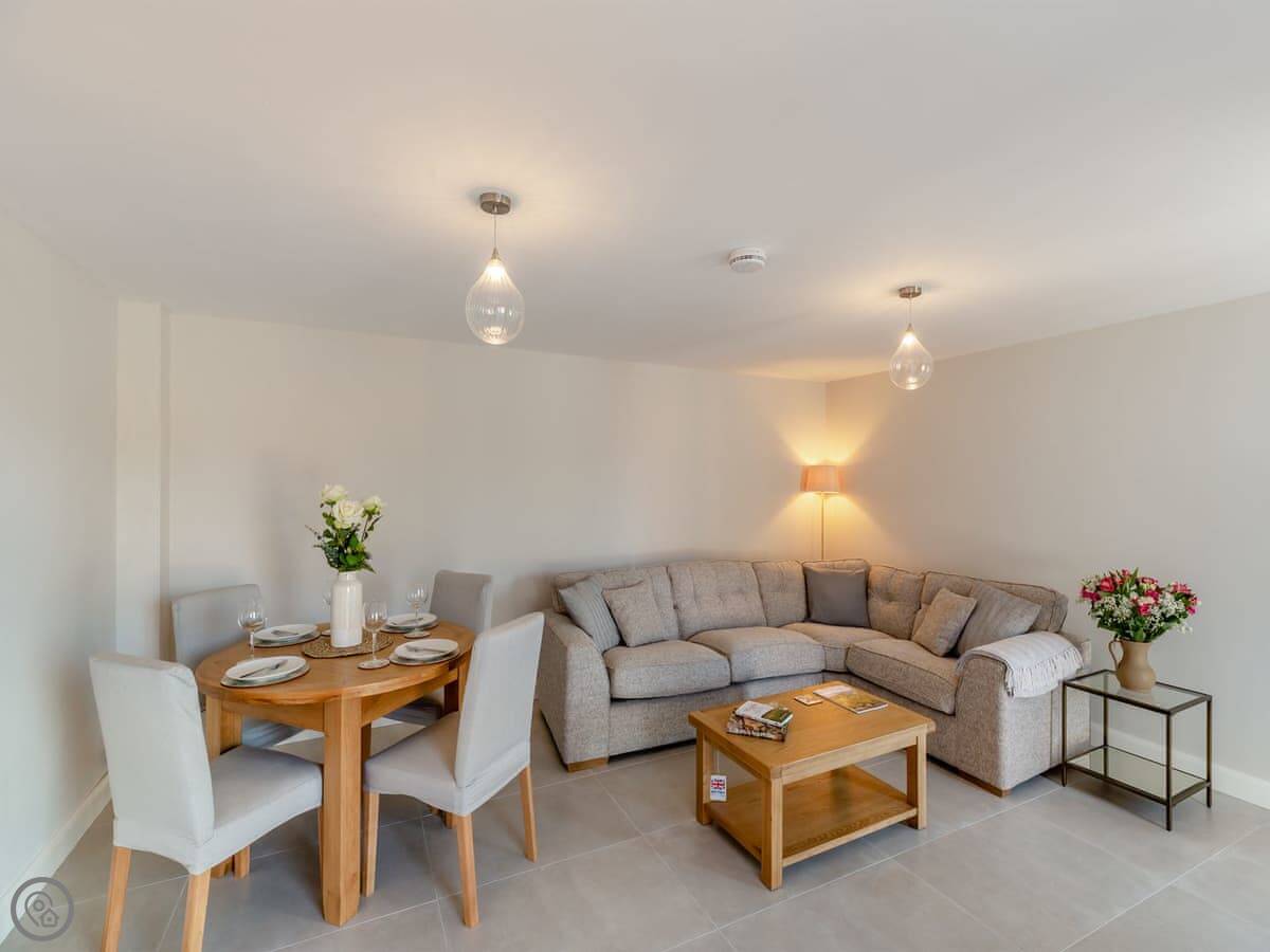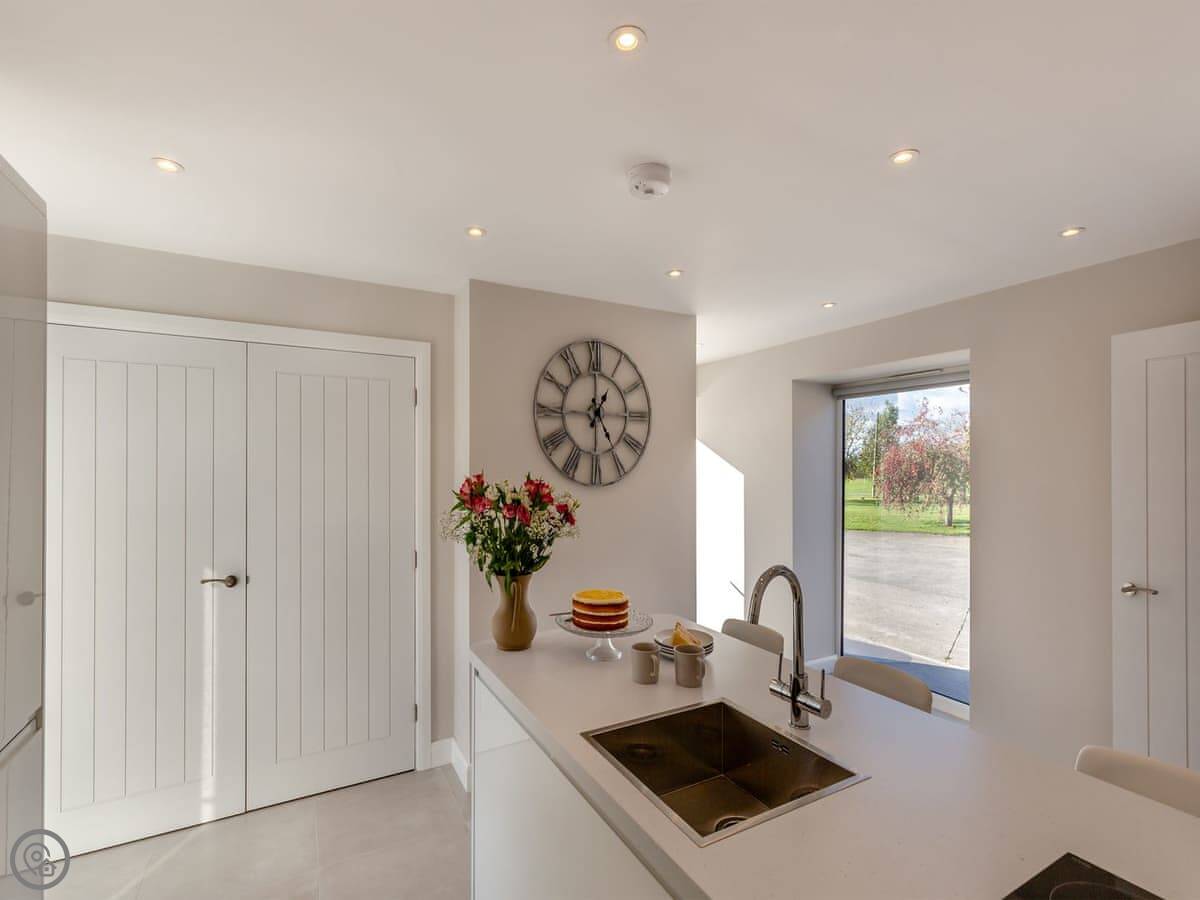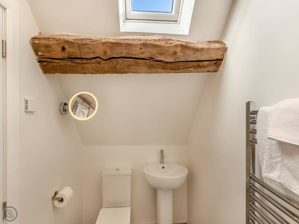 The barn is open-plan inside, with wooden beams. Big windows. You get a view over the fields from here, and you can see the River Severn. It's a working farm, so you'll see sheep and hear tractors sometimes.