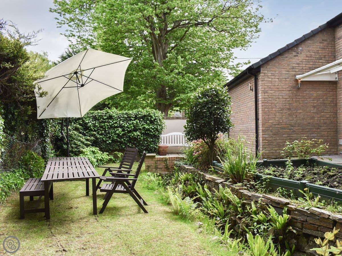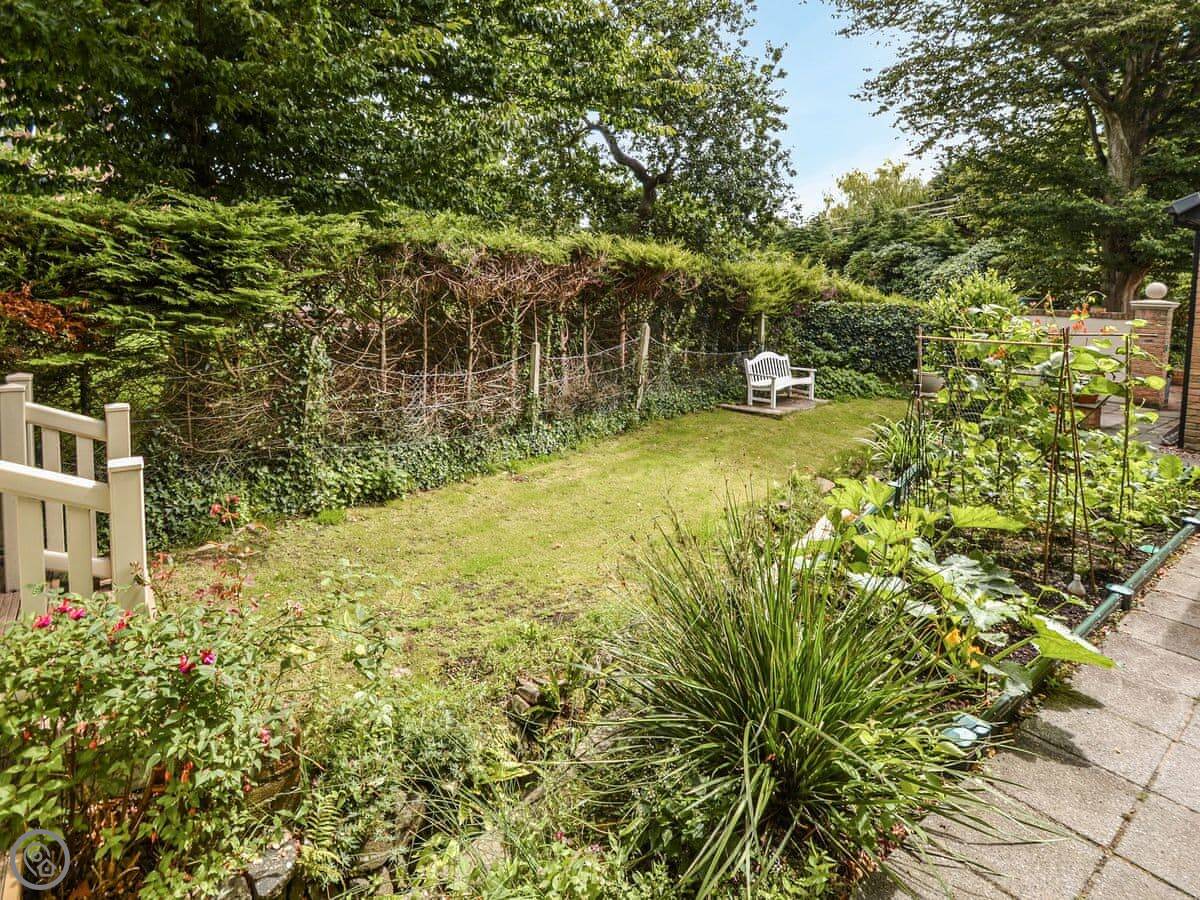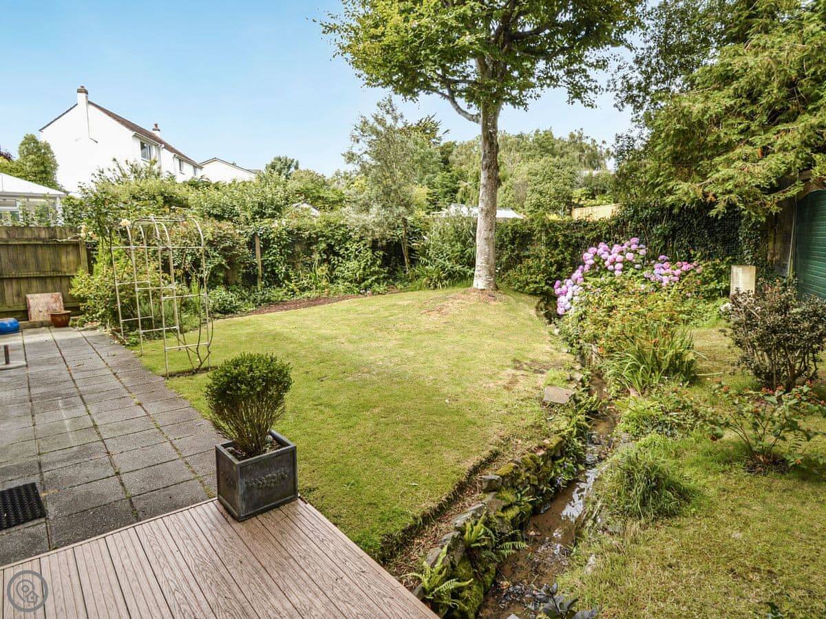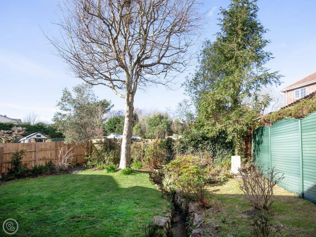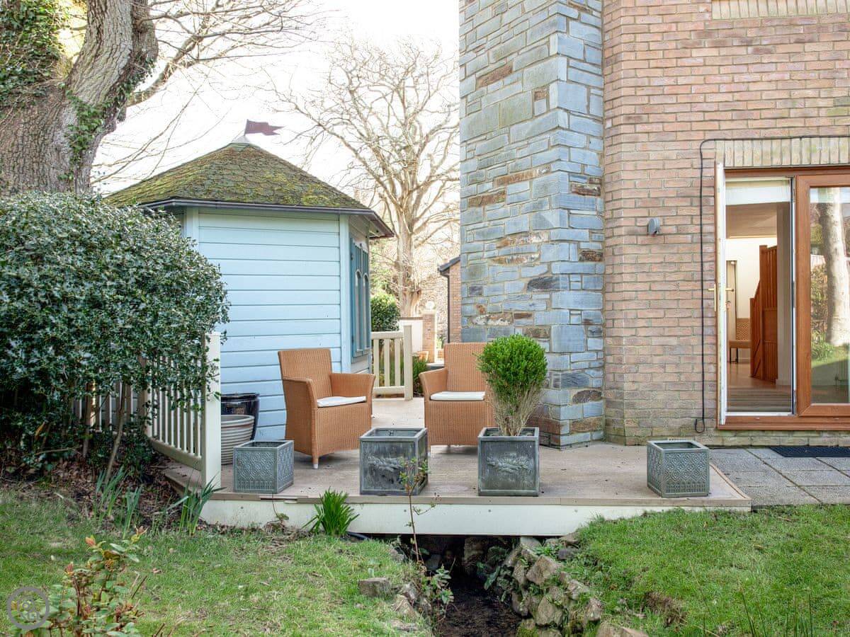 Outside is an enclosed garden on two sides. It's got a lawn, a patio, and a summerhouse. There's a small stream running through part of it, so just something to be aware of if you have young kids.