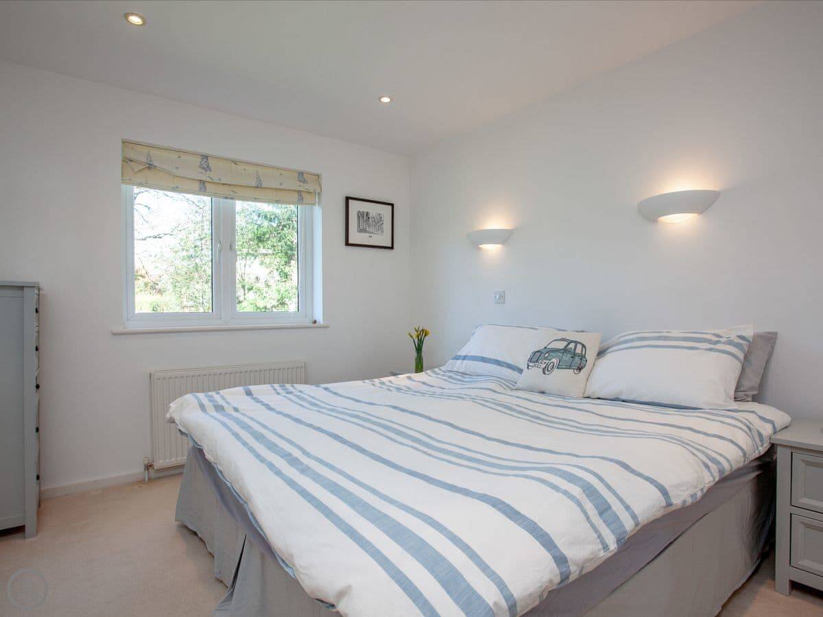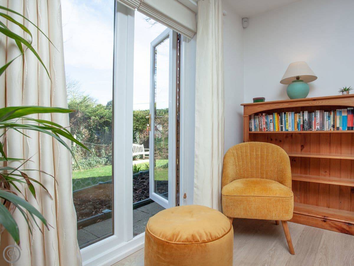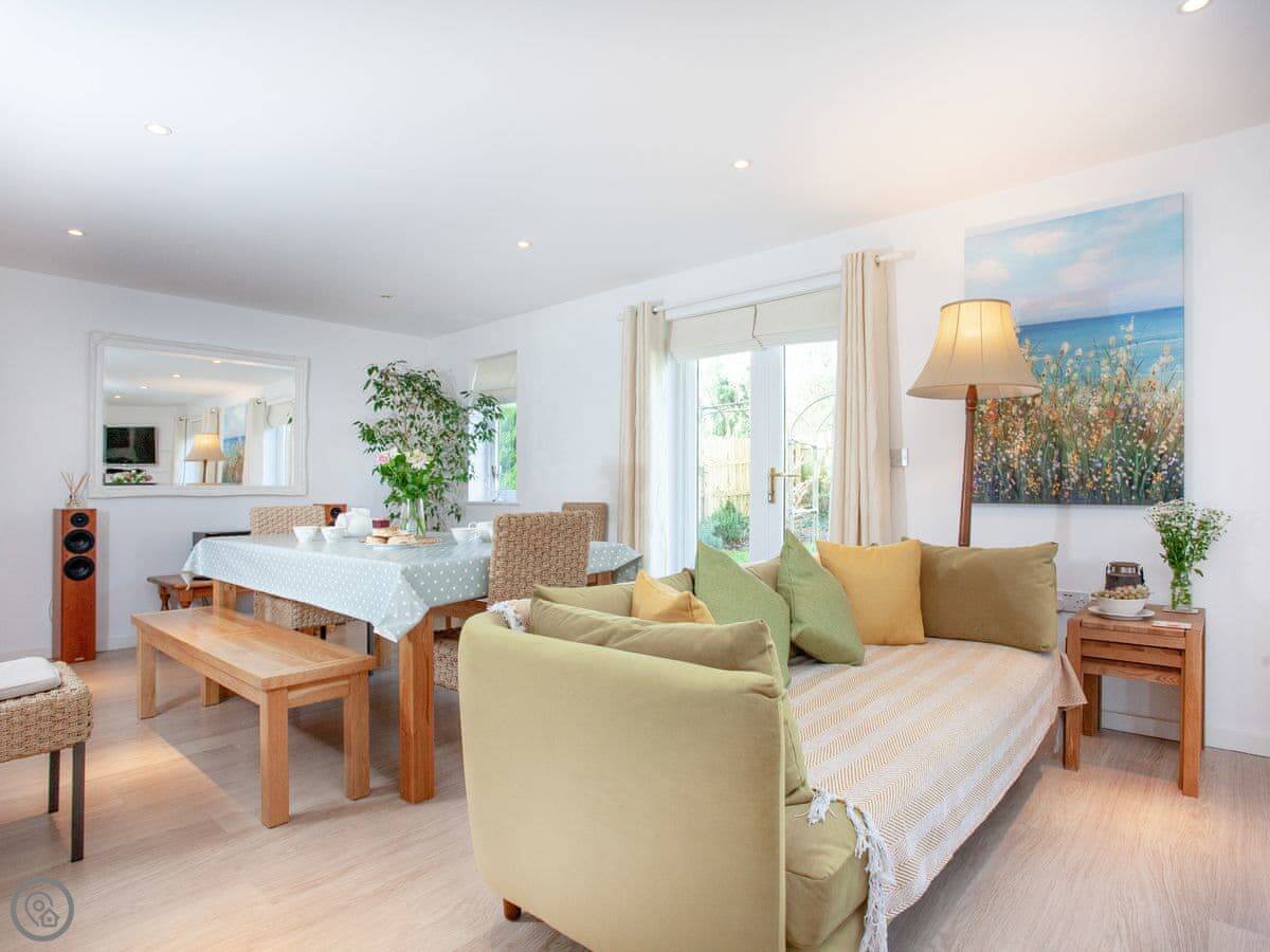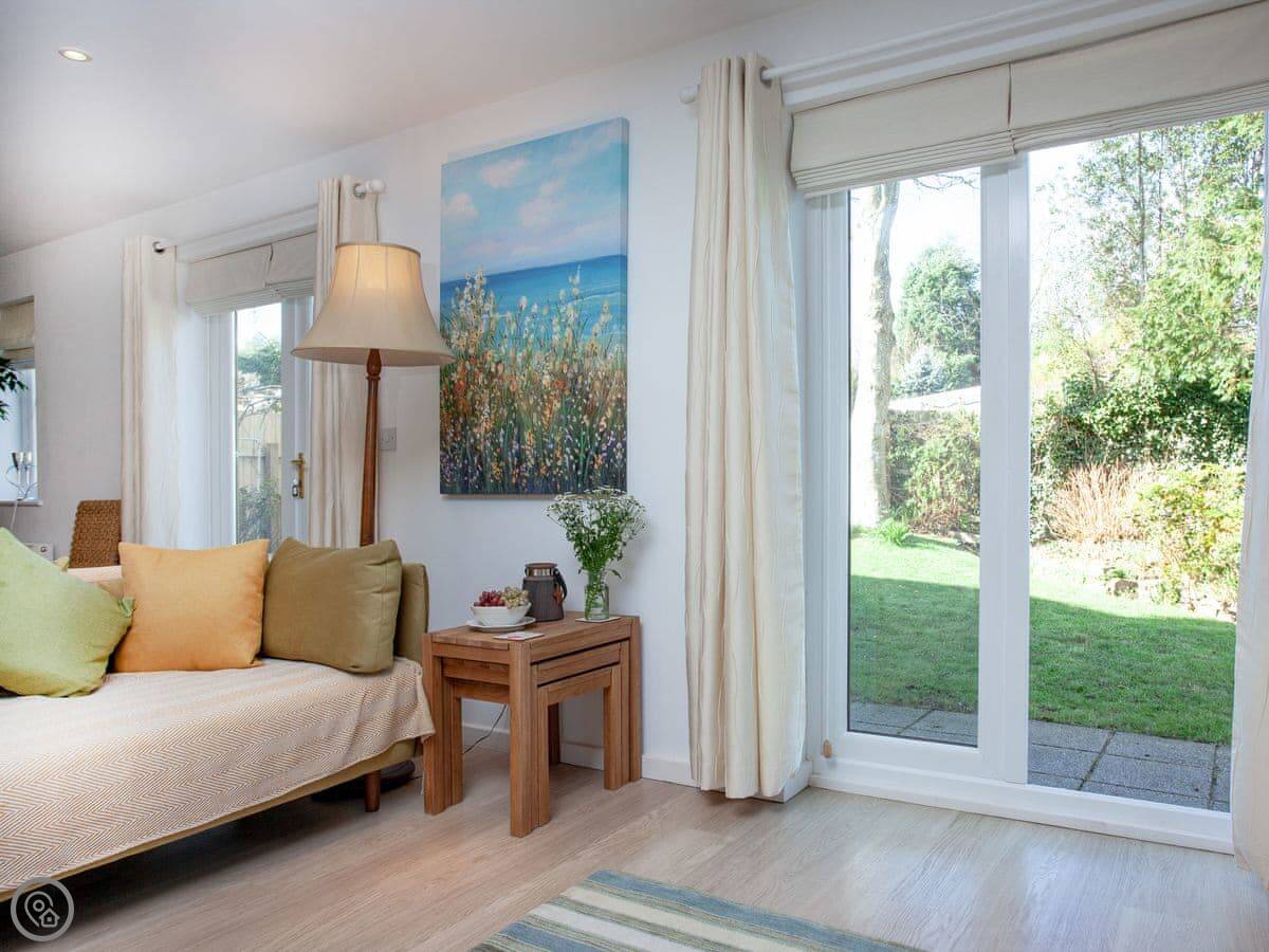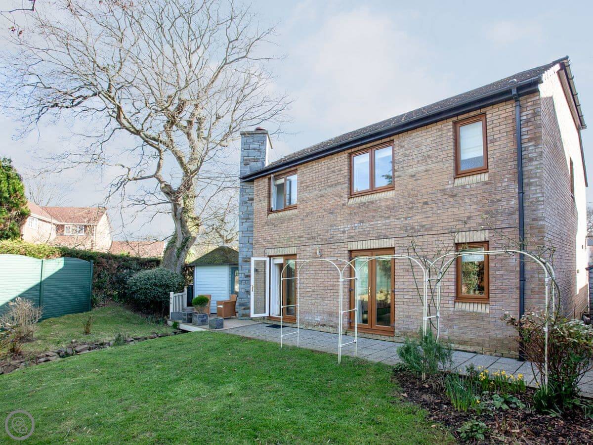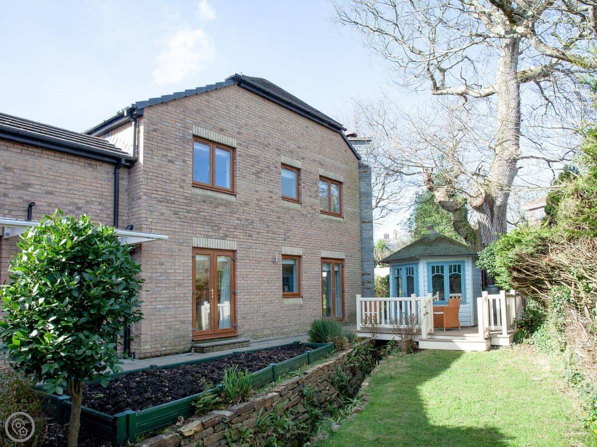 Outside is an enclosed garden on two sides. It's got a lawn, a patio, and a summerhouse. There's a small stream running through part of it, so just something to be aware of if you have young kids.