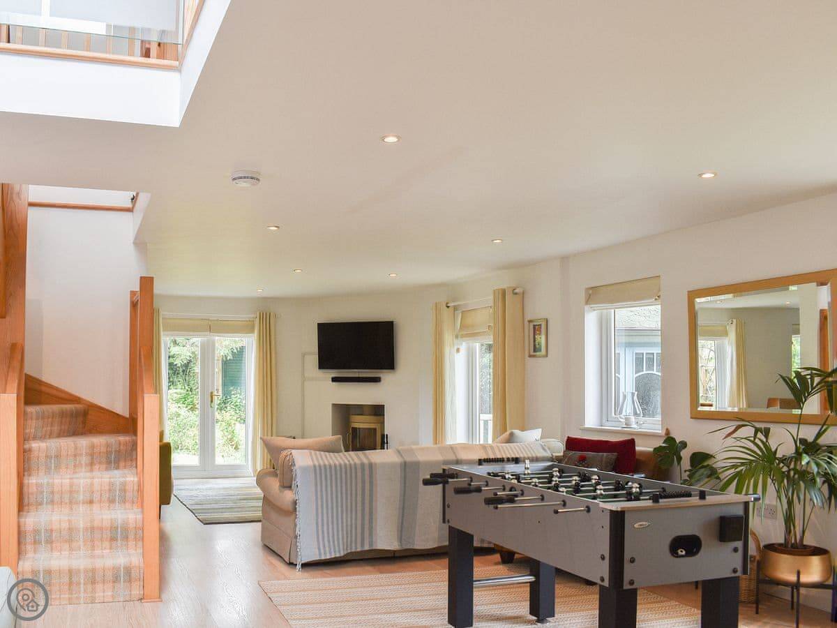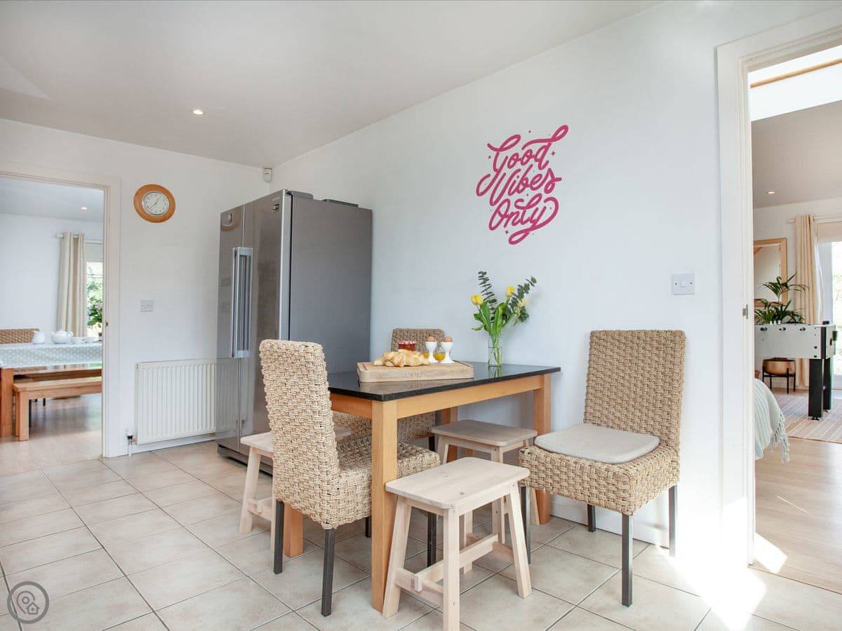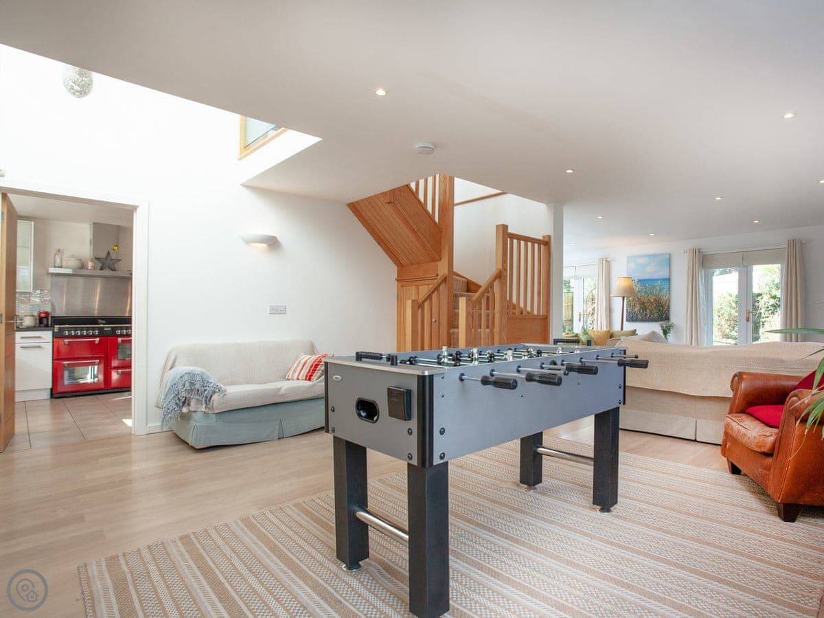 Downstairs there's a kitchen with a big table for breakfast. The living area has a dining table and a wood burner. There's a utility room with a washing machine and one of those pulley airers for drying clothes. We left a table football in there as well.