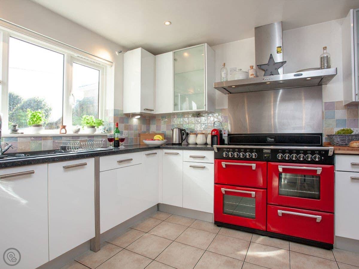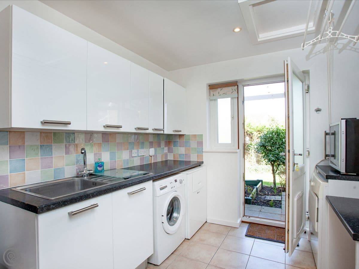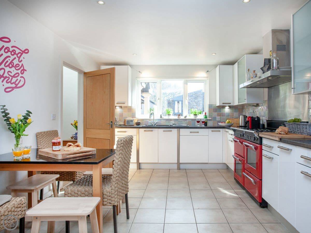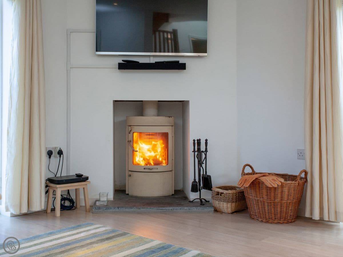 Downstairs there's a kitchen with a big table for breakfast. The living area has a dining table and a wood burner. There's a utility room with a washing machine and one of those pulley airers for drying clothes. We left a table football in there as well.