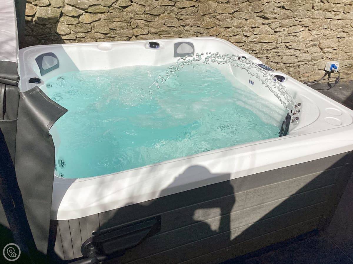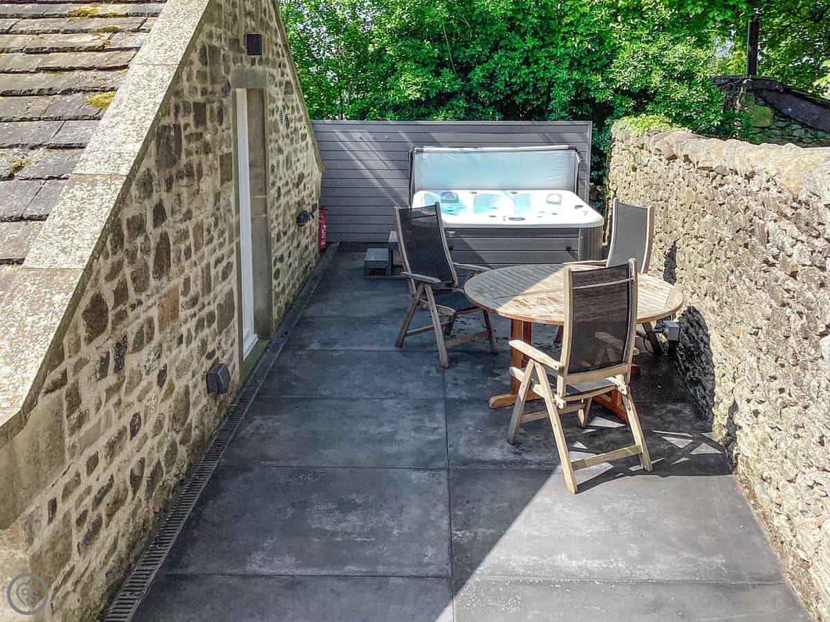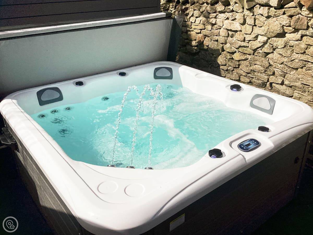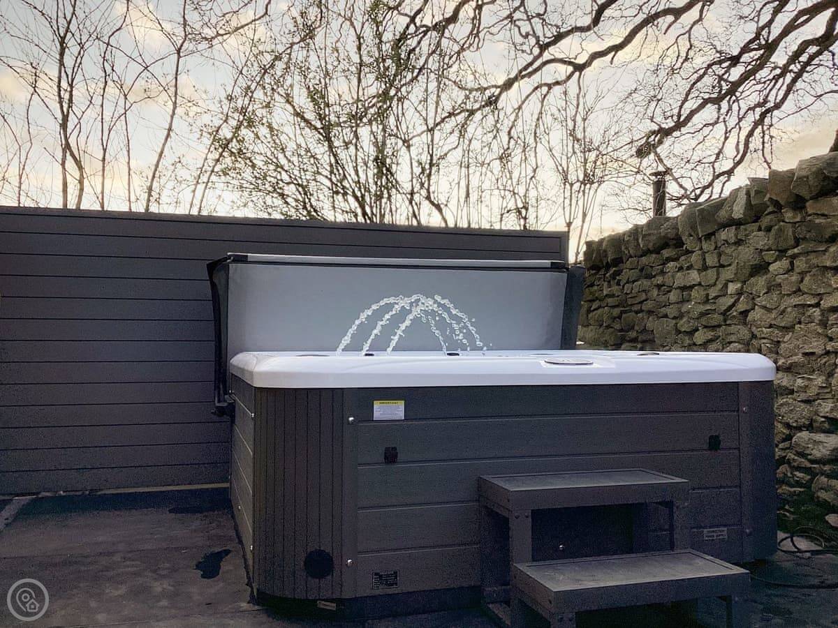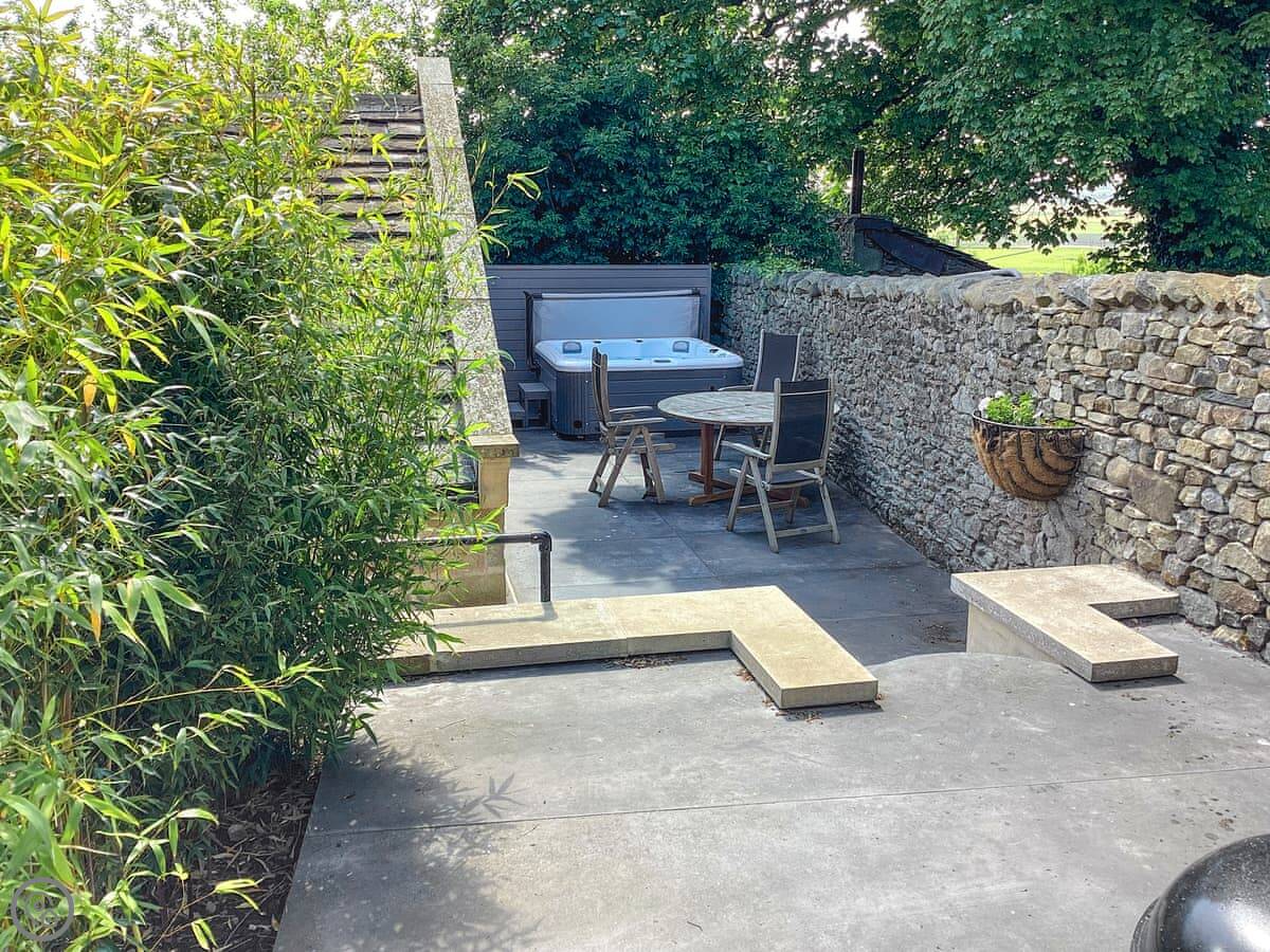 Outside, there's a patio at the back with a hot tub. You look out over fields. It's a quiet spot.