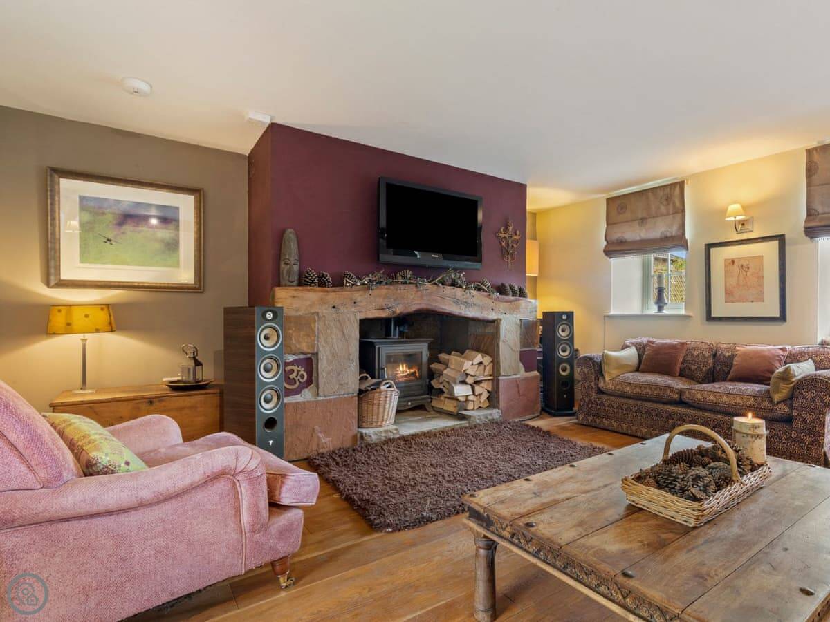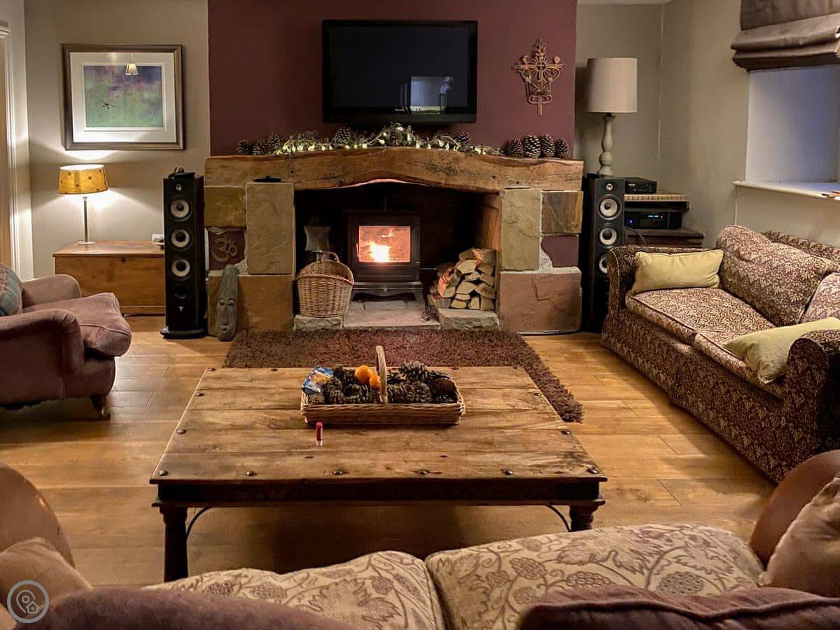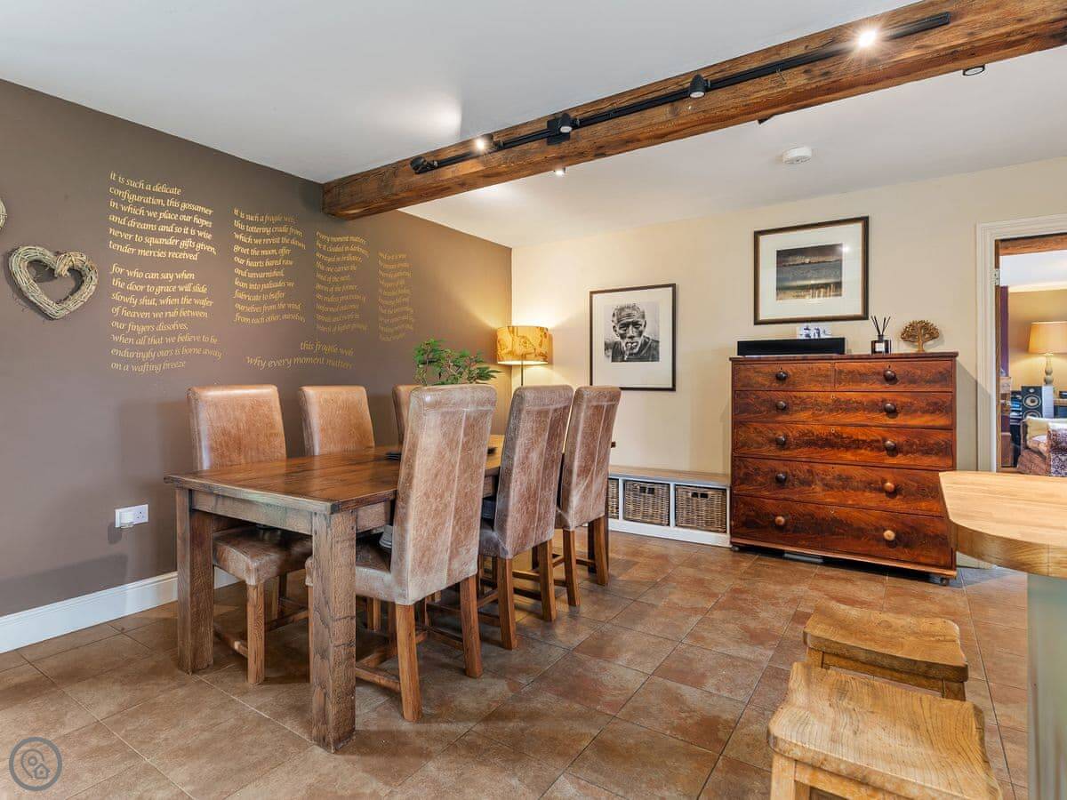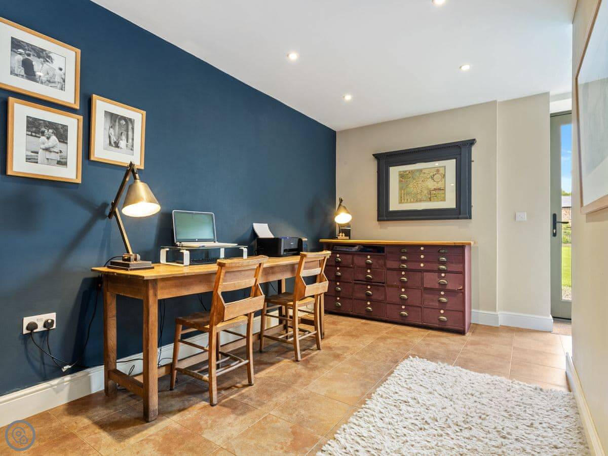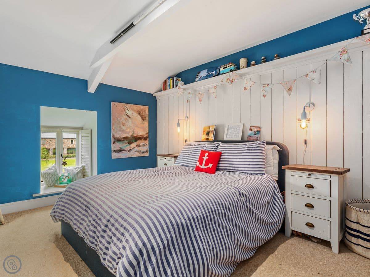 The large social open plan kitchen/dining space, along with the neighbouring sitting room, have doors out to the front of the property and make wonderfully welcoming entertainment spaces. The kitchen is finished in a lovely matt shaker style, which combines with the natural wood worktops to echo the property’s charming rural surroundings. The ground floor of the property is finished in a mixture of tiles and solid oak flooring that covers an underfloor heating system. With the feature hearth and Chesney wood burner, the room offers all year-round escape and relaxation. The thick walls allow peace, quiet and a fabulous place to kick back and relax.