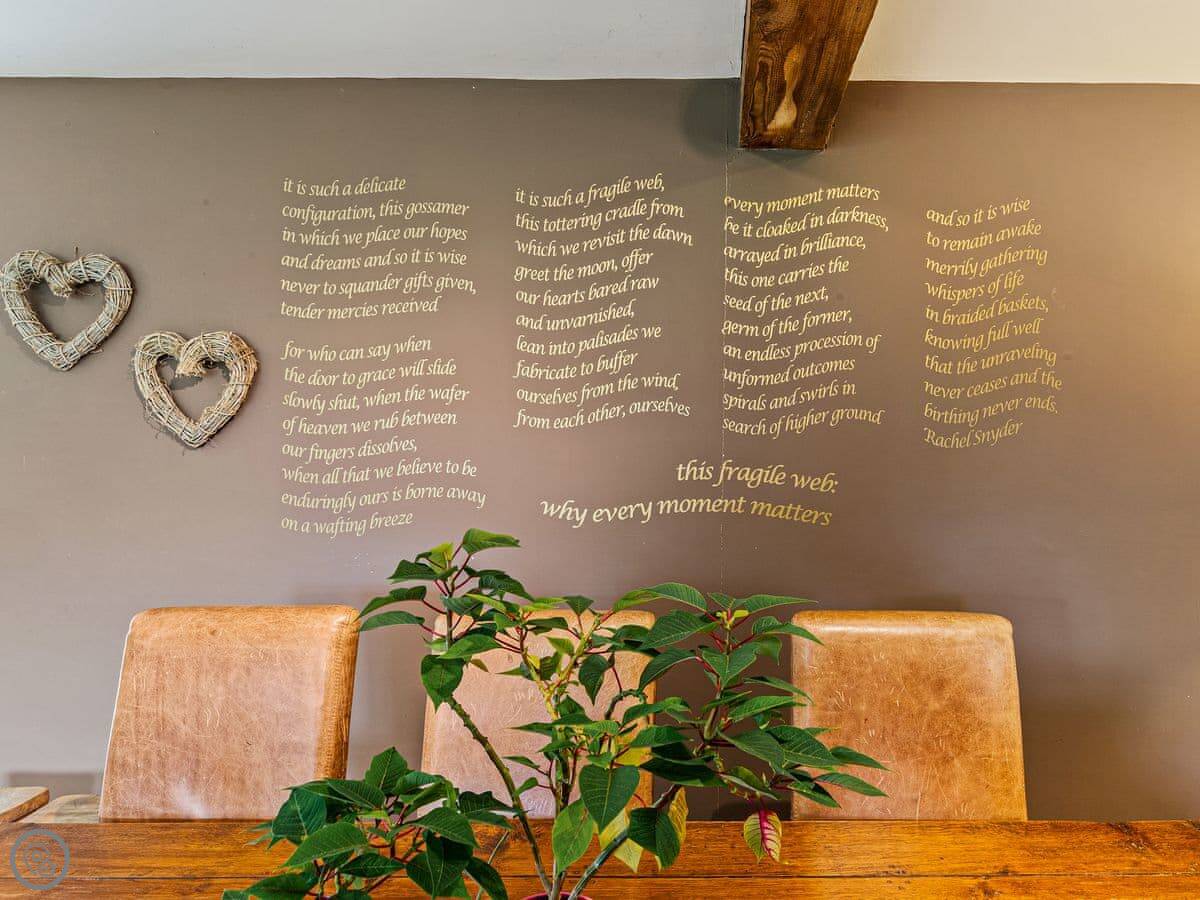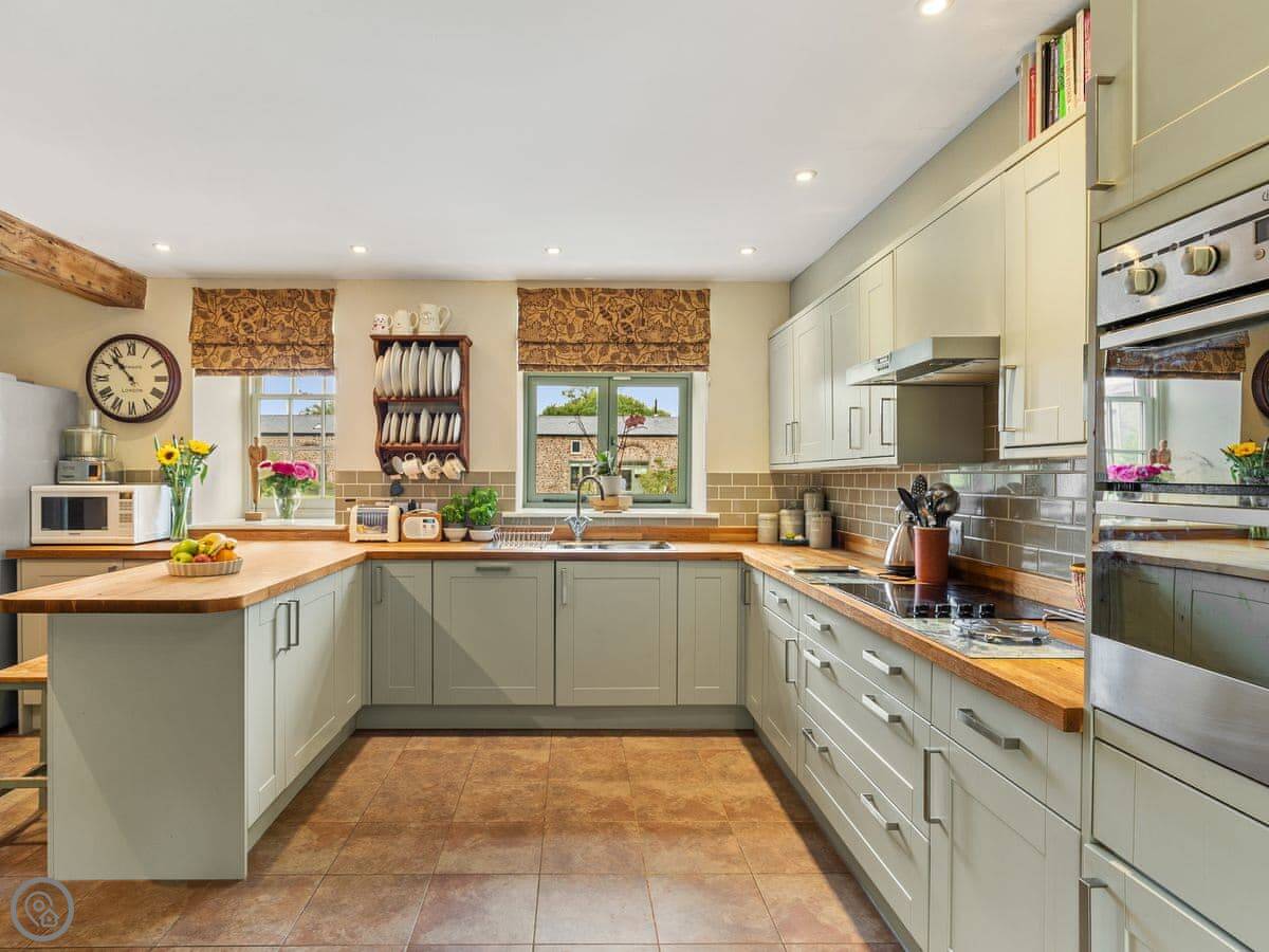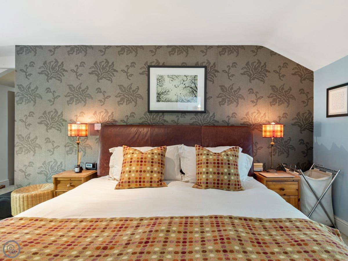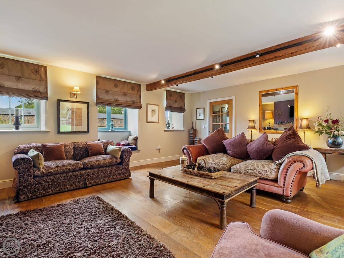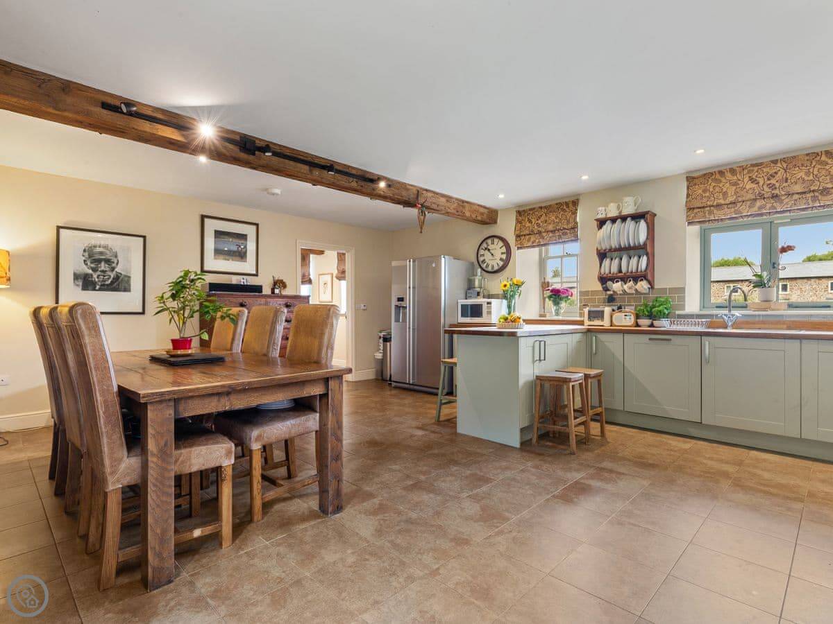 The large social open plan kitchen/dining space, along with the neighbouring sitting room, have doors out to the front of the property and make wonderfully welcoming entertainment spaces. The kitchen is finished in a lovely matt shaker style, which combines with the natural wood worktops to echo the property’s charming rural surroundings. The ground floor of the property is finished in a mixture of tiles and solid oak flooring that covers an underfloor heating system. With the feature hearth and Chesney wood burner, the room offers all year-round escape and relaxation. The thick walls allow peace, quiet and a fabulous place to kick back and relax.