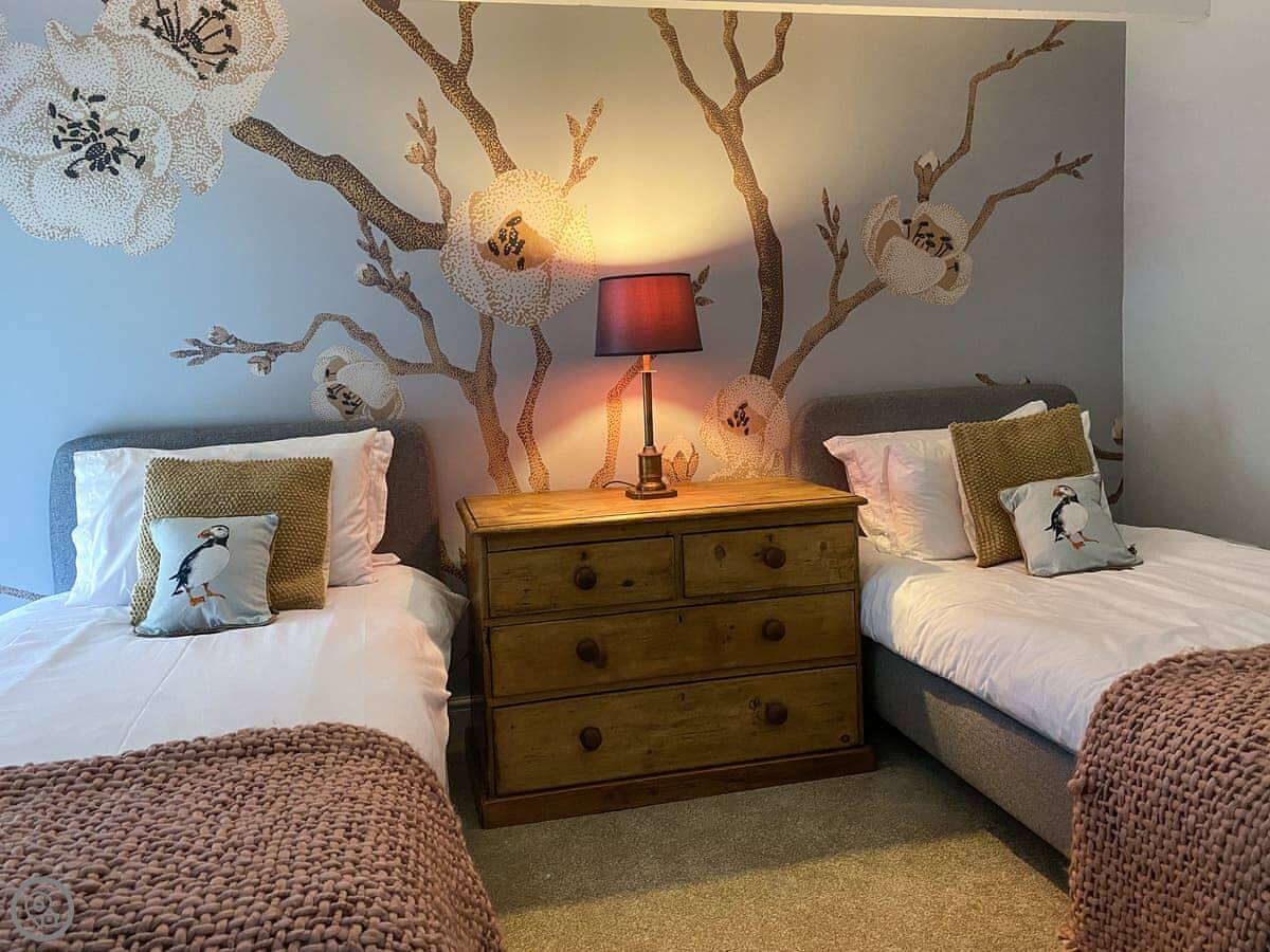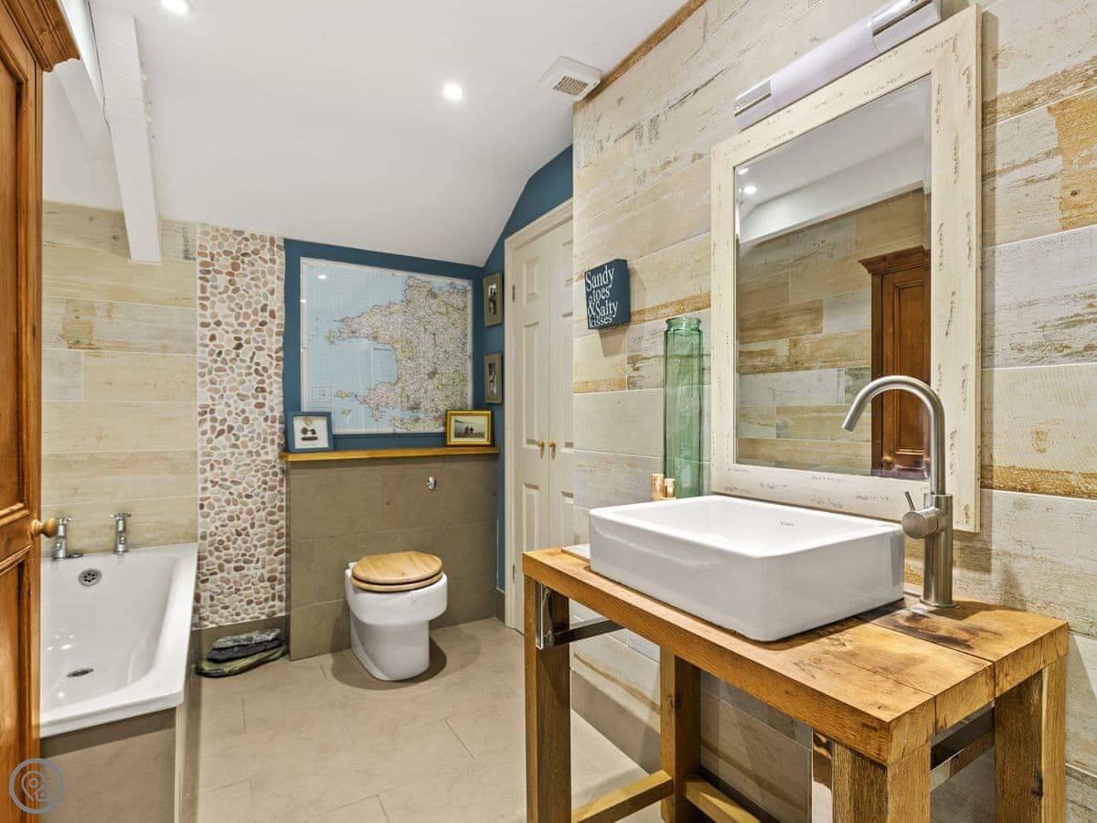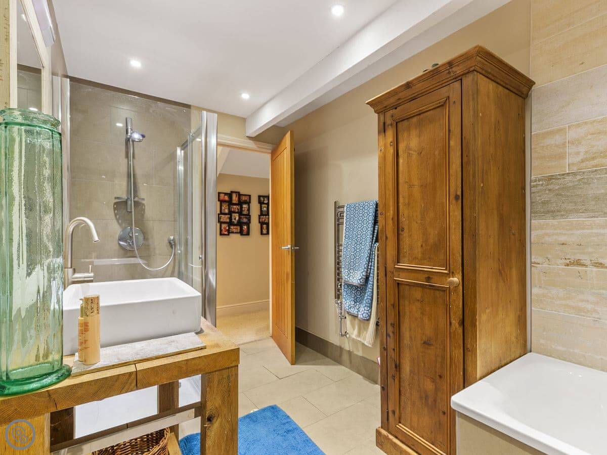 On the first floor are three superbly presented double bedrooms, and a large family bathroom. The family bathroom boasts a bath and separate shower, toilet and basin. The master bedroom has ample wardrobe and storage space with windows to each side and super kingsize bed with luxury en-suite. Second has twin beds, and the third has a double -so great for two families sharing or different generations of your family . With built in wardrobe.