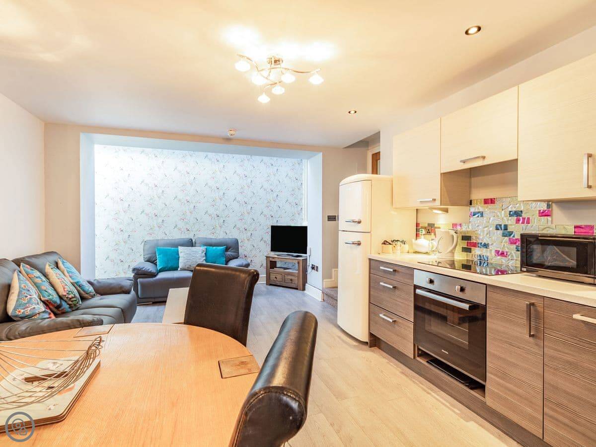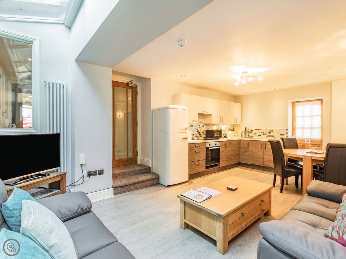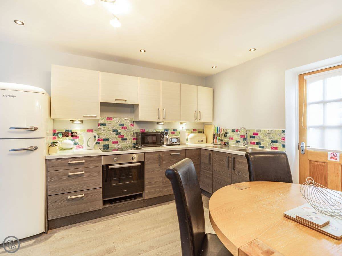 Goldcrest is the largest of the apartments at Easedale House, ideal for families or two couples who want to get away together – your dogs/pets are welcome here too. The master bedroom is very large with an en-suite, which includes a very smart, and huge, walk-in shower with one-way glass. The generous second bedroom has a built-in wardrobe and features zip and link beds that can be converted to a super kingsize bed. You also have sole access to the fully enclosed courtyard; great for those who want to be able to sit outside with a glass of wine – and even a barbecue in fine weather. Skylights over the open-plan living area give a light feeling even on the cloudiest Cumbrian day!