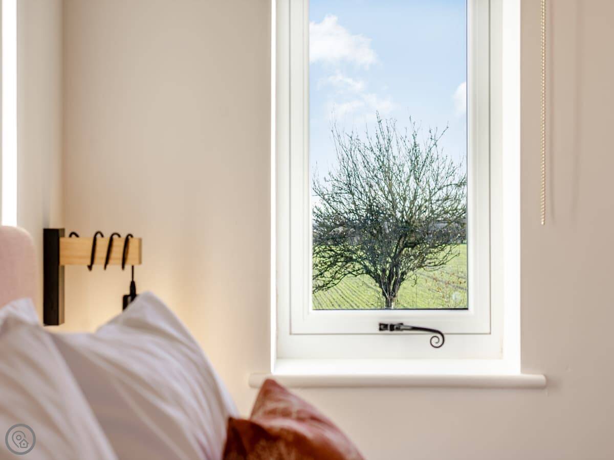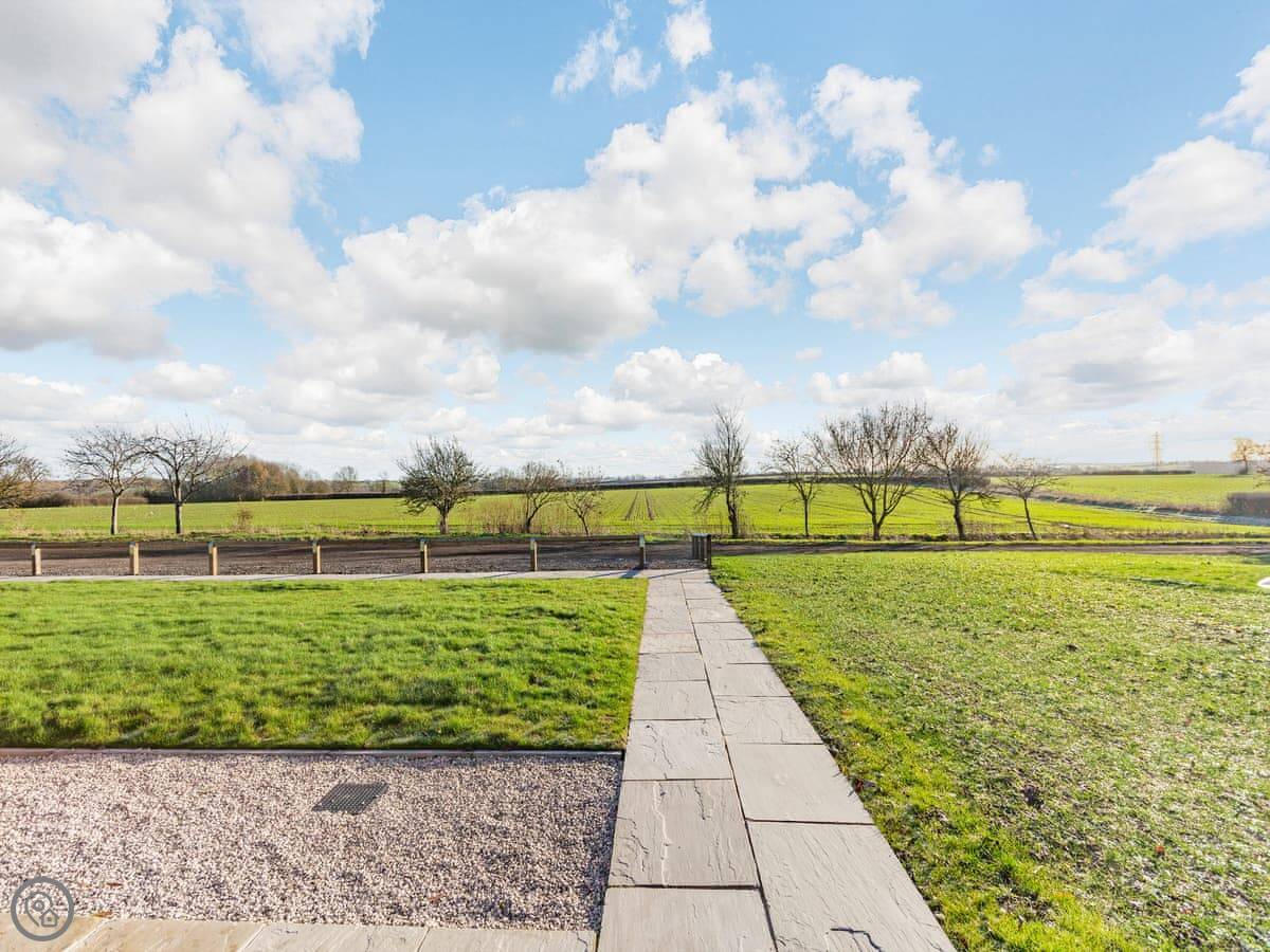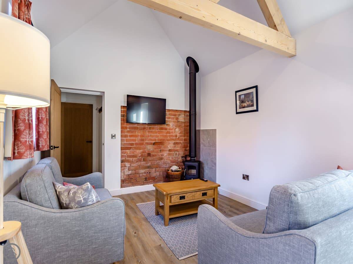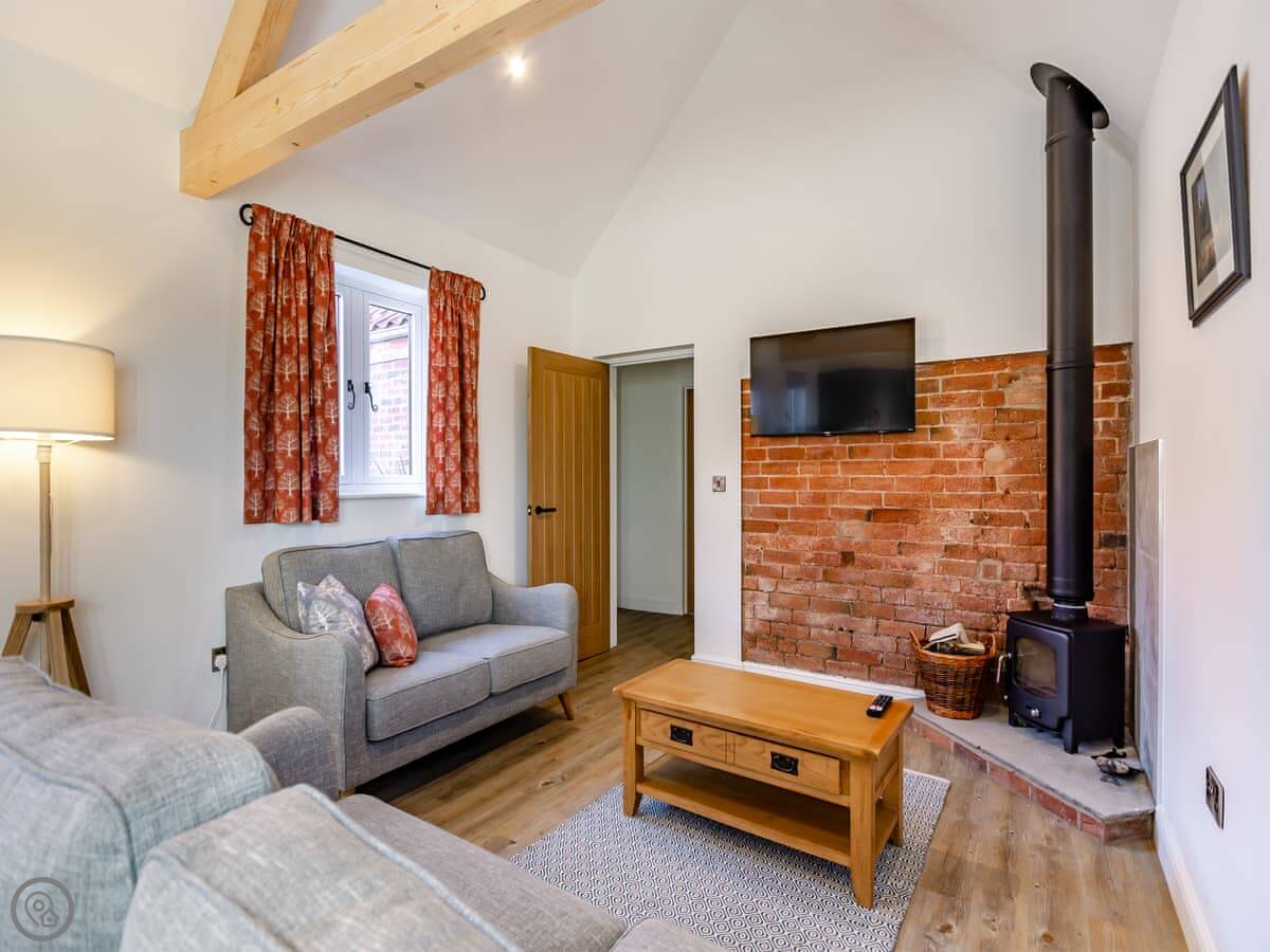 It's warm and open plan. There's a wood burner for winter evenings. You get your own patio area with a table and chairs, which looks out over the fields.