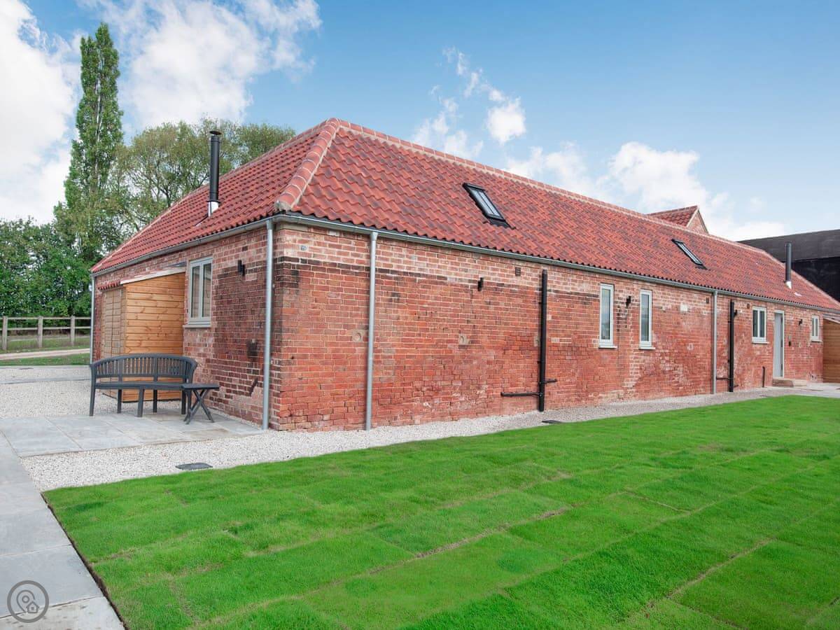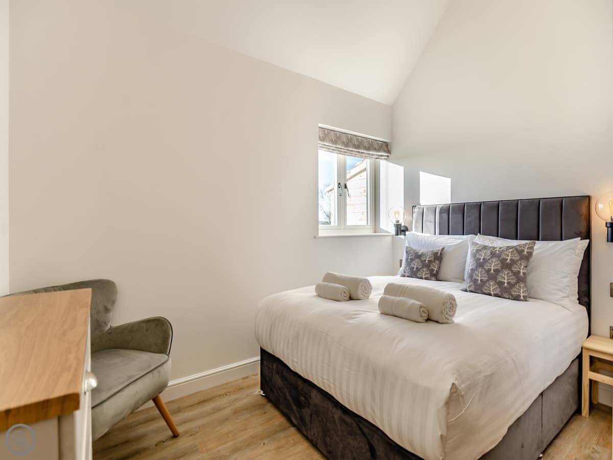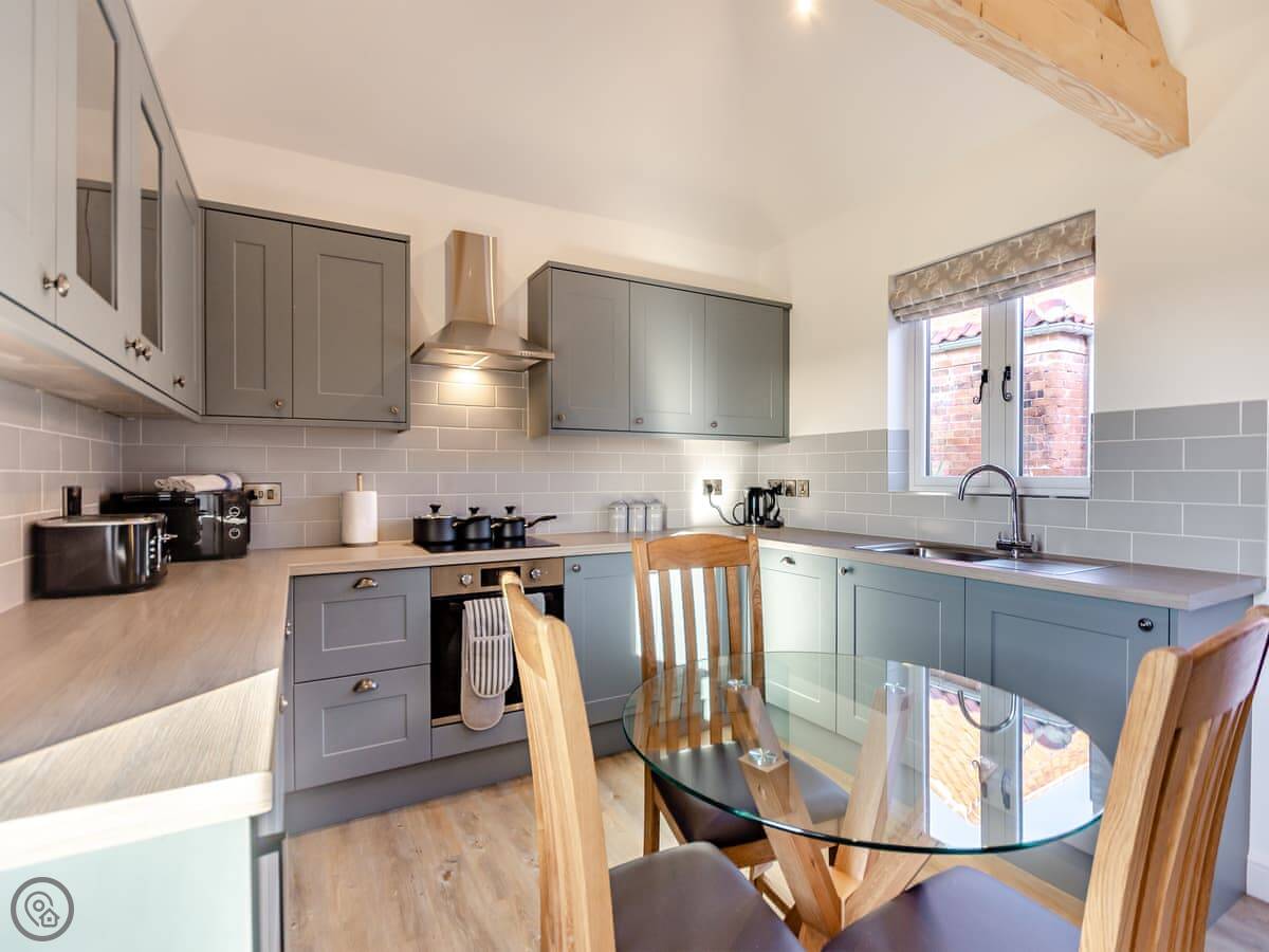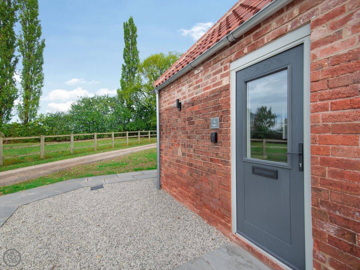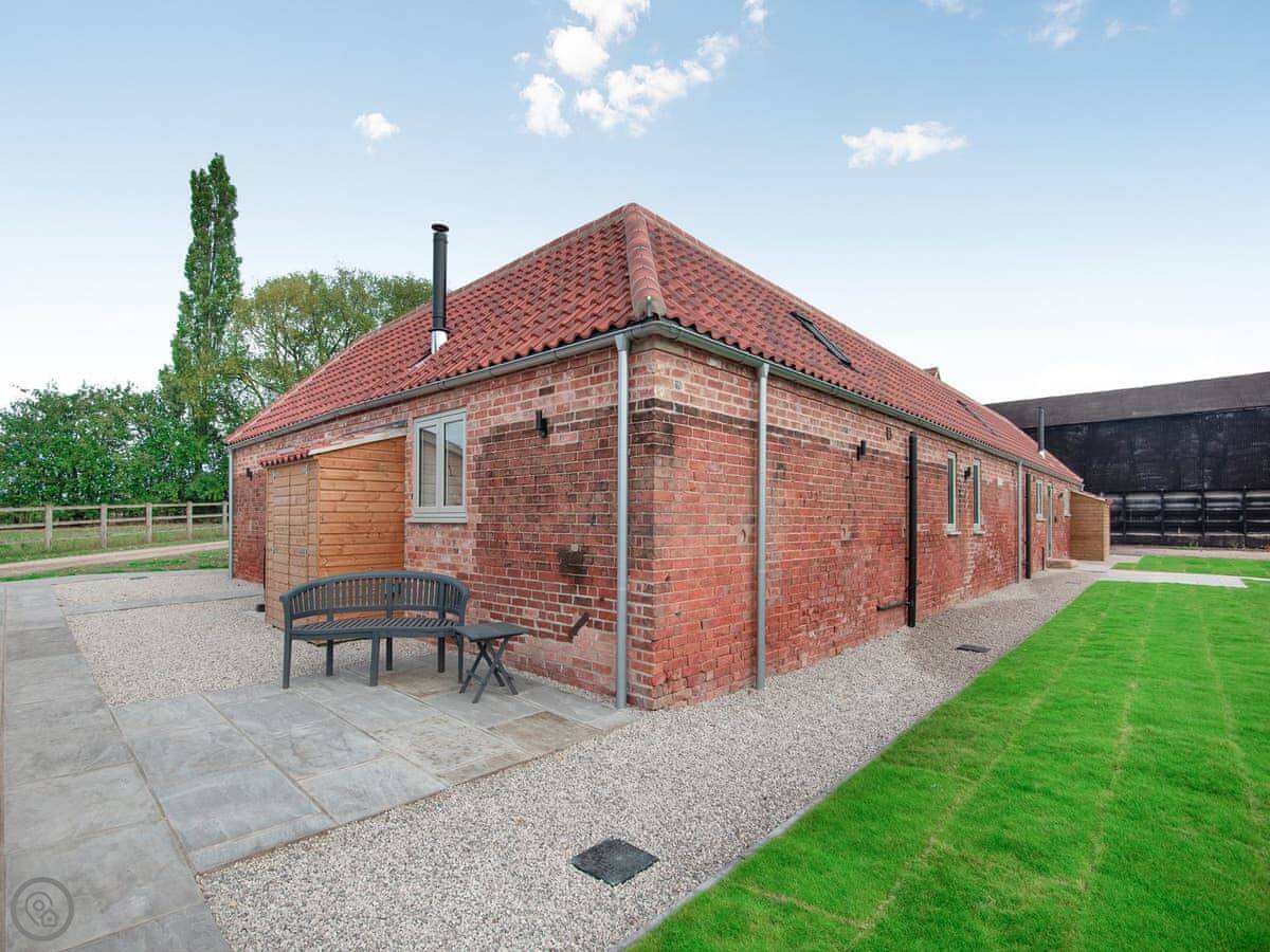 It's warm and open plan. There's a wood burner for winter evenings. You get your own patio area with a table and chairs, which looks out over the fields.