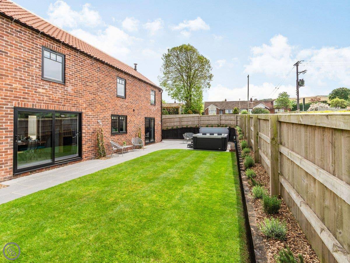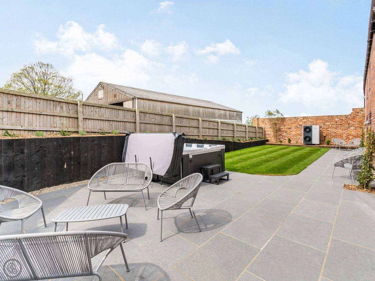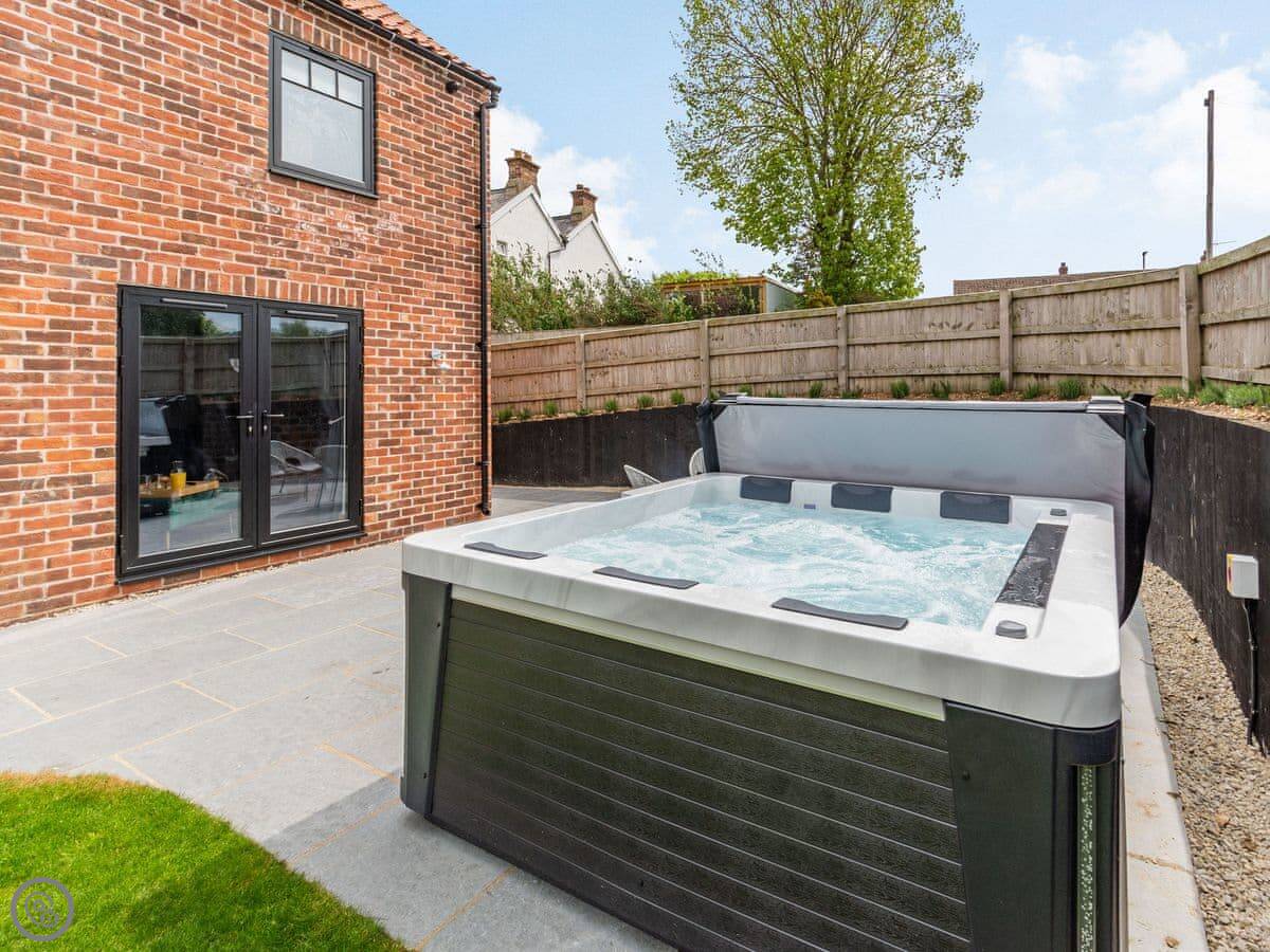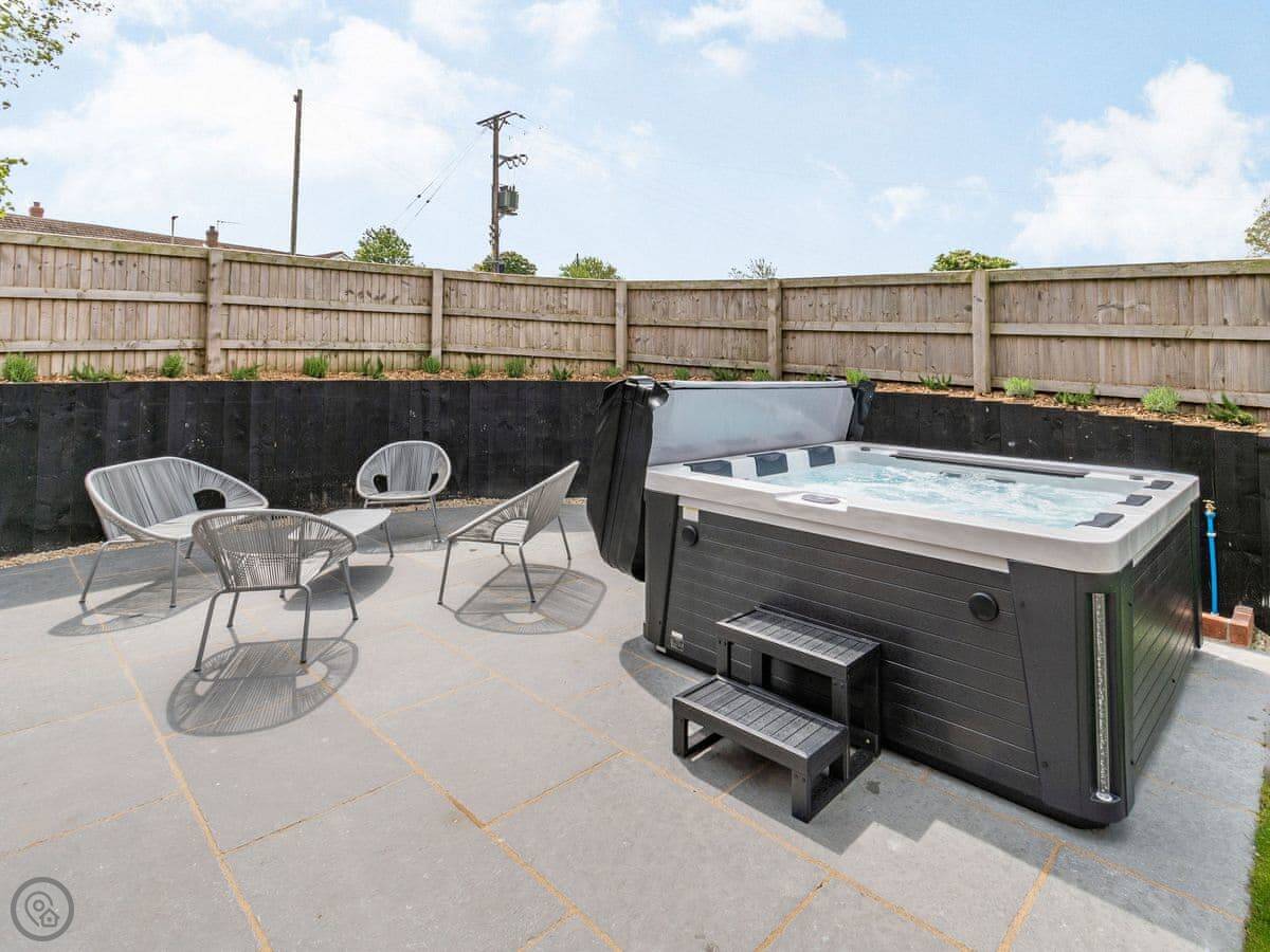 Outside, the garden is enclosed. There's a hot tub out there. You'll want a dressing gown for that.