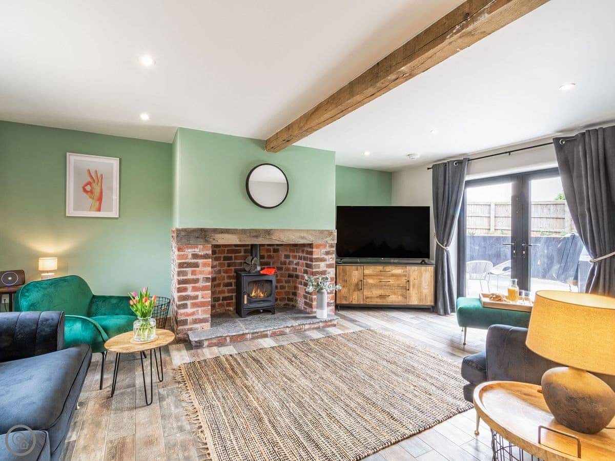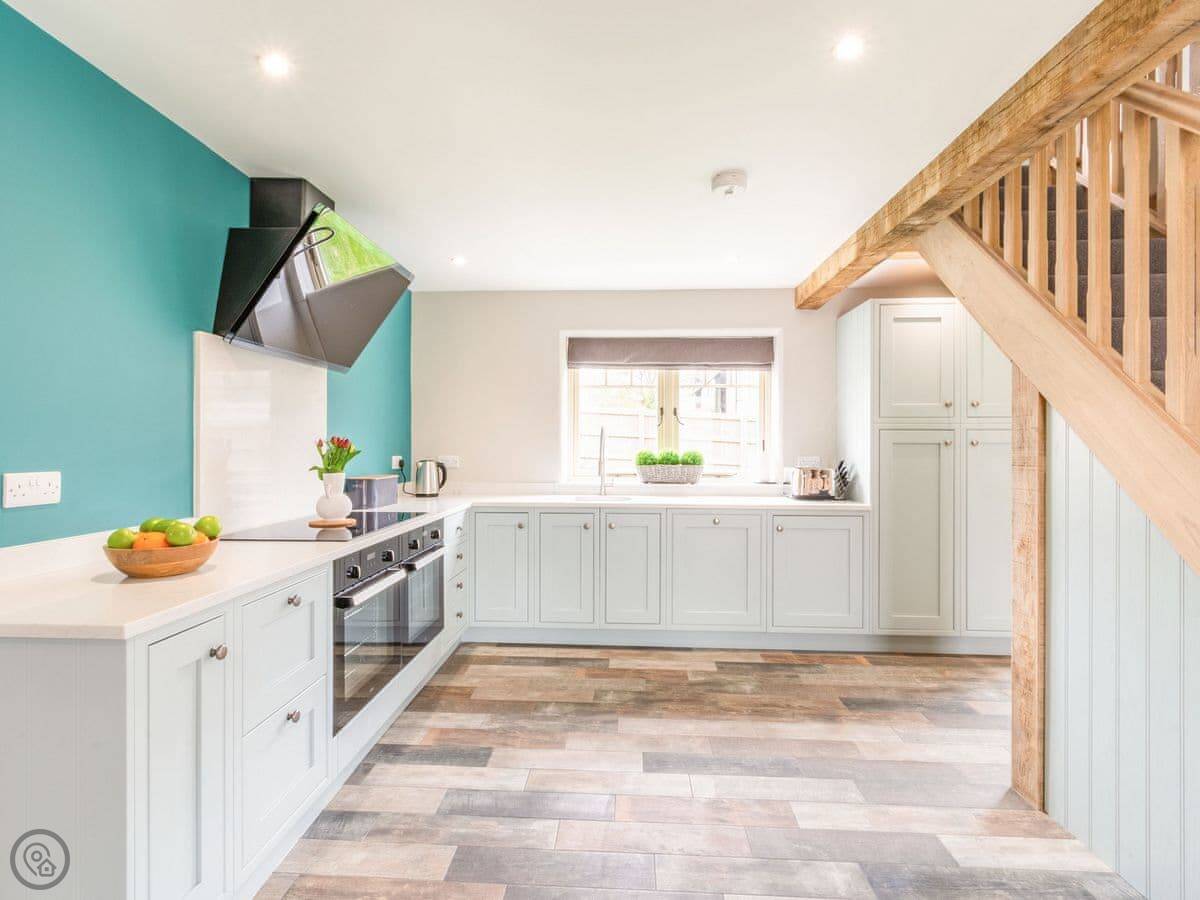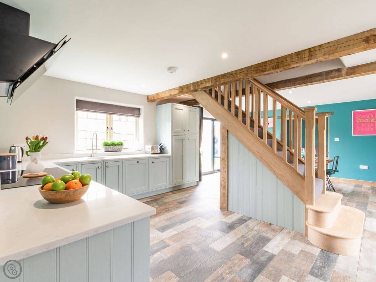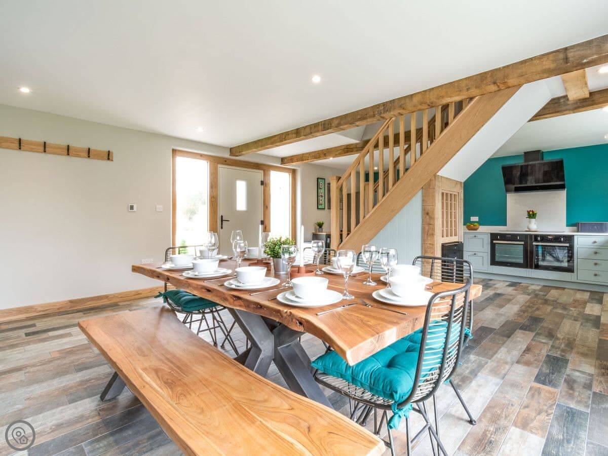 Downstairs is all open plan, which works well when there's a few of you. The table seats ten. There's a wood burner and a separate snug room if you need to get away for a bit. The kitchen has a double oven. Heating is underfloor, so it's warm.