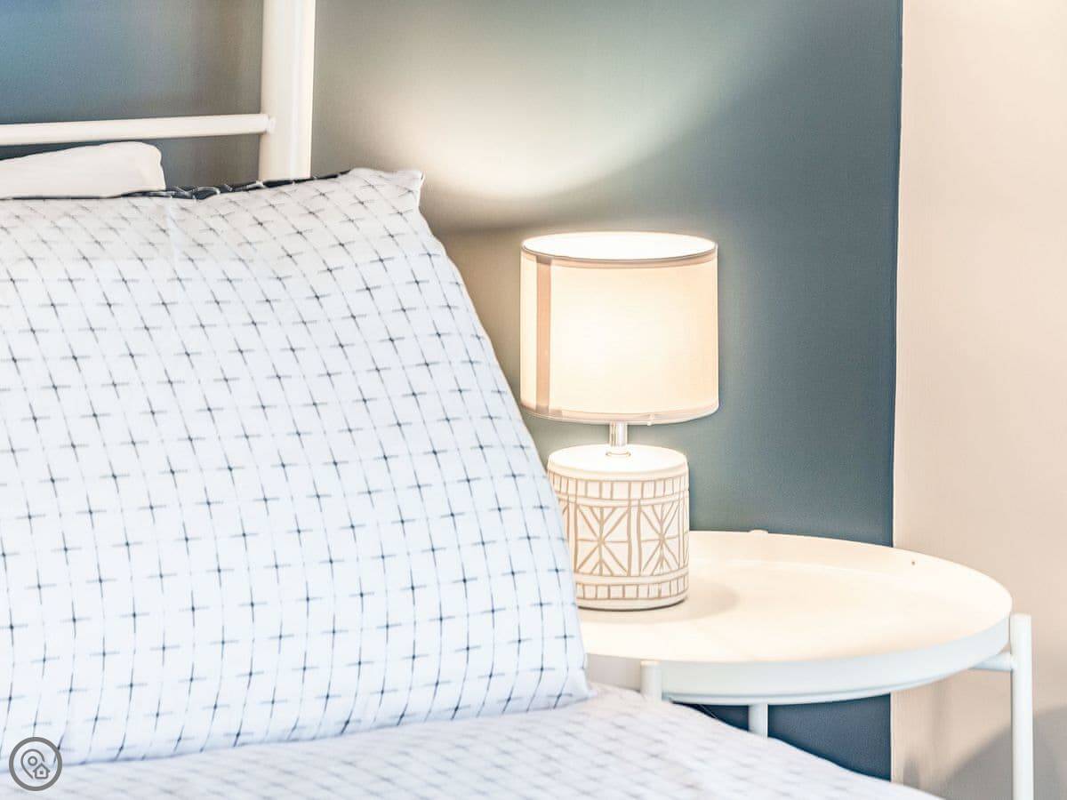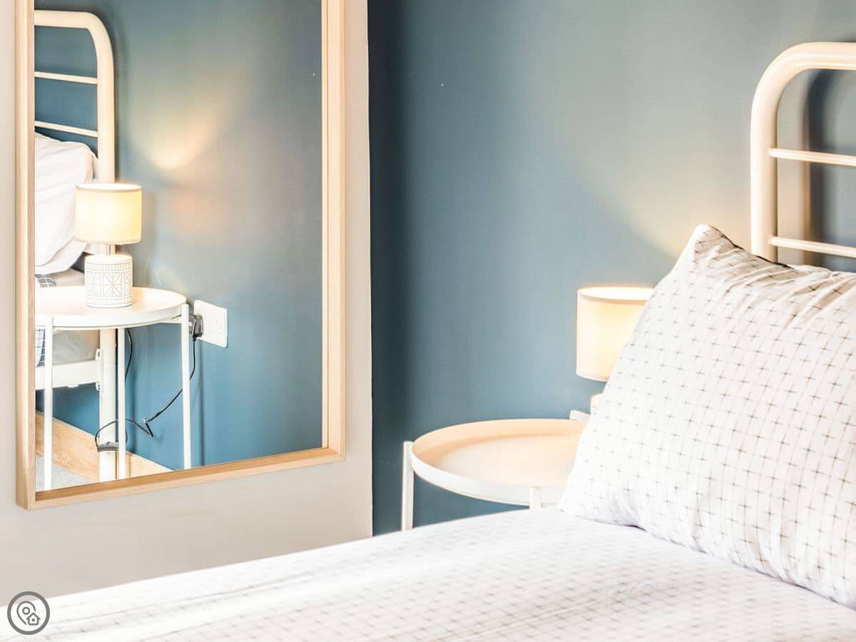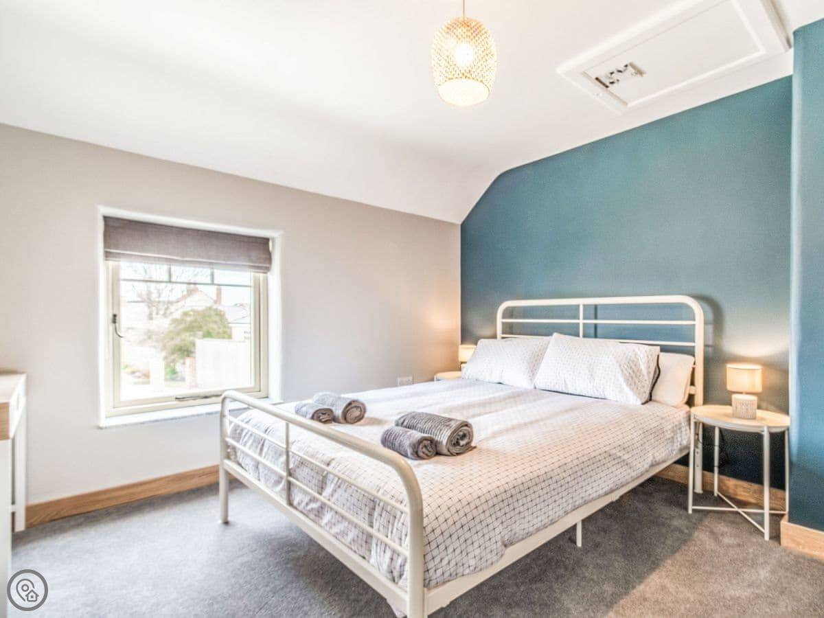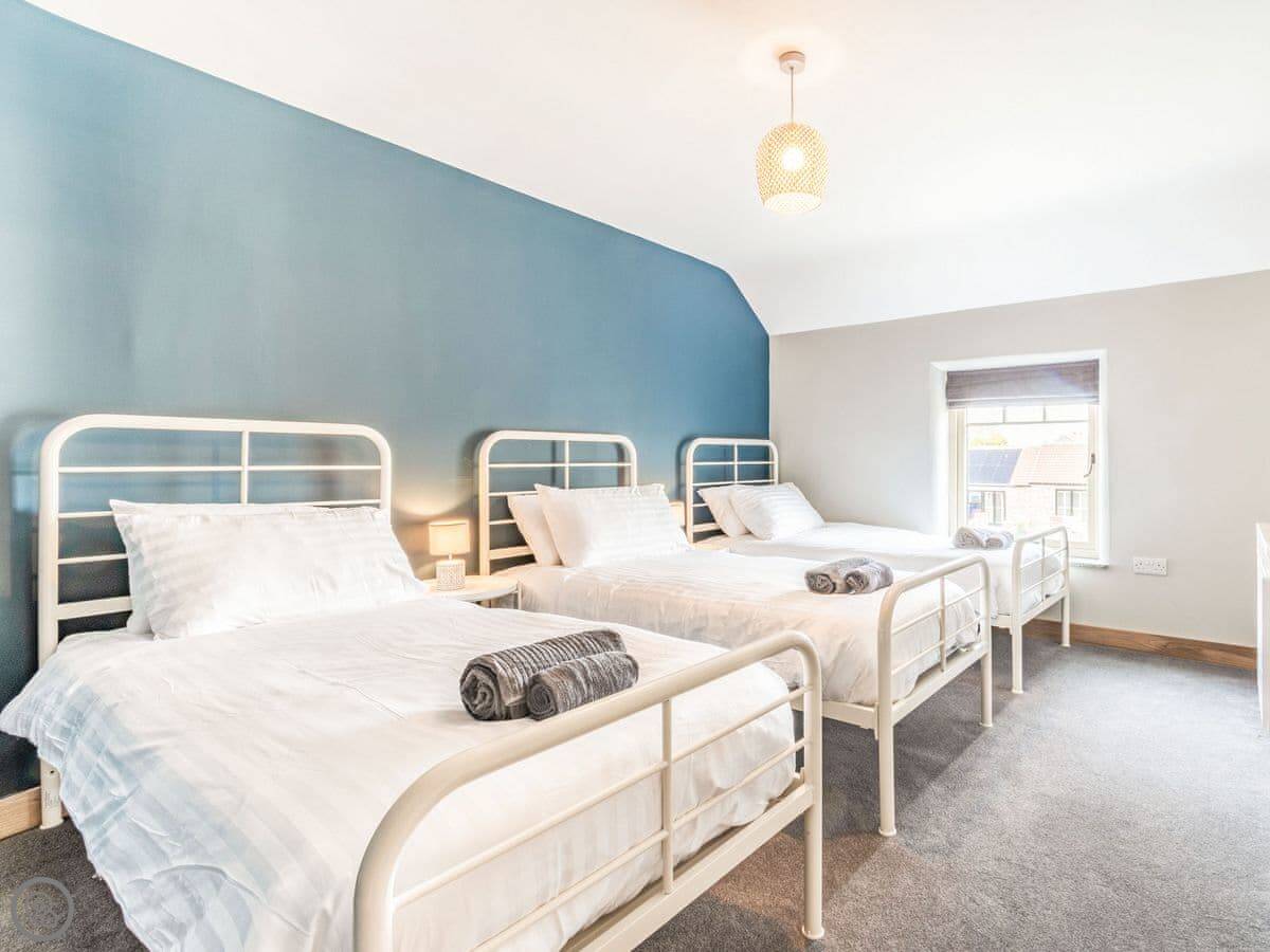 There are four bedrooms. Two of them have their own bathrooms, and there's another family bathroom with a bath. Three of the rooms have king size beds and the fourth has three singles.