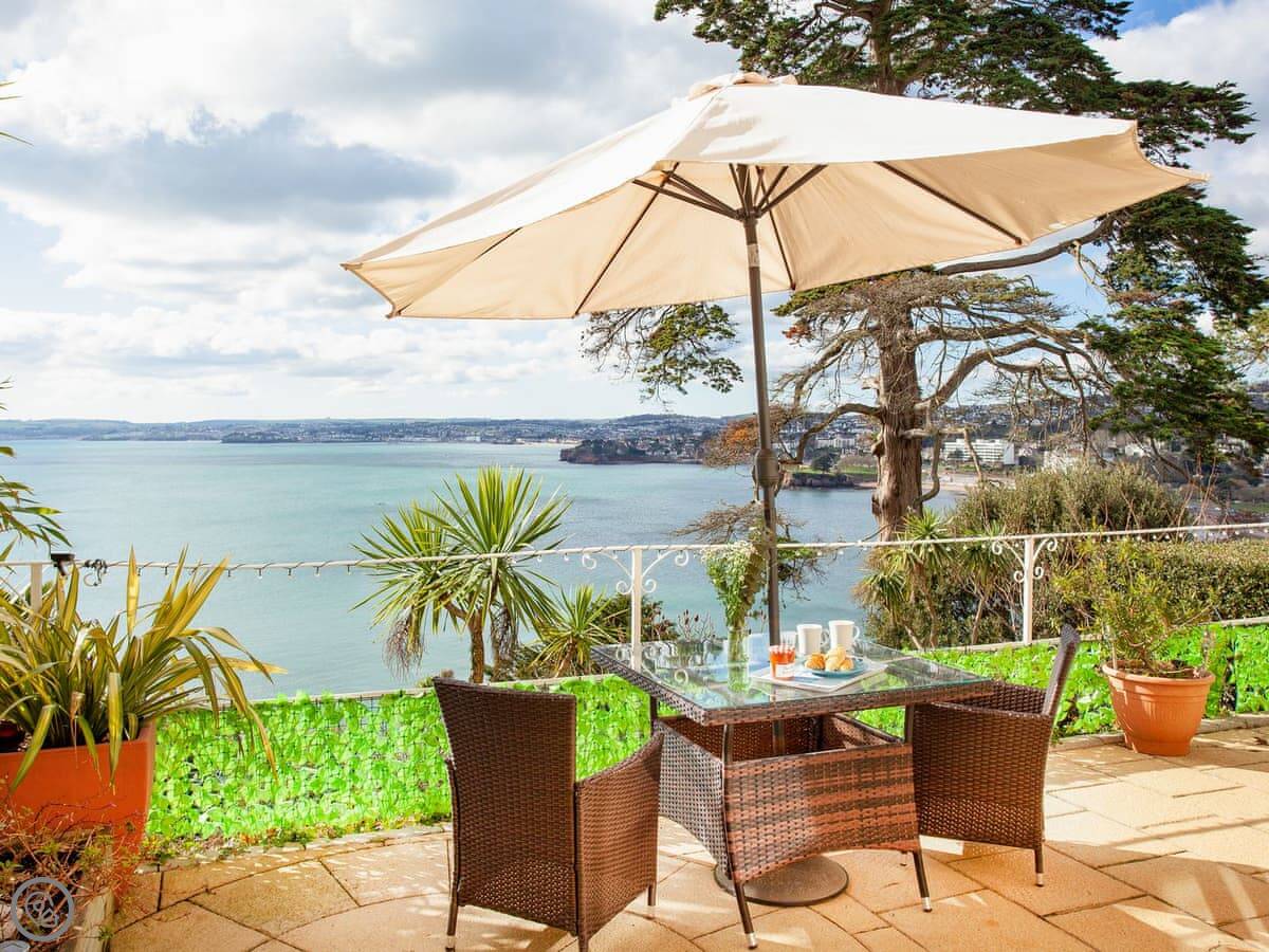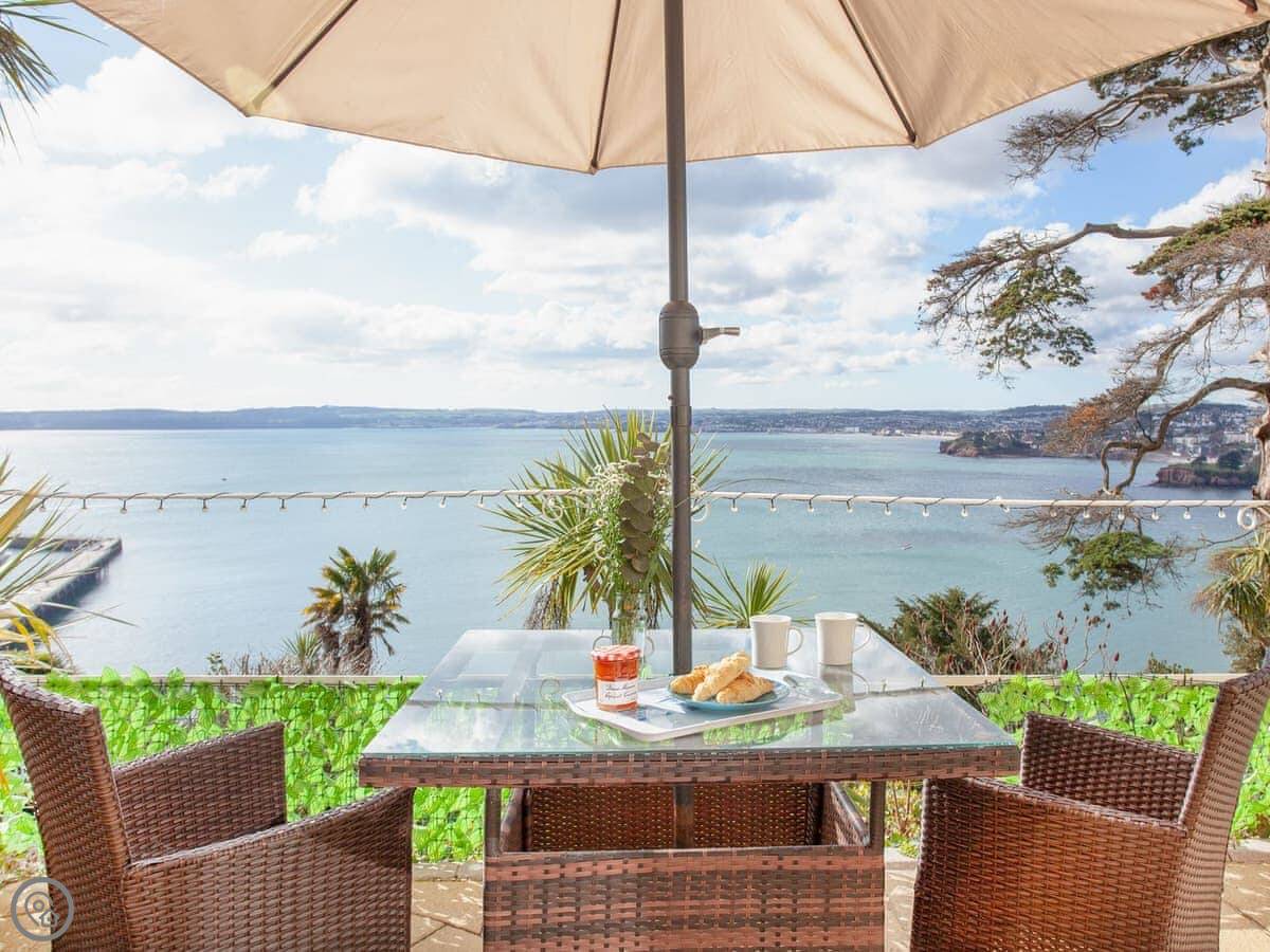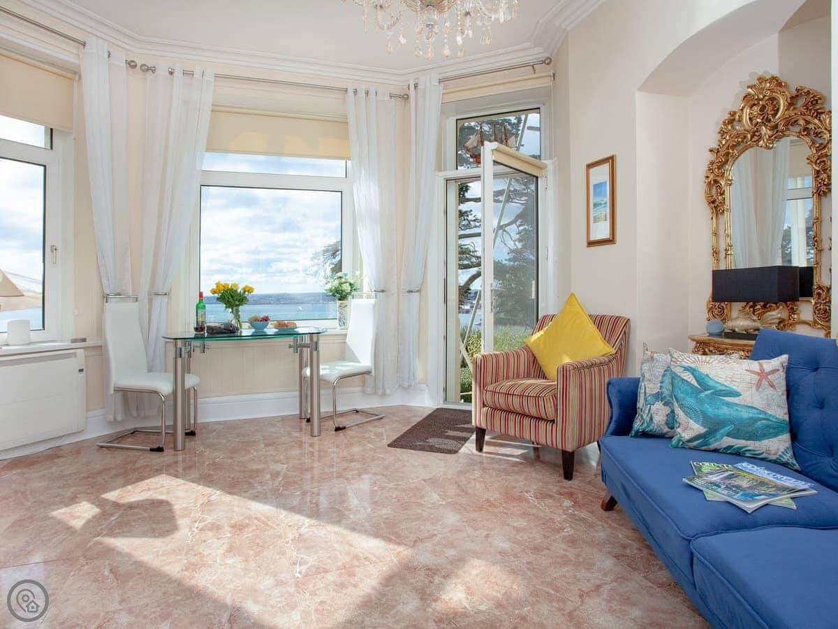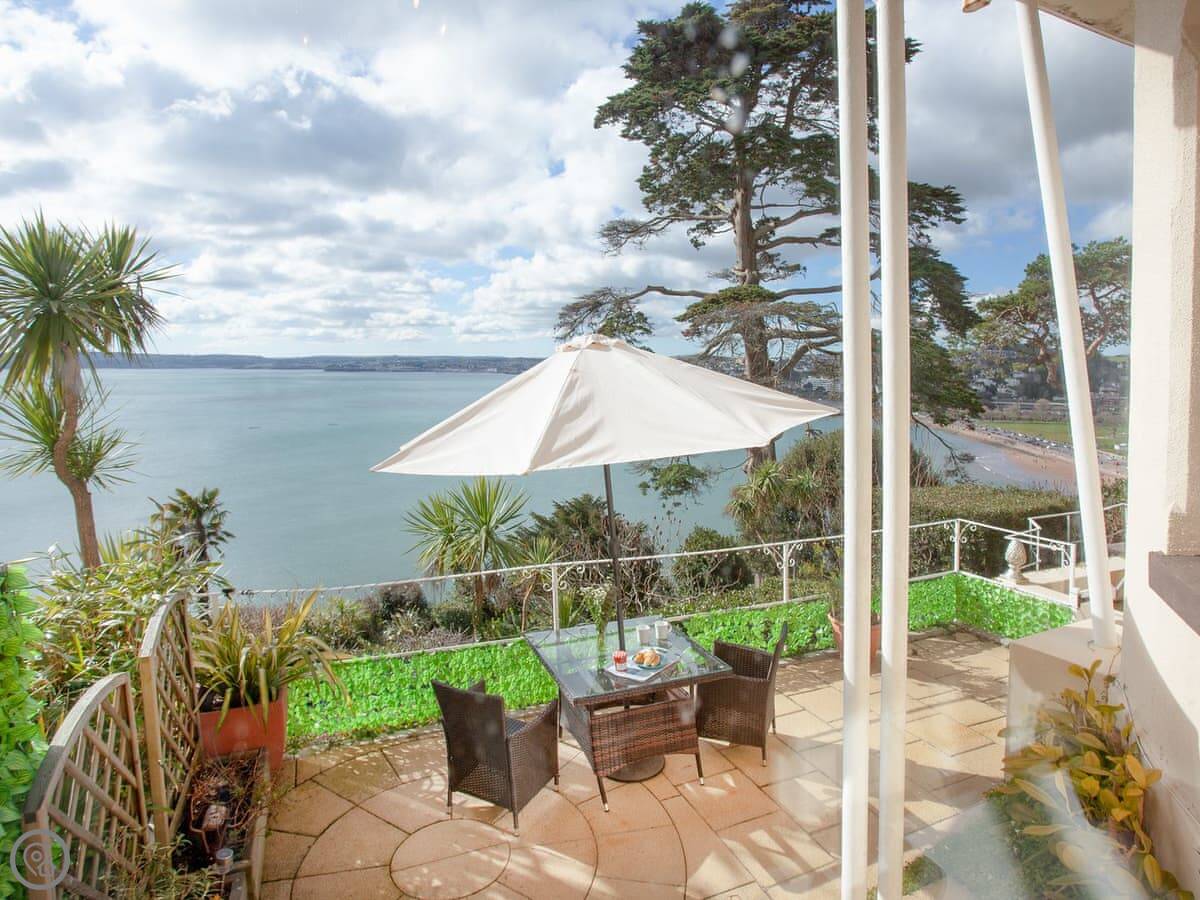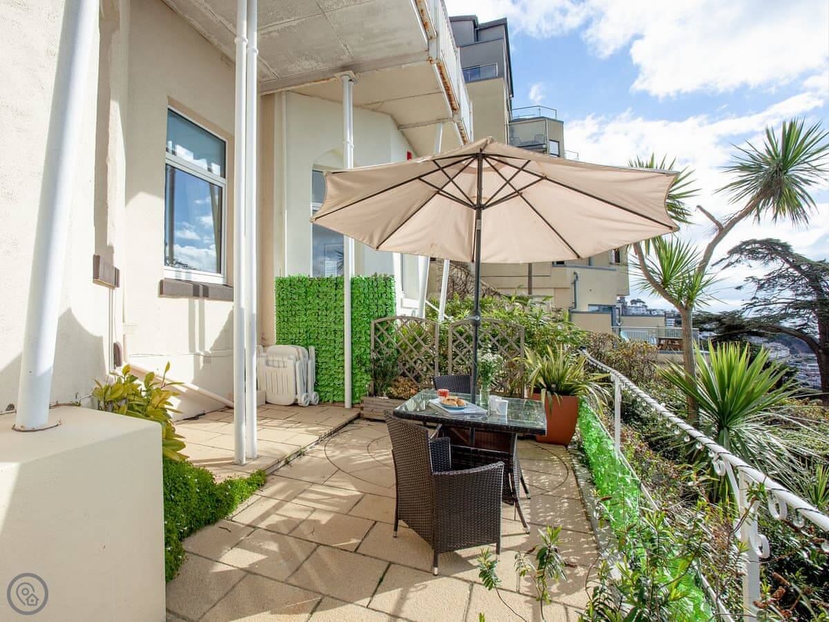 Riviera View is a renovated apartment in the Bay Fort Mansions apartment block overlooking Torquay seafront. With unrivalled views, this one bedroom apartment is bright and airy, especially from the open-plan living space, as well as the separate bedroom as these rooms all face the front of the property and out to sea. The living area is very comfortable and the kitchen area is fully equipped with all you could need. The dining table and chairs look out of the large bay windows where you can relax watching the world go by. There is a door from the living area leading outside and down some steps to the large terrace/balcony area overlooking the well kept communal ’sub-tropical’ gardens, a wonderful space for sitting out in and enjoying the sun. The bedroom boasts a super kingsize bed and plenty of clothes storage, and the family bathroom has a bath as well as a shower above. With the stunning outlook from Riviera View, it is also perfectly situated for guests wanting to explore the local area. Just a short walk downhill is the stretch of seafront with the town’s most popular restaurants/bars, the beach, large nearby green, marina, Princess Theatre, golf course and arcades. Here, everything is on your doorstep.