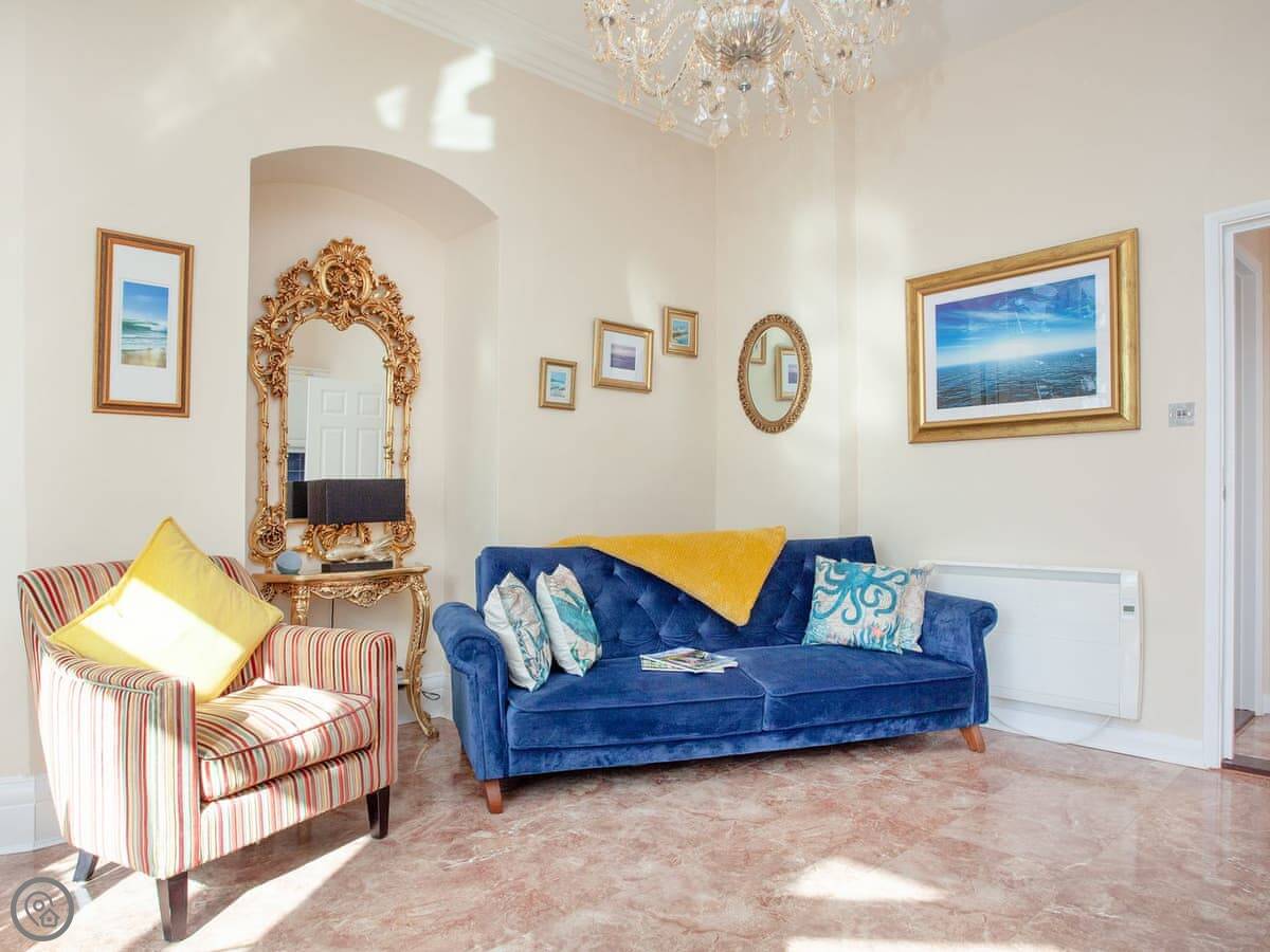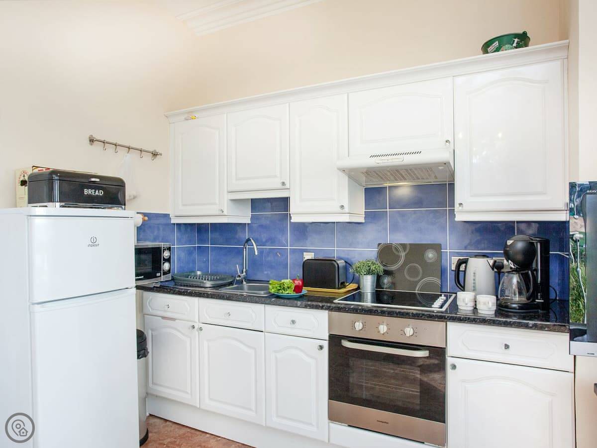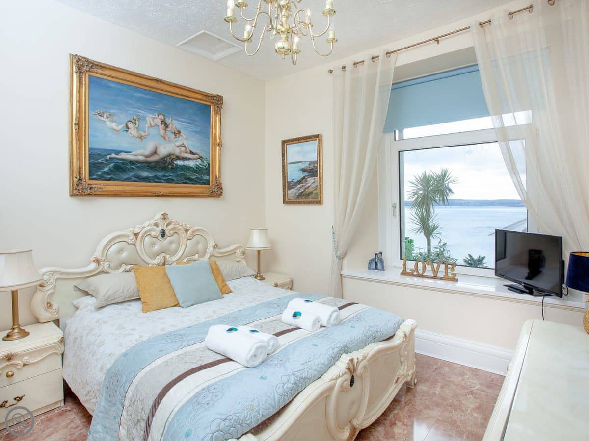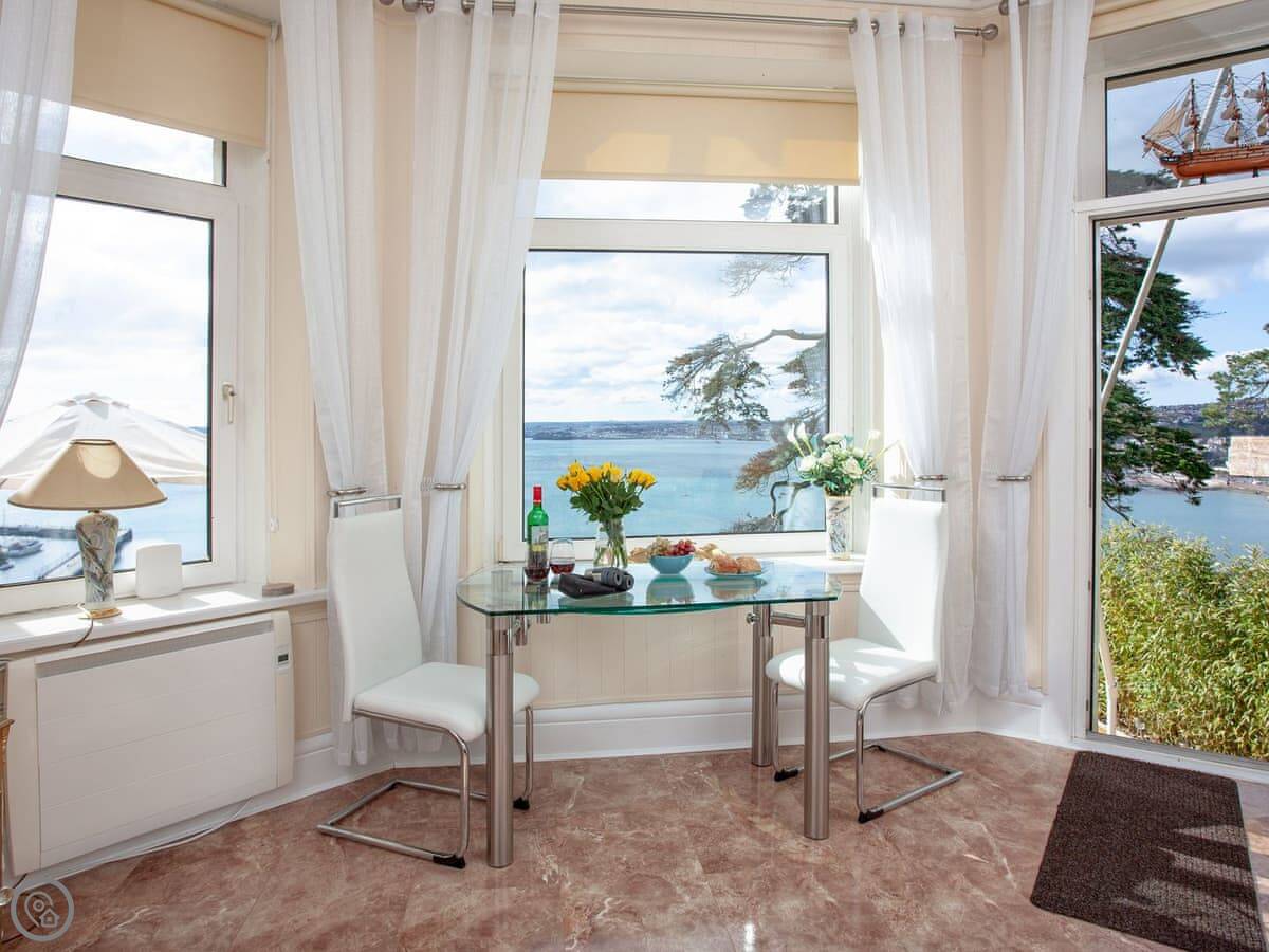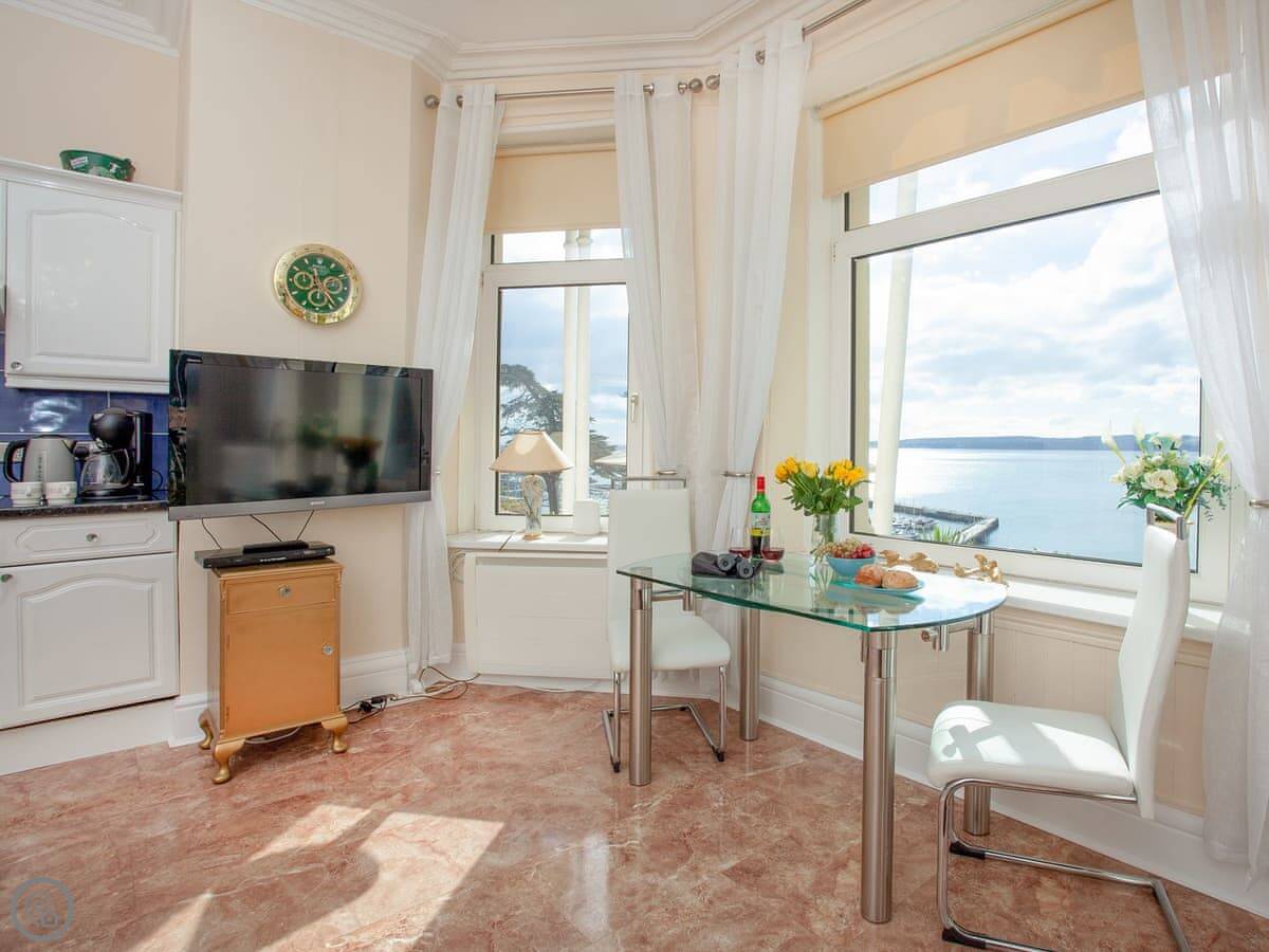 Riviera View is a renovated apartment in the Bay Fort Mansions apartment block overlooking Torquay seafront. With unrivalled views, this one bedroom apartment is bright and airy, especially from the open-plan living space, as well as the separate bedroom as these rooms all face the front of the property and out to sea. The living area is very comfortable and the kitchen area is fully equipped with all you could need. The dining table and chairs look out of the large bay windows where you can relax watching the world go by. There is a door from the living area leading outside and down some steps to the large terrace/balcony area overlooking the well kept communal ’sub-tropical’ gardens, a wonderful space for sitting out in and enjoying the sun. The bedroom boasts a super kingsize bed and plenty of clothes storage, and the family bathroom has a bath as well as a shower above. With the stunning outlook from Riviera View, it is also perfectly situated for guests wanting to explore the local area. Just a short walk downhill is the stretch of seafront with the town’s most popular restaurants/bars, the beach, large nearby green, marina, Princess Theatre, golf course and arcades. Here, everything is on your doorstep.