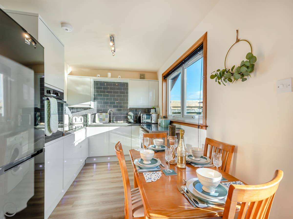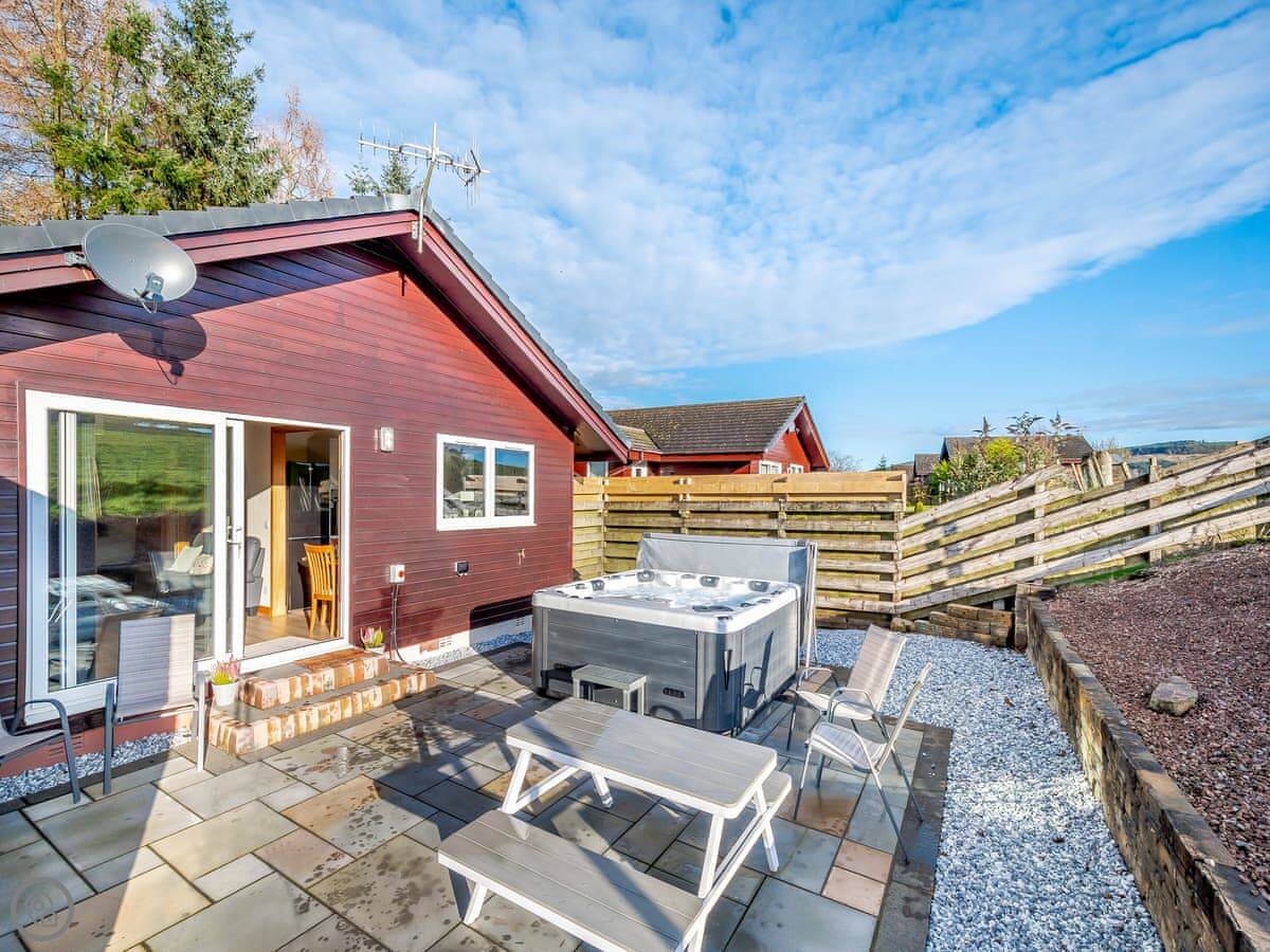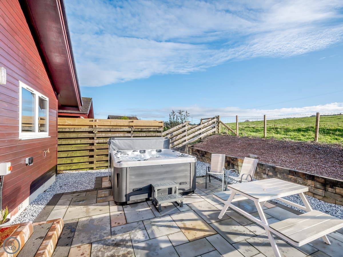 The place is open plan. There's a washing machine, dishwasher, and WiFi. Bedding and towels are included. Parking is right outside. There's a patio with a hot tub.