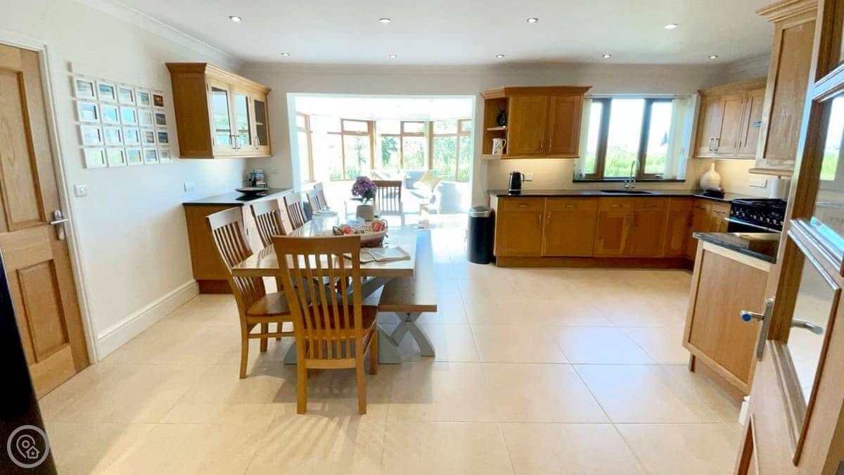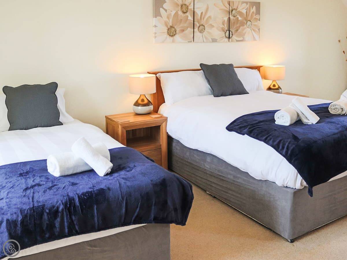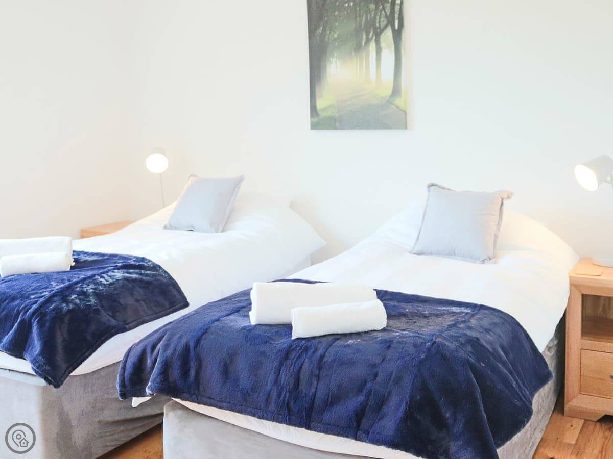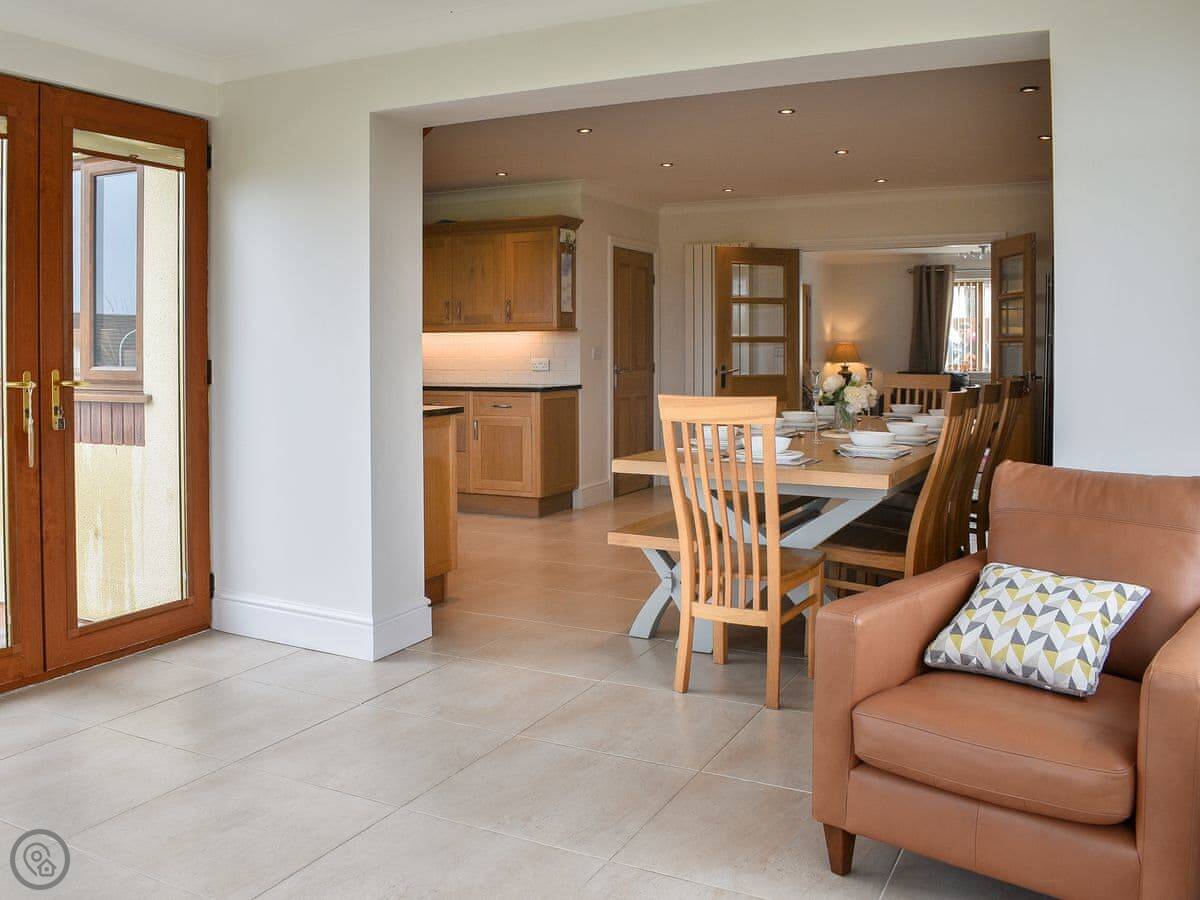 It sleeps ten people across five bedrooms. Three bathrooms, one on each floor. The kitchen is big which is good if a few of you are cooking. It has a 5 Star rating so everything is in good working order. You can bring two dogs.