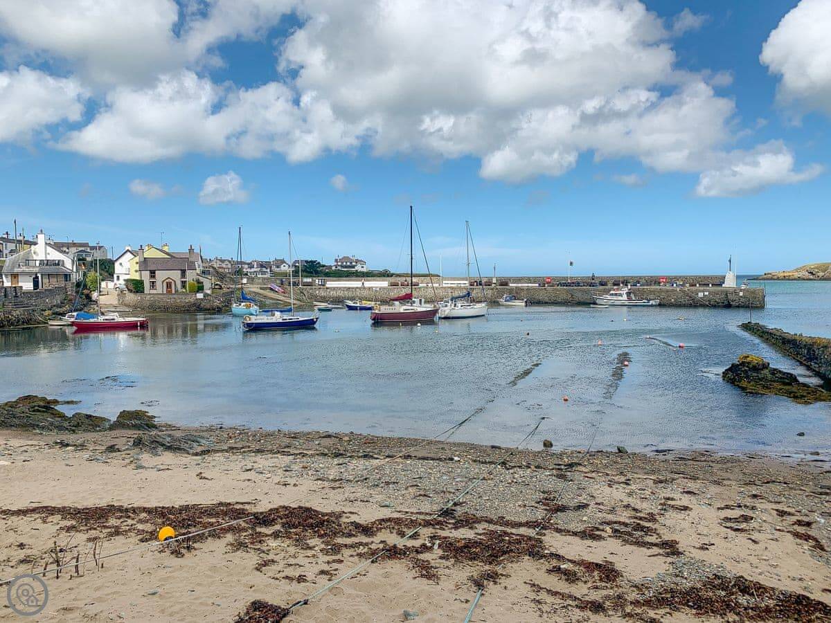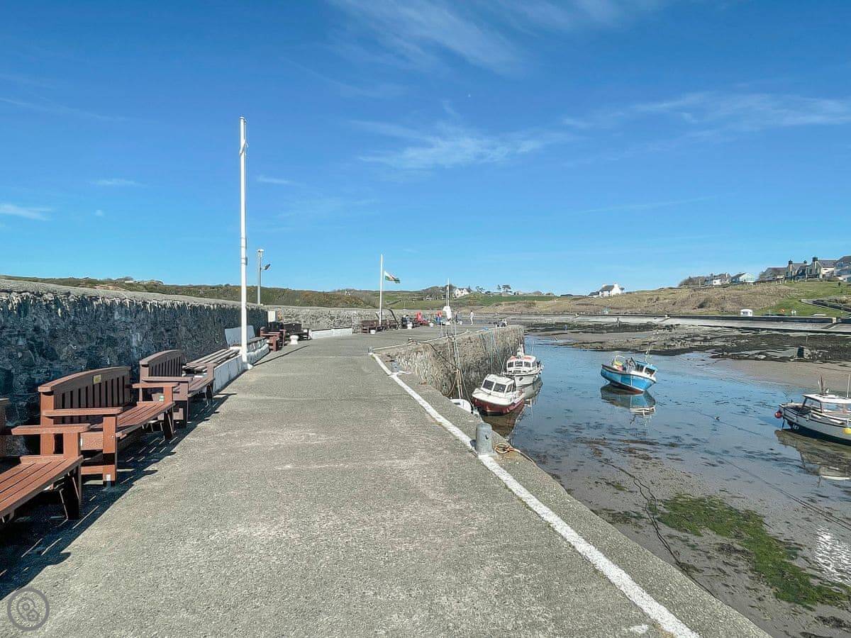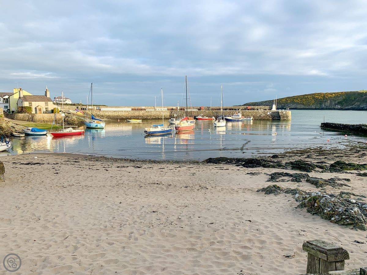 Cemaes itself is about a ten minute walk downhill. There's a couple of pubs that do food, a few shops for basics, and a nice little harbour. The coastal path runs right by it if you want a proper walk. The main beach in the bay is sand and shingle, good for a paddle. The walk to the bay takes you back up a hill, so it's a bit of a climb.