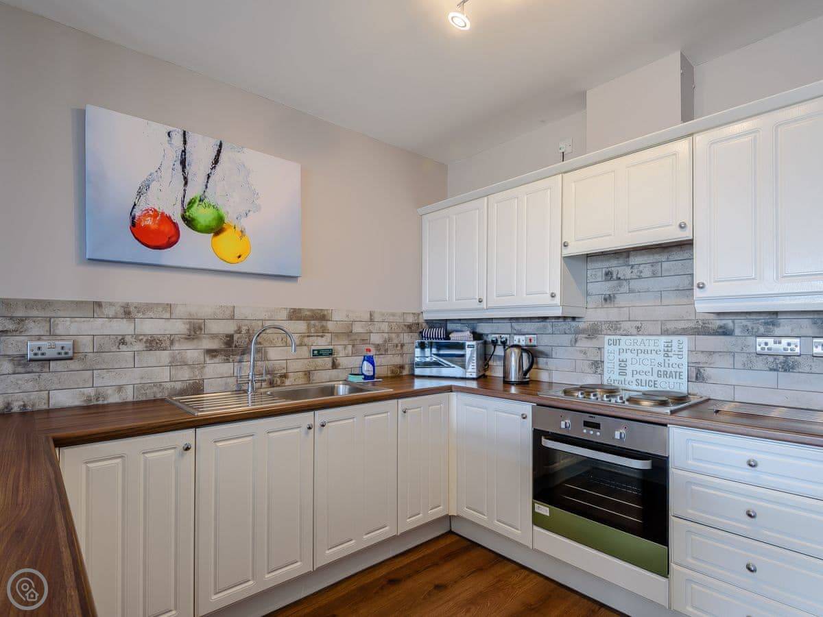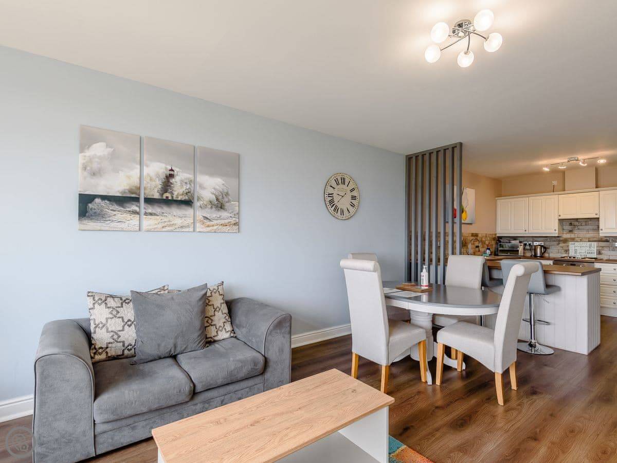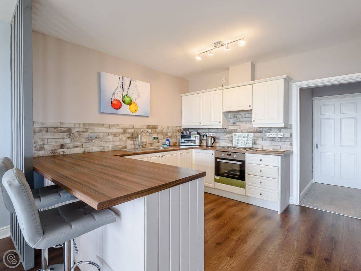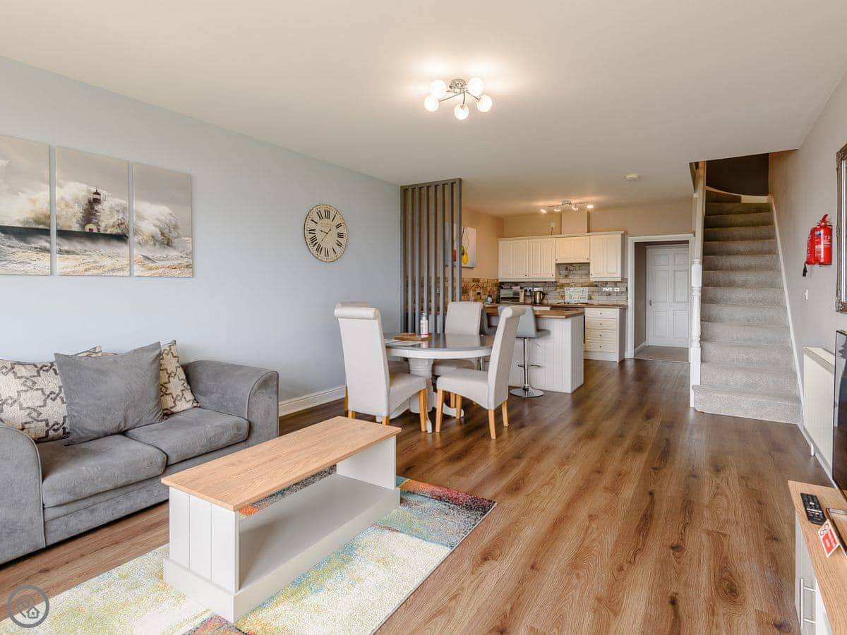 Inside, it's open plan downstairs. There's a TV, WiFi, and a washing machine. All bedding and towels are included. No pets.