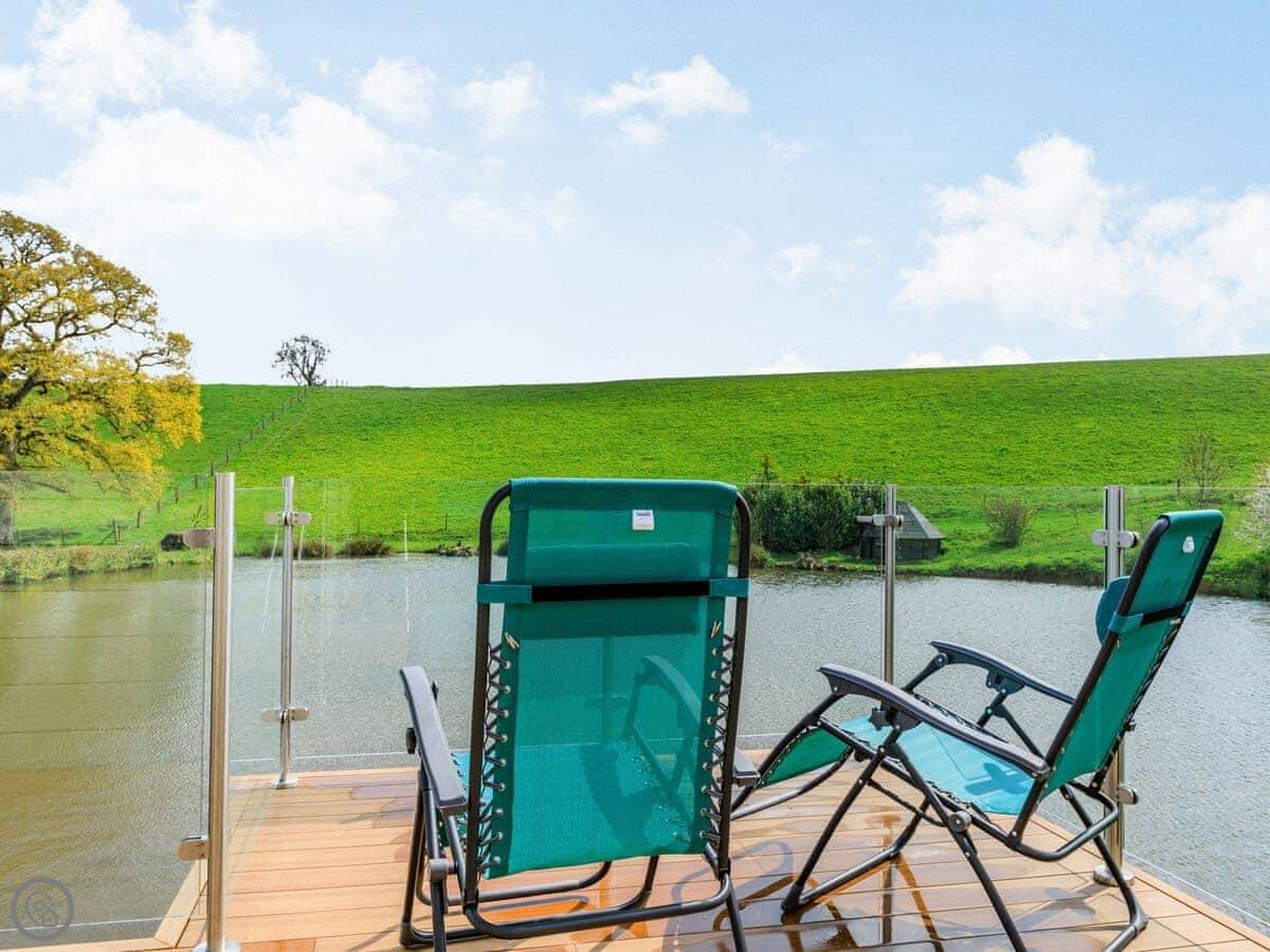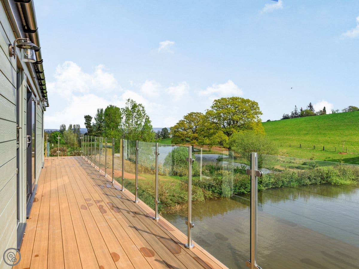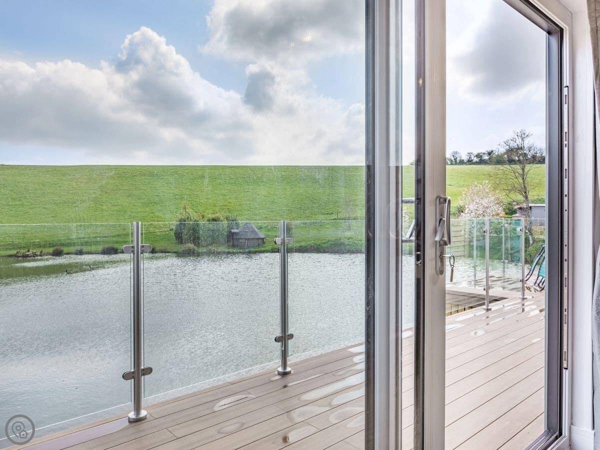 The main room is open plan. There's a kitchen area, a sofa, a wood burner and an electric fire for background heat. Outside, there's your own deck. It looks straight out onto the lake. There's a hot tub on the deck, table and chairs, and a barbecue.